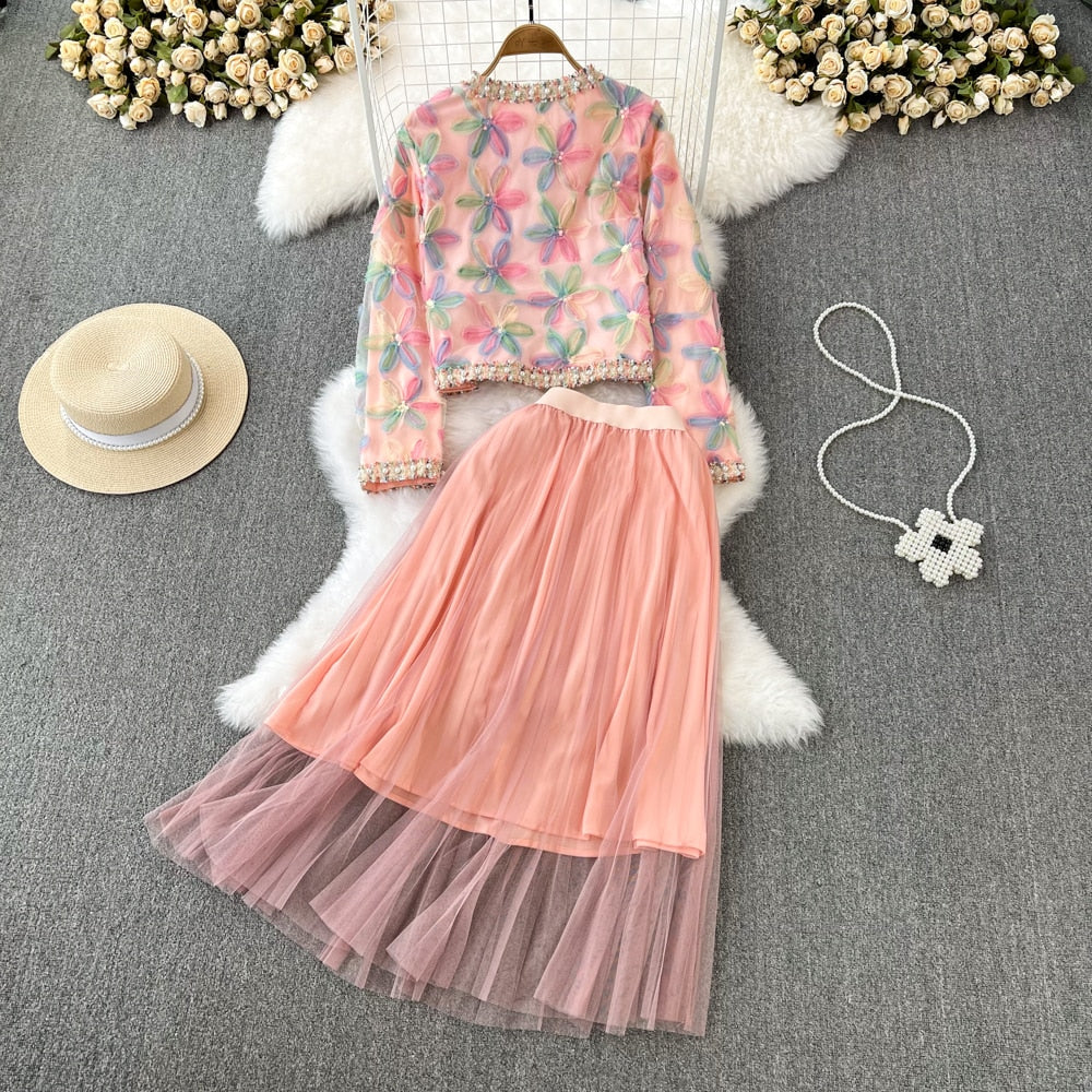 Znbbw Winter Skirt Suit Women Long Sleeve Single Breasted Tweet Beaded Coats High Waist Maxi Pleated Skirt Sweet 2 Piece Sets