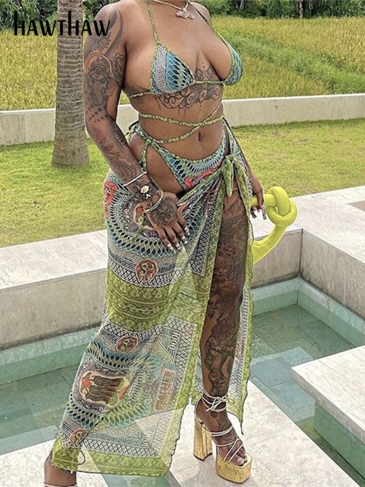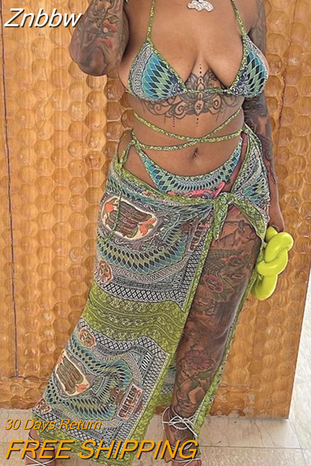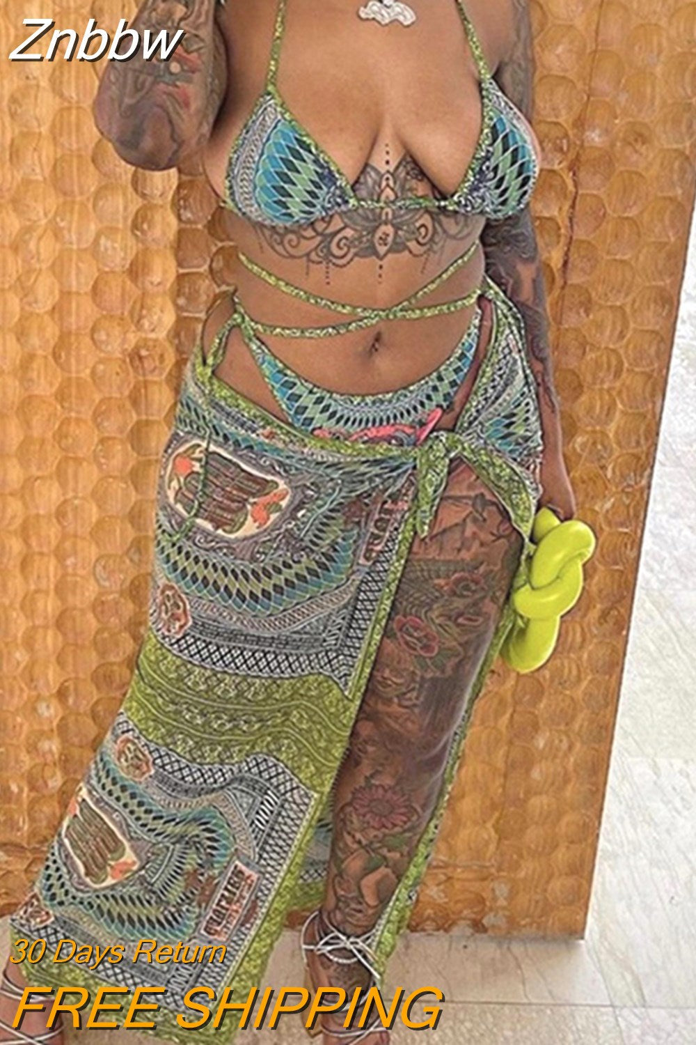 Znbbw Women 2023 Summer Mesh Sheer Bra Underwear Midi Skirt Beach Vacation Three Piece Matching Sets Outfit Wholesale Items