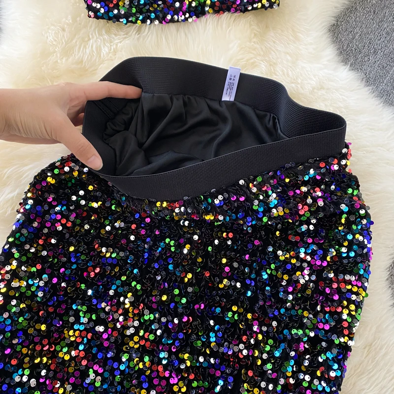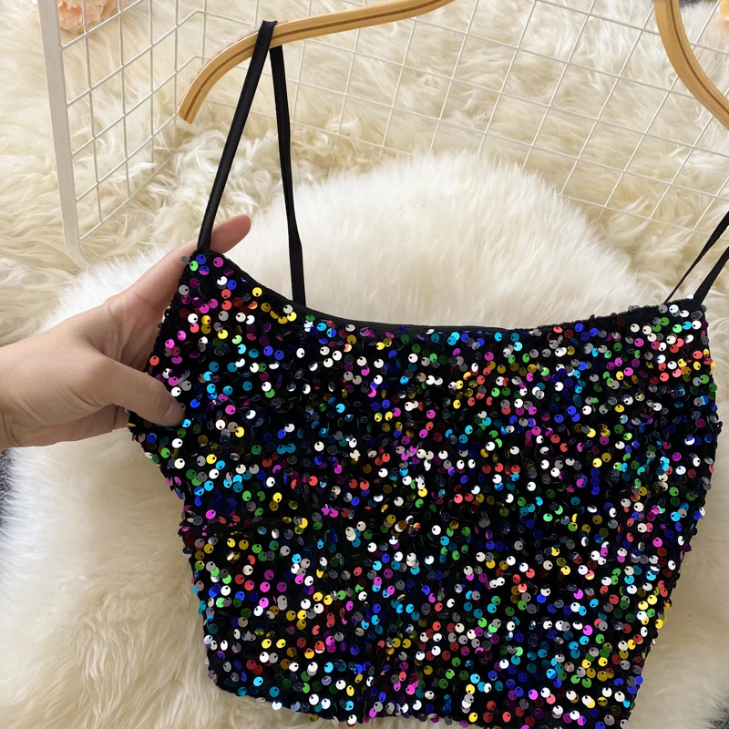 Znbbw Women Europe The United States Summer Sequins Backless Suspenders Short Tops Waist Thin Skirt Two-piece Suit Female D0801