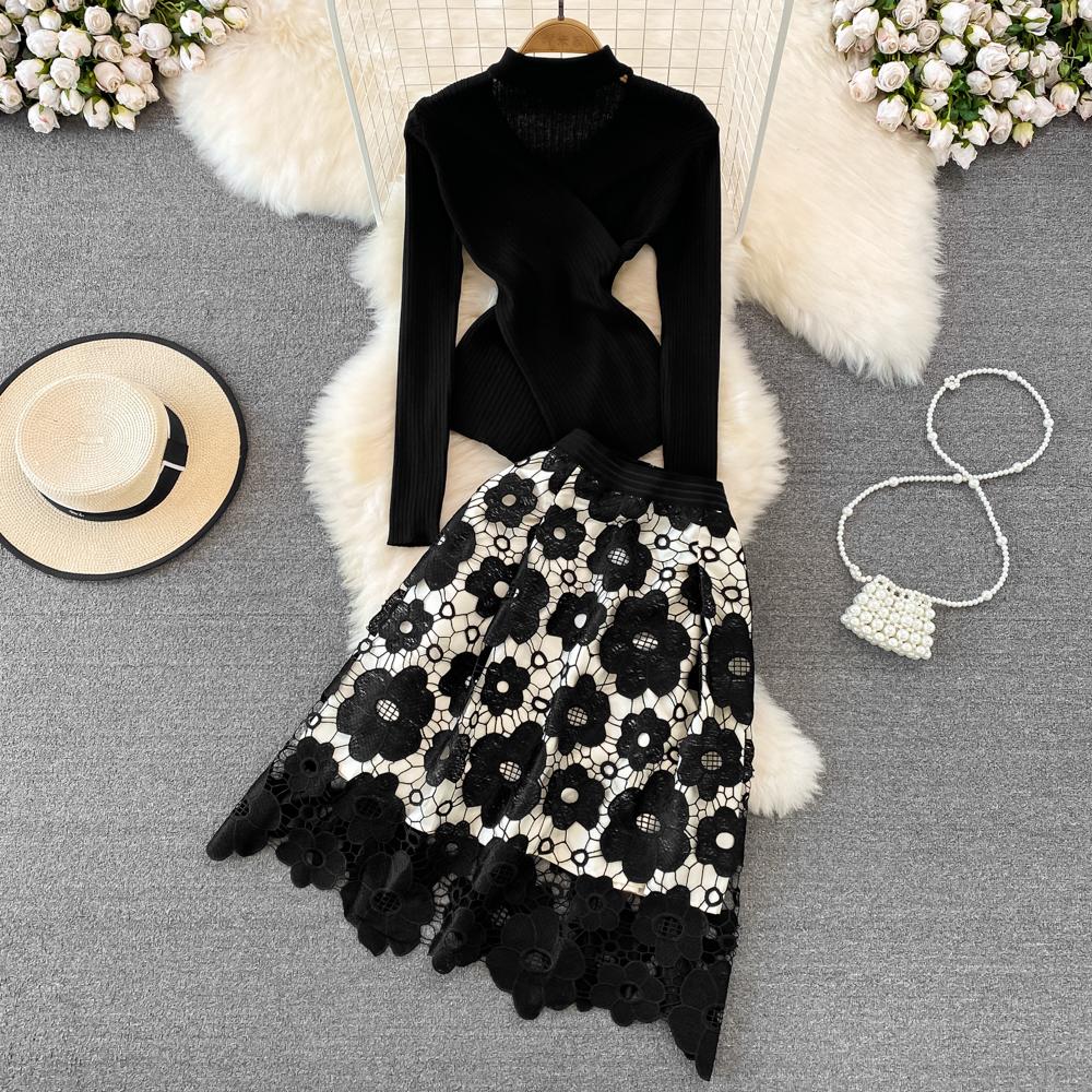 Znbbw Women Hollow Out Embroidery 2 Piece Set Long Sleeve Across Irregular Top + High Waist A-Line Skirt Sets Two Piece Set