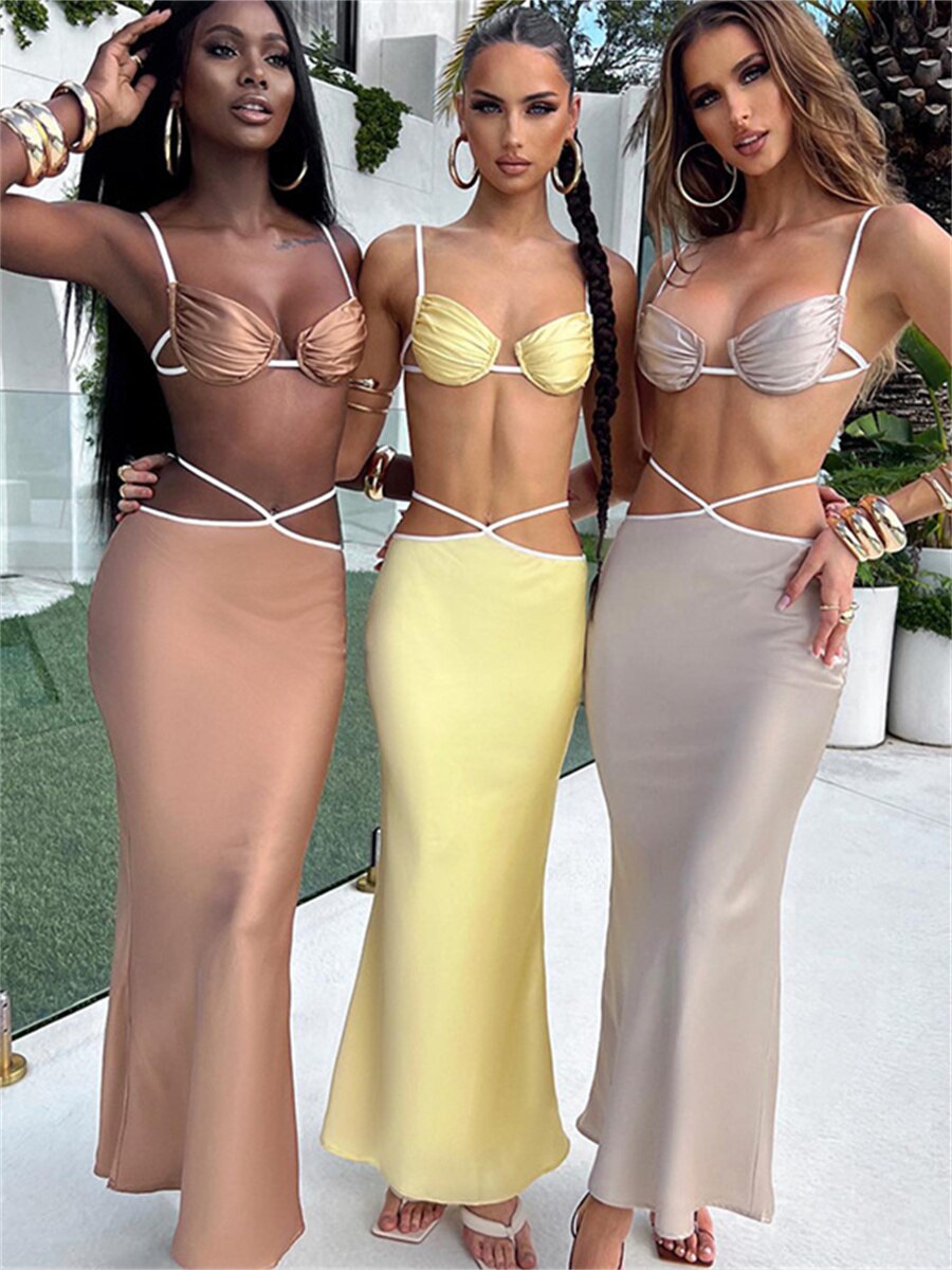Znbbw Women Two-Piece Satin Skirt Suits Summer Sexy Backless Tie-Up Sling Camisole Low Waist Hollow Out Long Bodycon Skirt Set