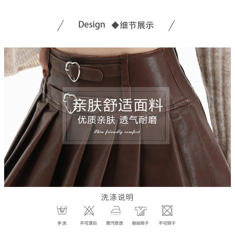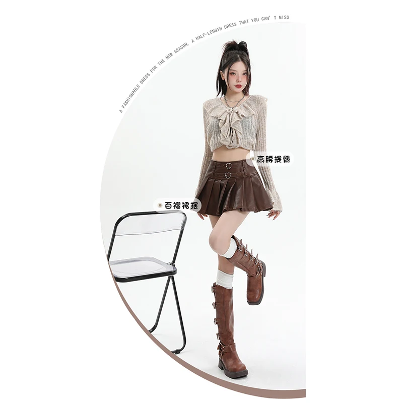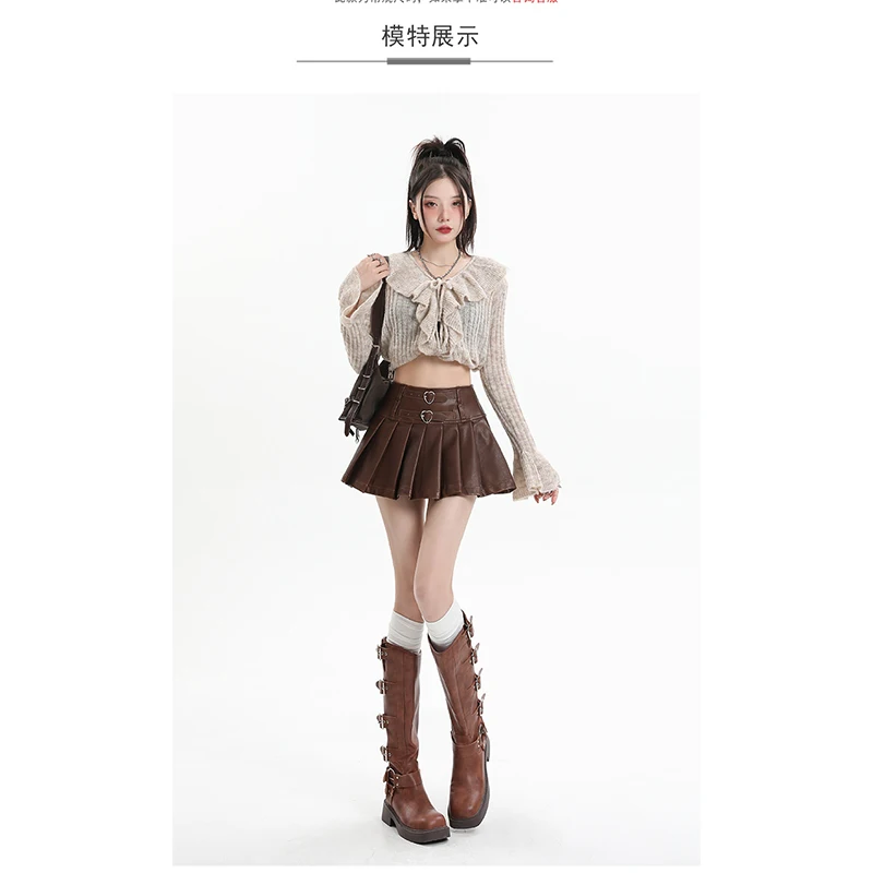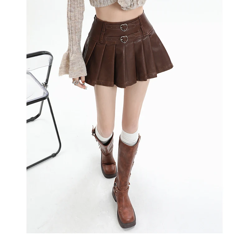 Znbbw Women's Coffee Leather Pleated Skirt Harajuku Y2k 2000s Vintage Mini Skirt 90s Aesthetic Streetwear Fashion A-Line Skirt Clothes