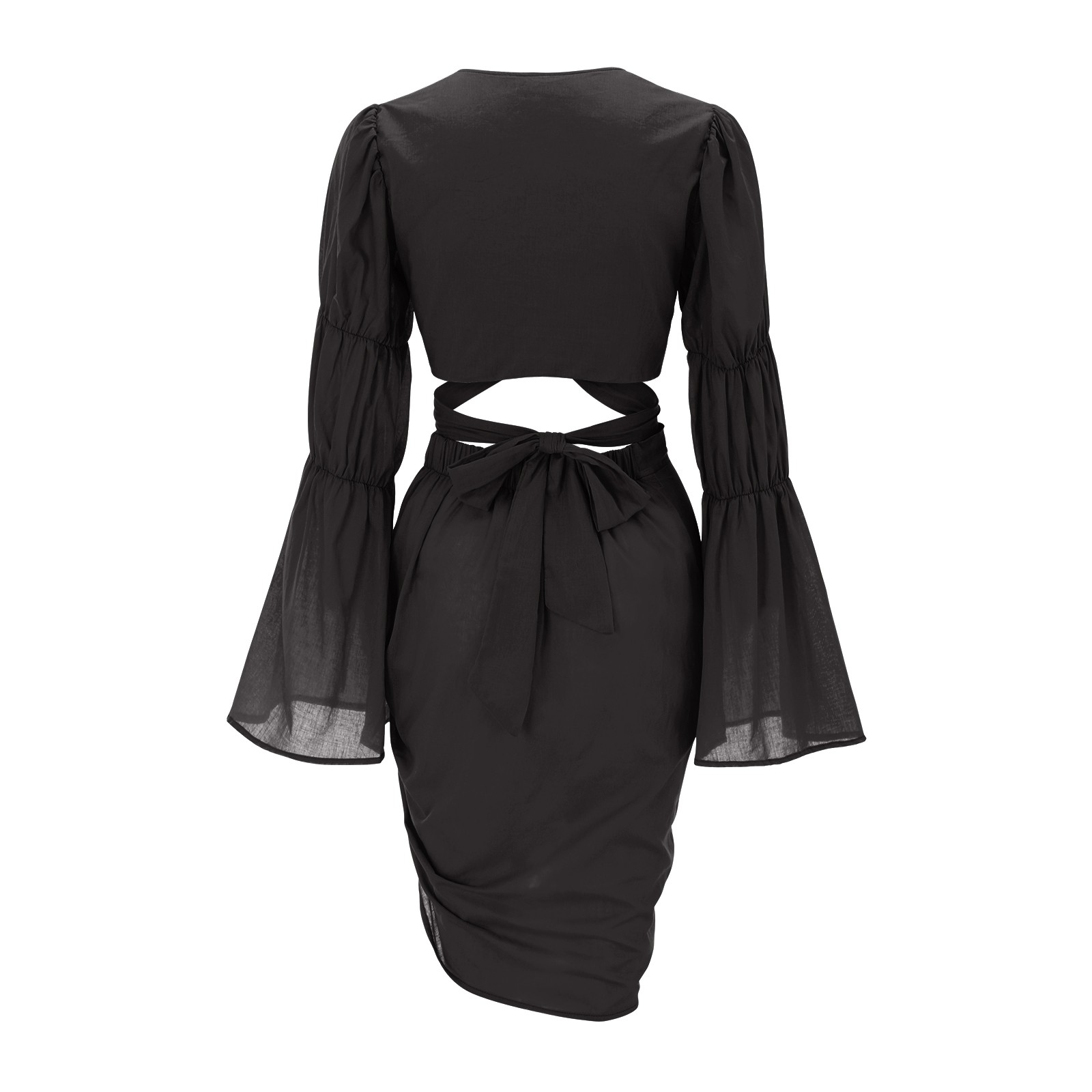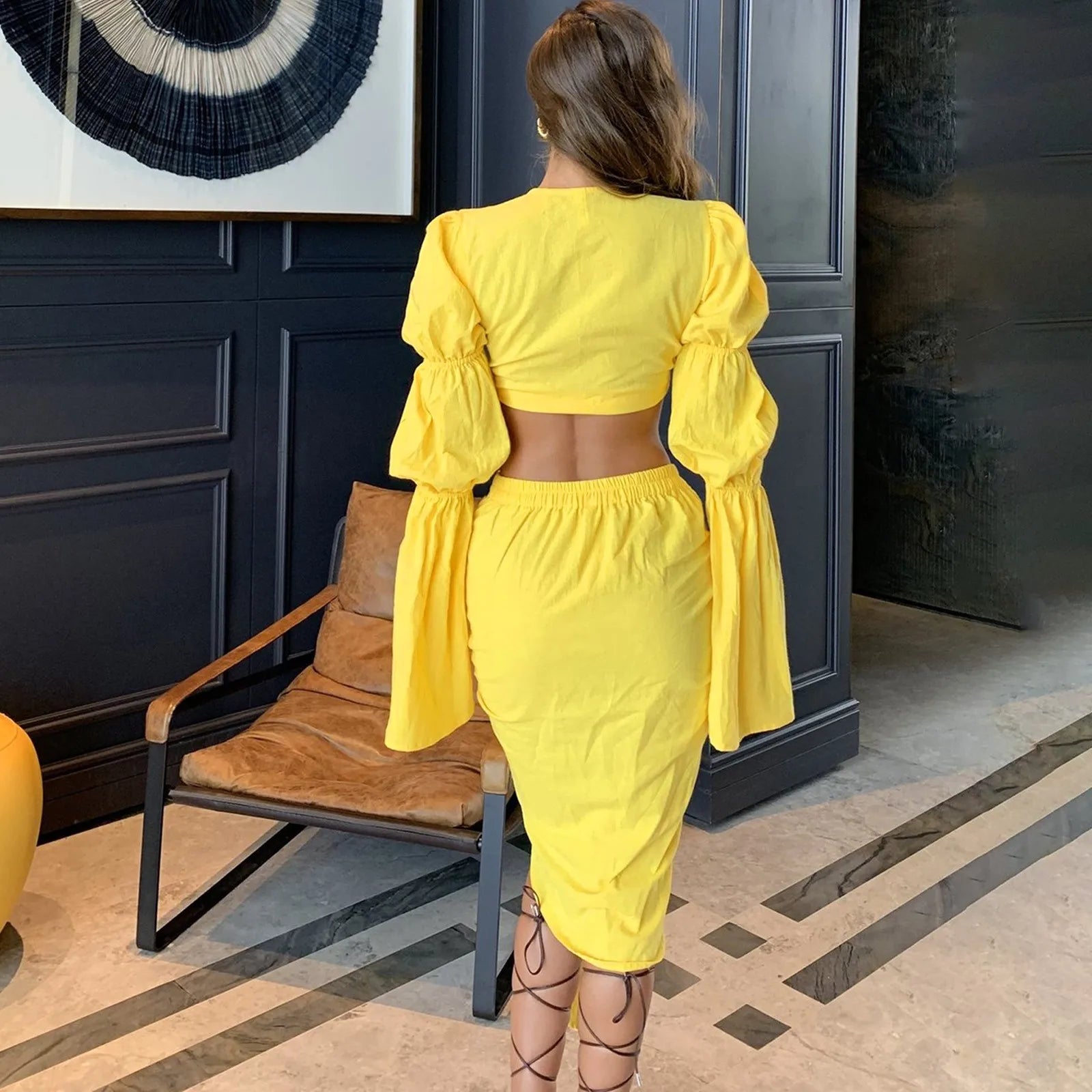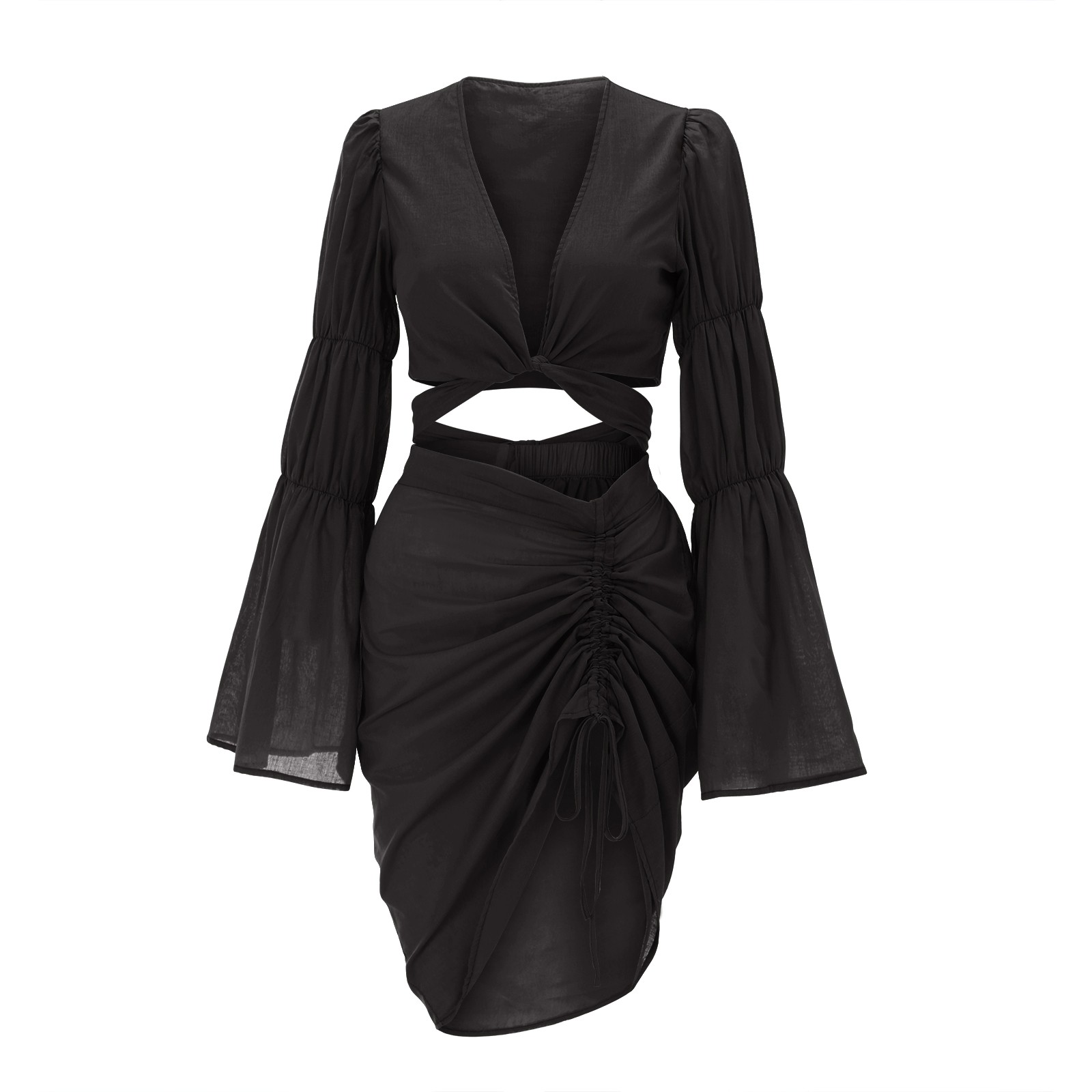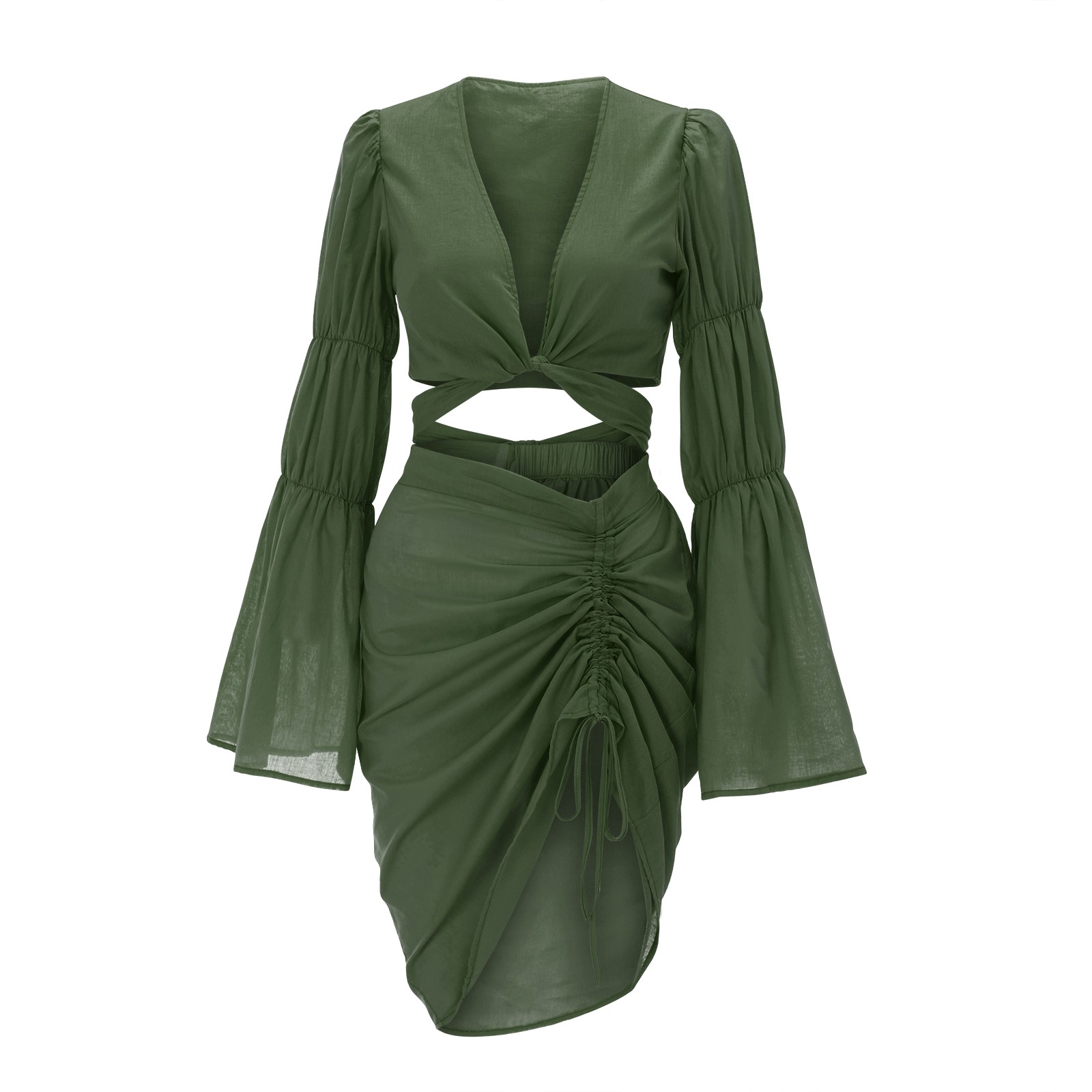 Znbbw Women's Fashion Cut Out Slit Waist Skirt With Lantern Long Sleeve V-Neck Top Sexy Bandage Evening Night Club Tight Dresses
