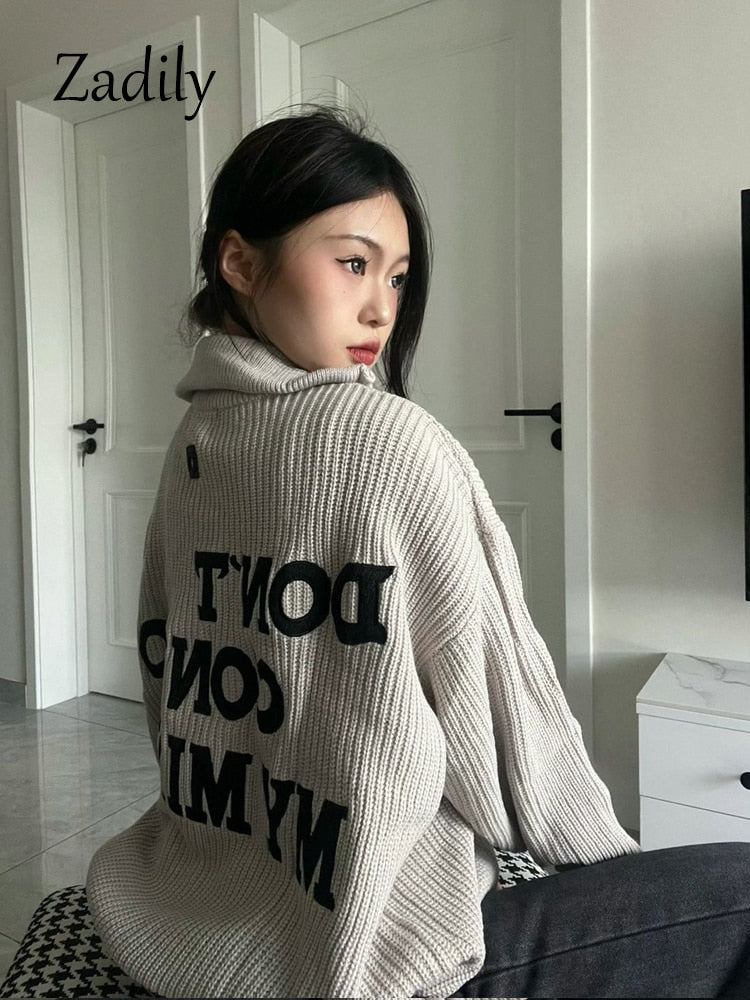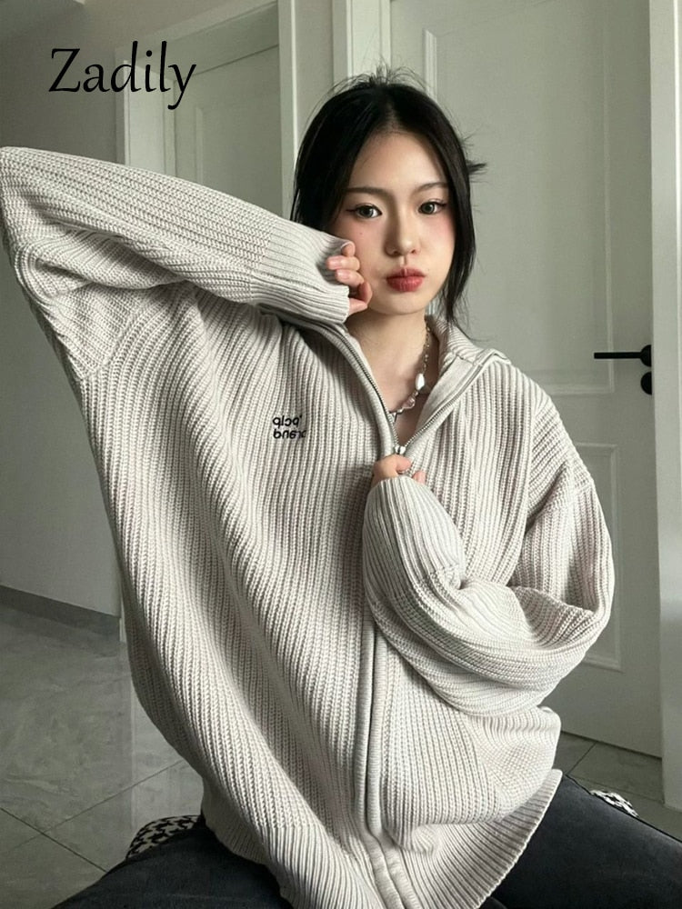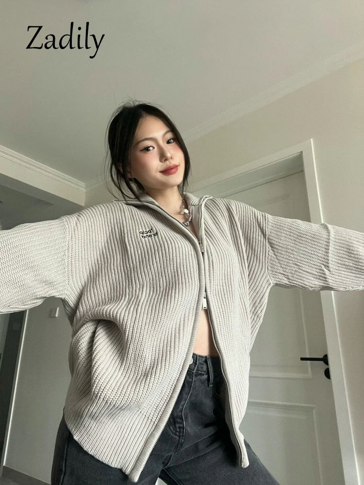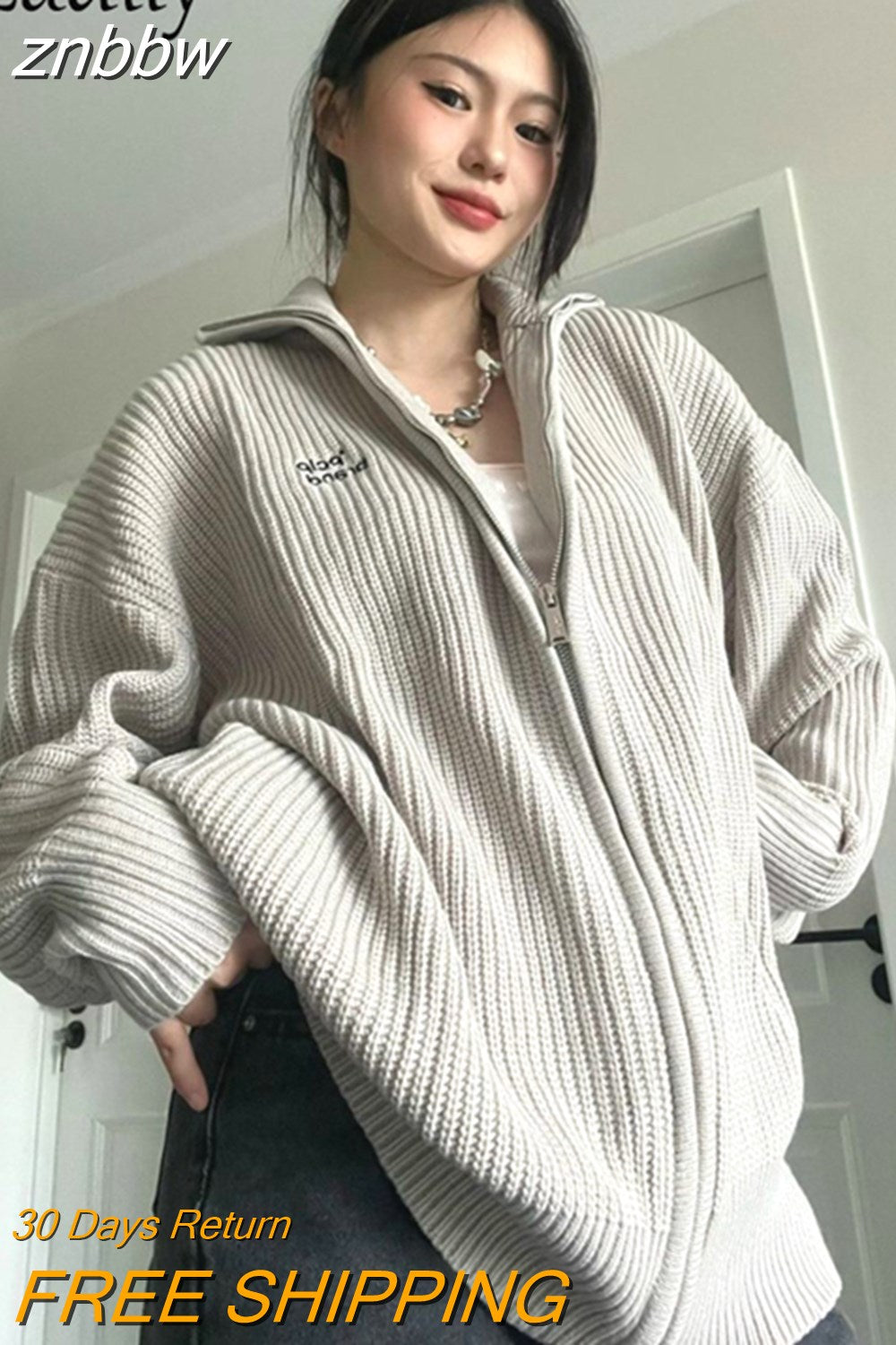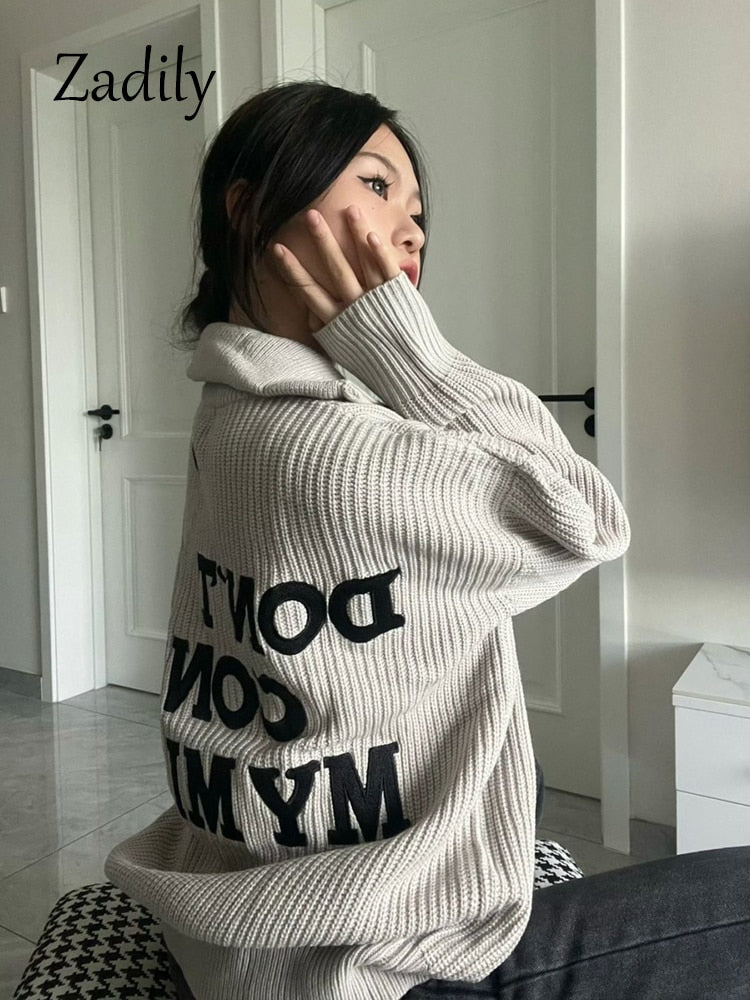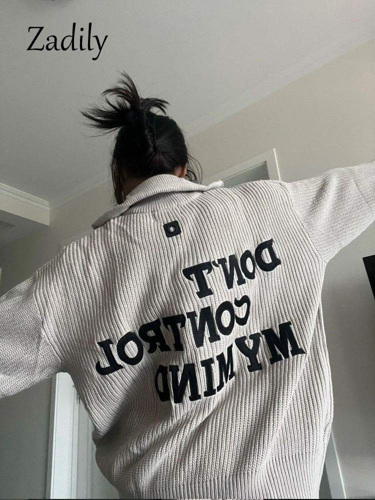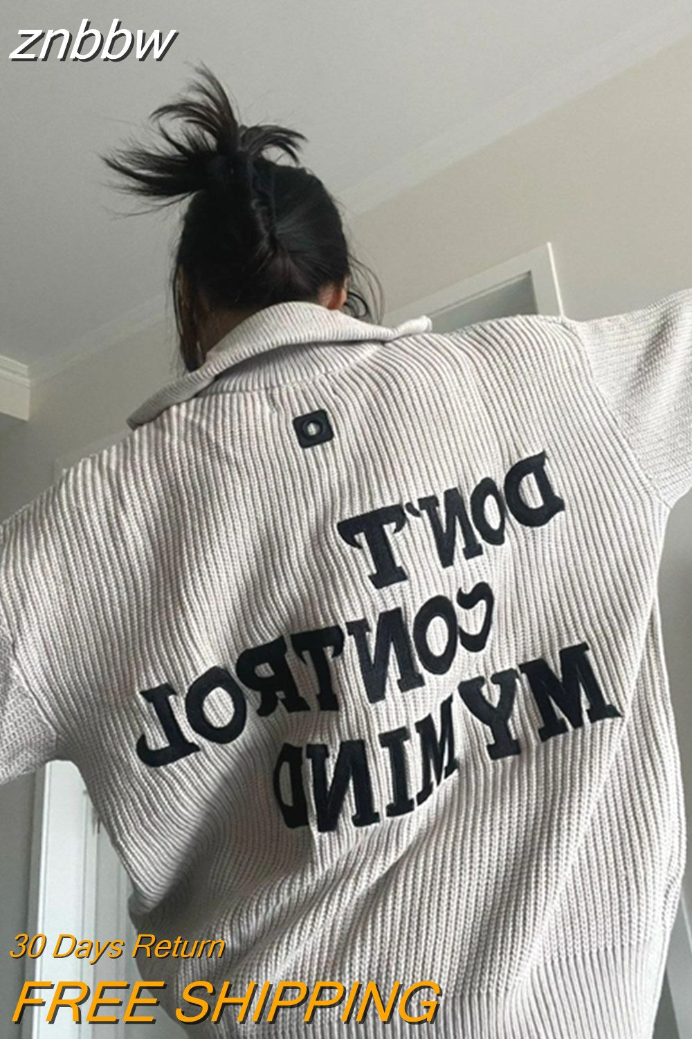 znbbw 2023 Winter Streetwear Long Sleeve Zipper Knit Cardigan Women Letter Appliques Oversize Ladies Sweater Casual Female Coat