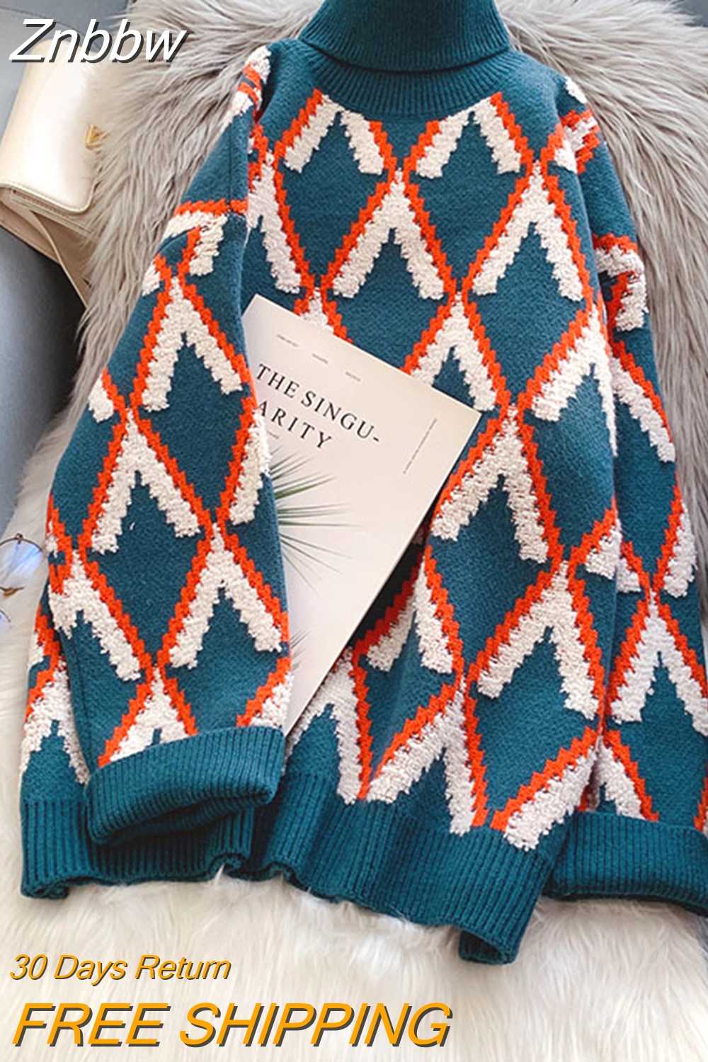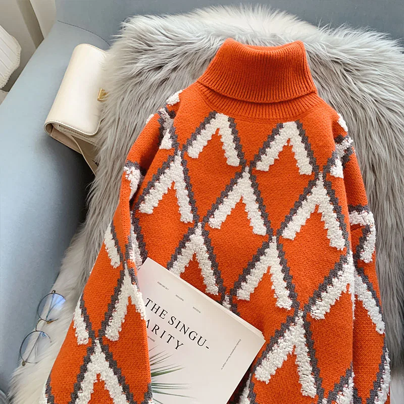 Znbbw Fashion Women's Turtleneck Sweater Korean Fashion Winter Pullover Oversized Long Sleeve Knitted Lady Argyle Sweaters