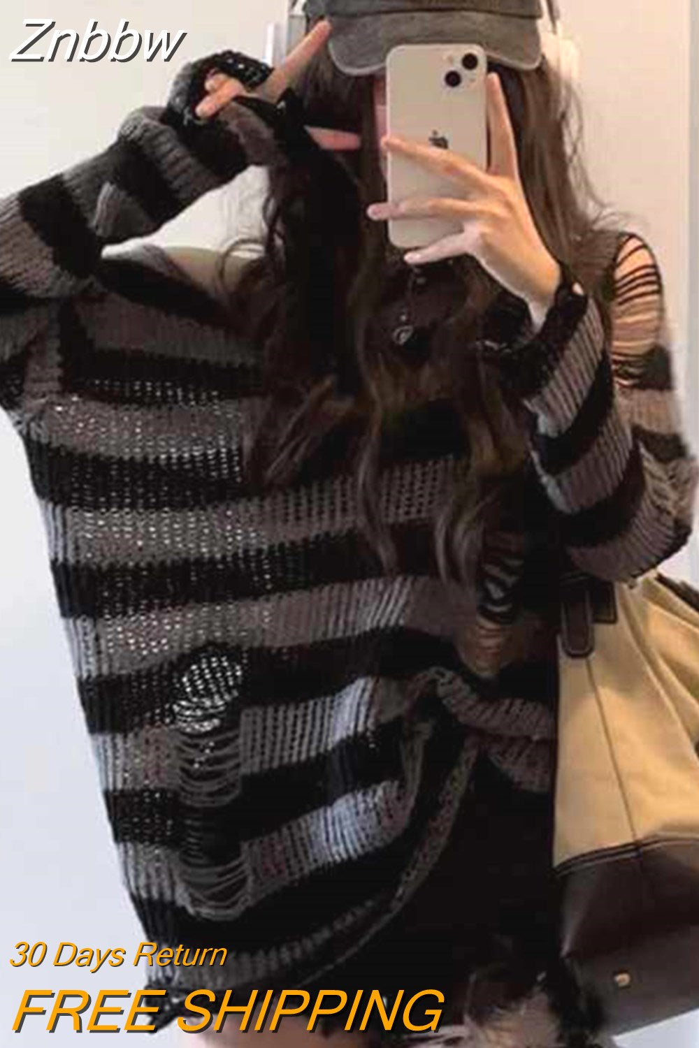 Znbbw Gothic Streetwear Striped Knitted Sweater Women Harajuku Punk Hollow Out Jumper Hole Loose All-match Tops Grunge E-girl