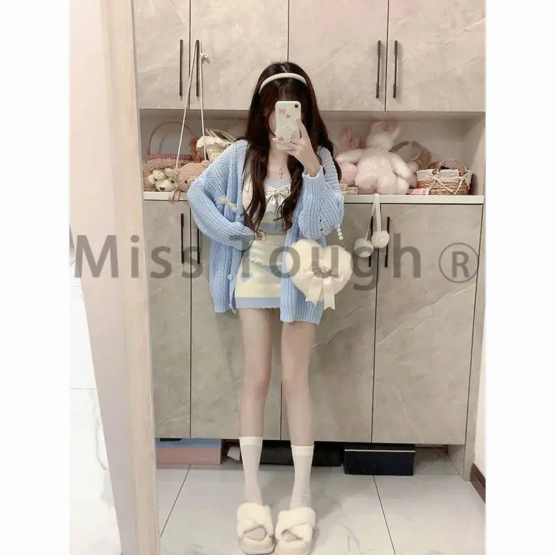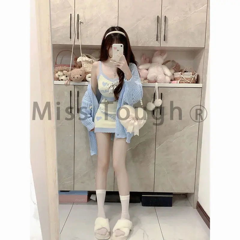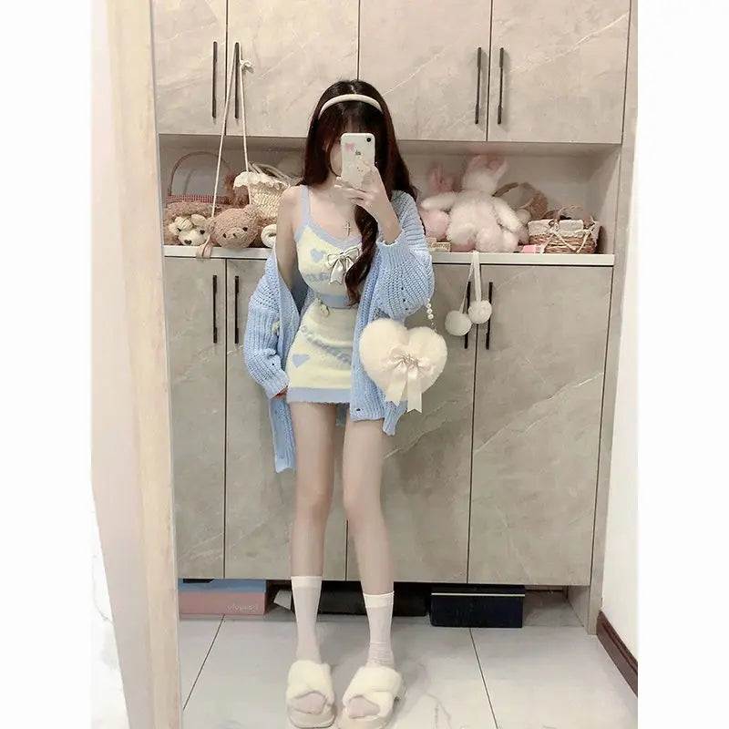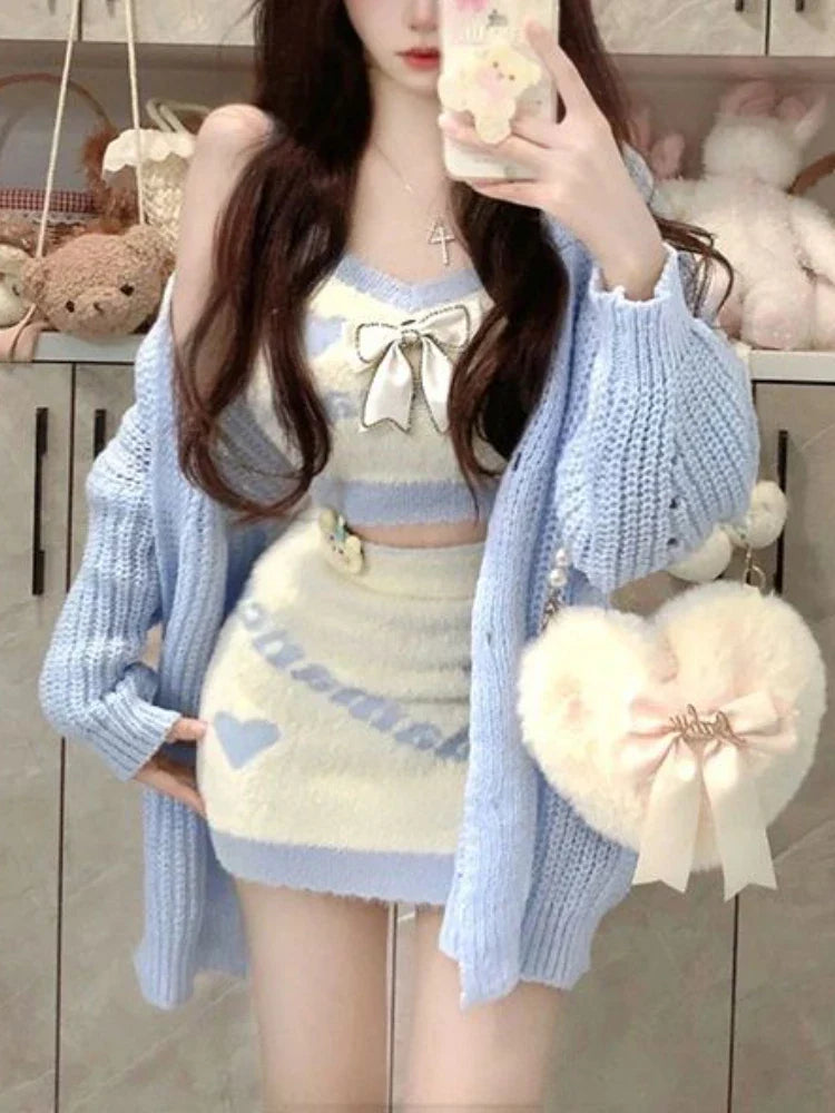 Znbbw Kawaii Knitted Three Piece Set Women Bow Warm Sweater Mini Skirt Suit Female Casual Korean Fashion Y2k Sweet Set 2024
