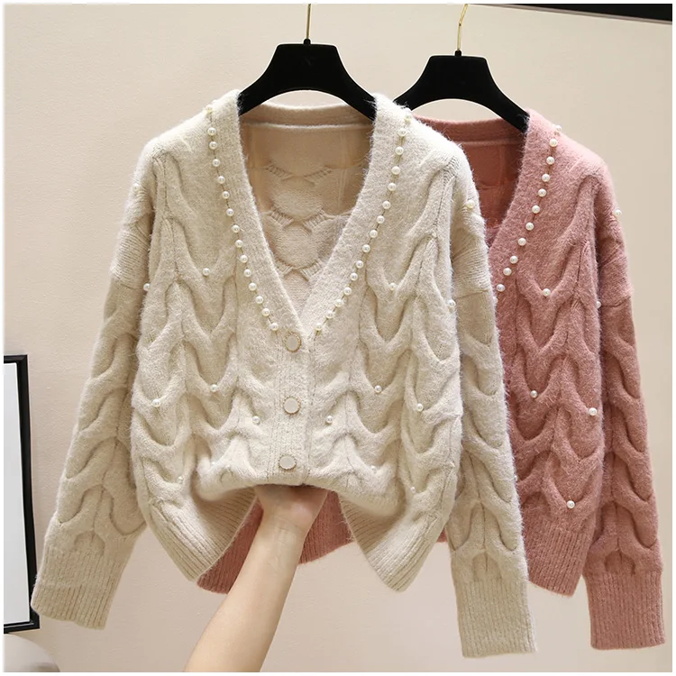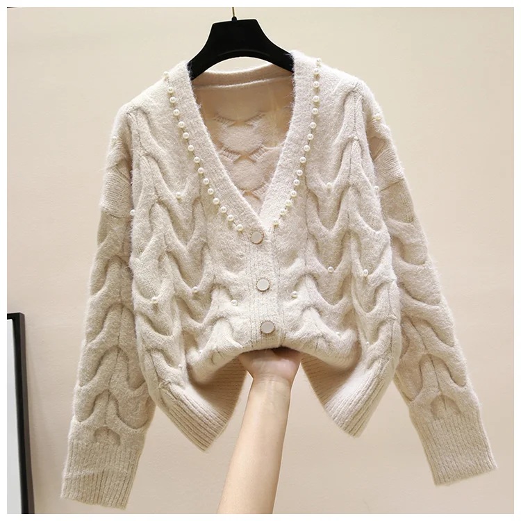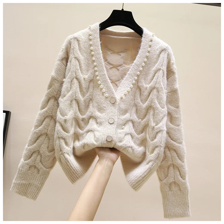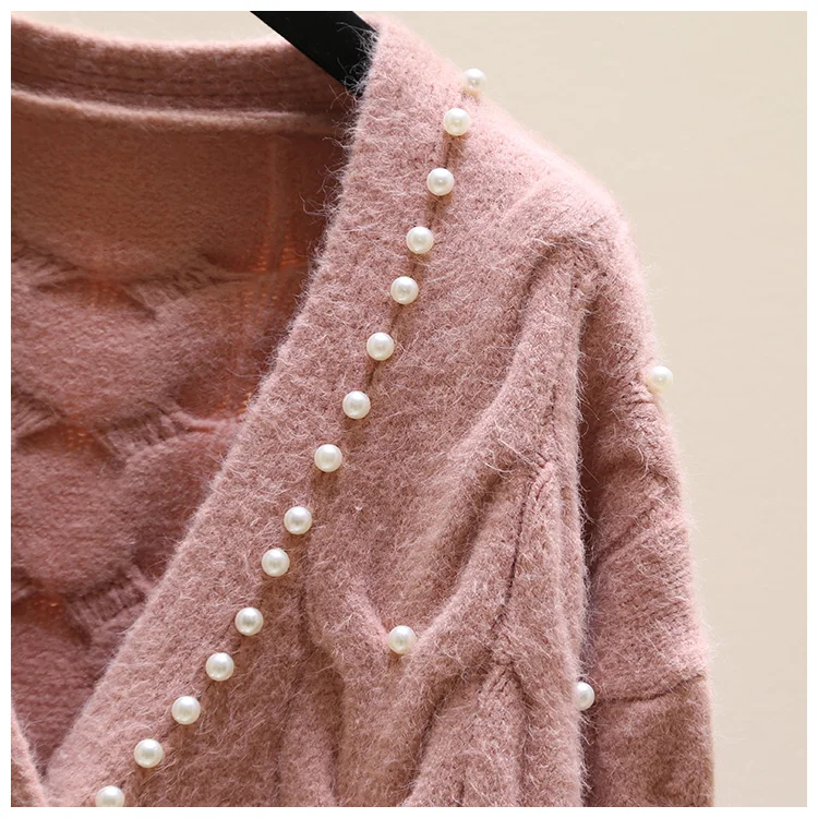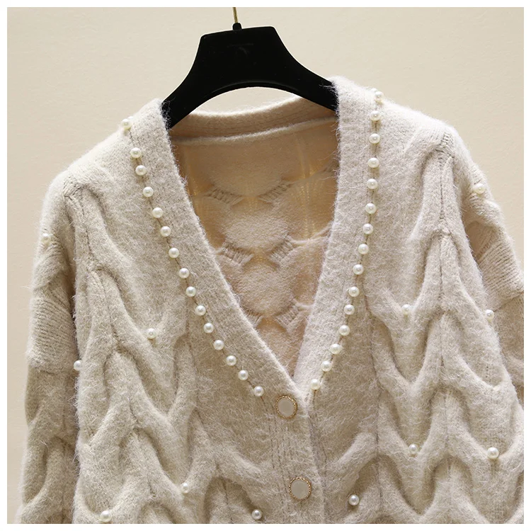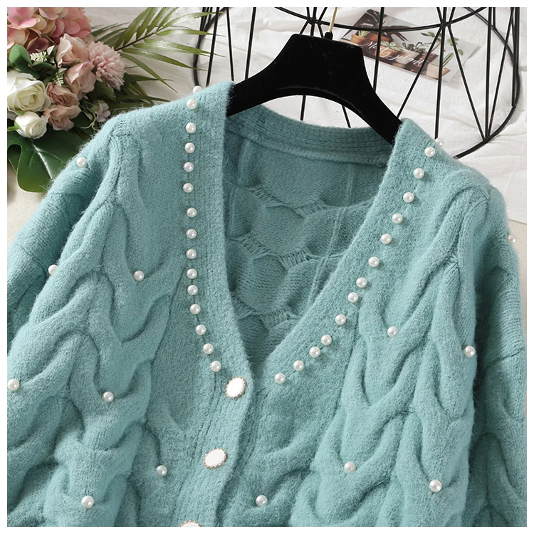 Znbbw new fashion all-match knitted outer wear sweater Sweet beaded V-neck knitted cardigan women's spring