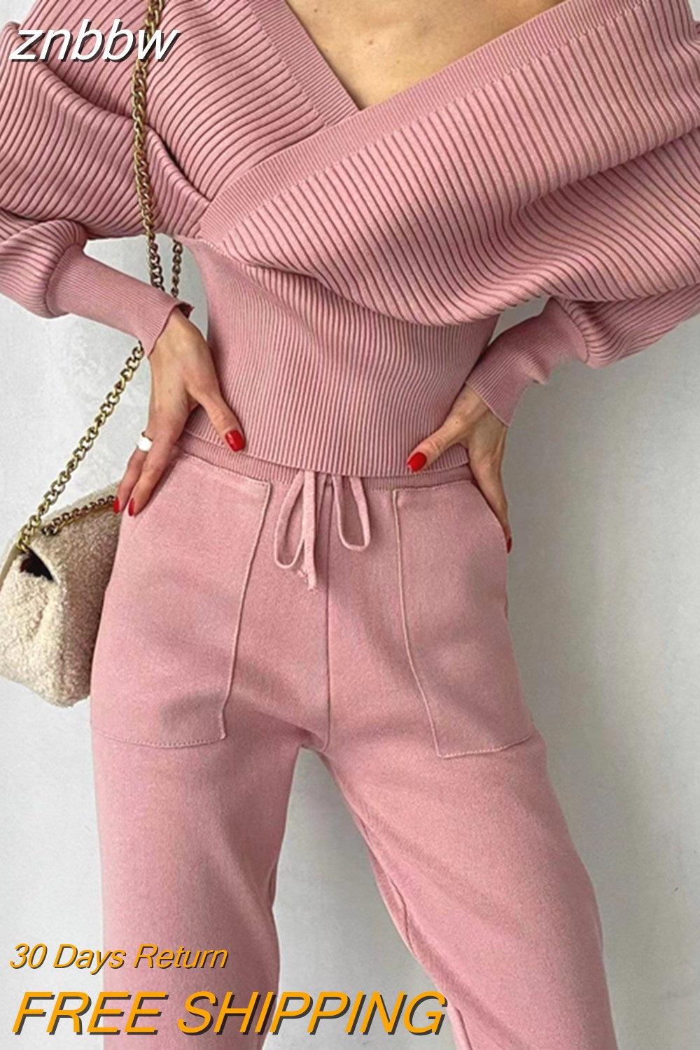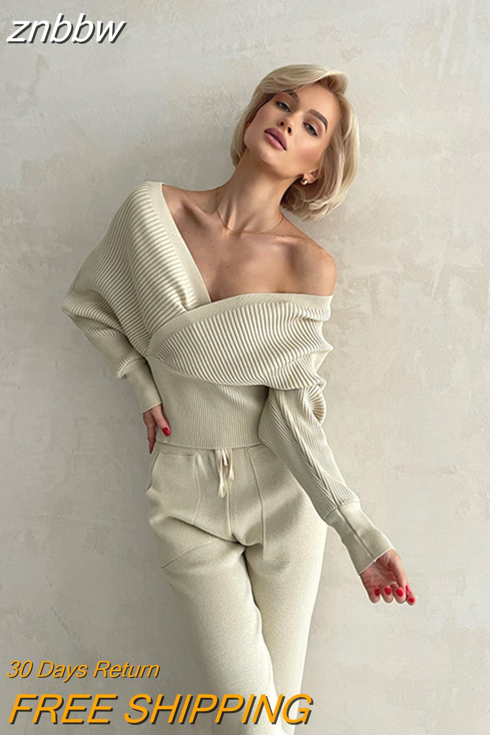 znbbw New Sexy Off Shoulder Knitted Two Piece Set Women Long Sleeve Sport Tracksuit 2 Piece Sweater Pants Suits Matching Sets
