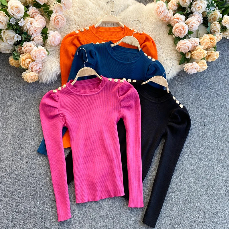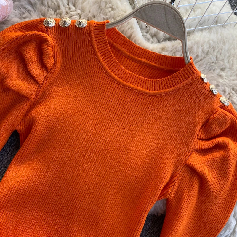 Znbbw Puff Long Sleeve Knitted Sweater Pullovers Girls Solid Buttons O-neck Streetwear Winter Sweaters Tops Jumpers Women