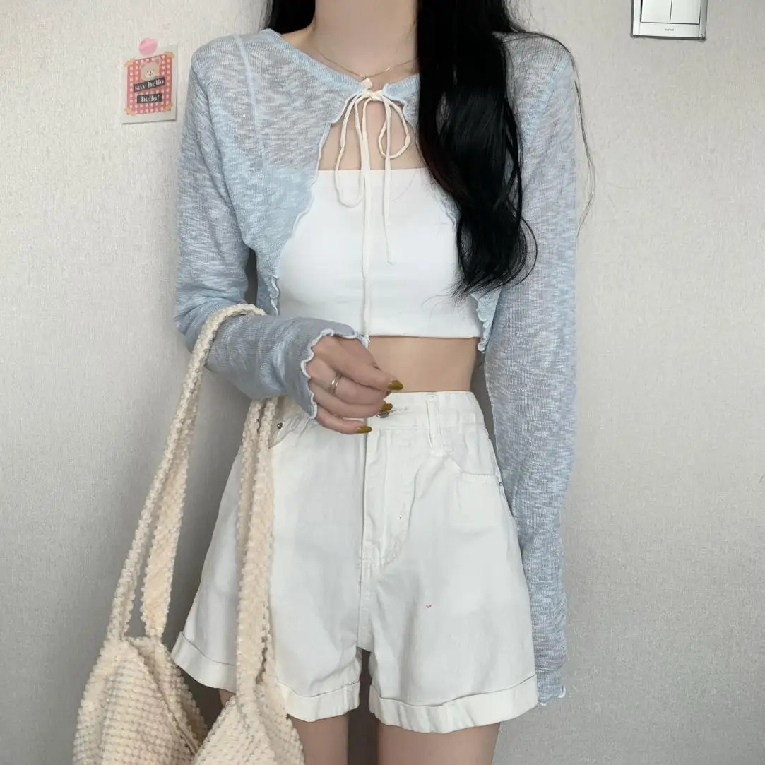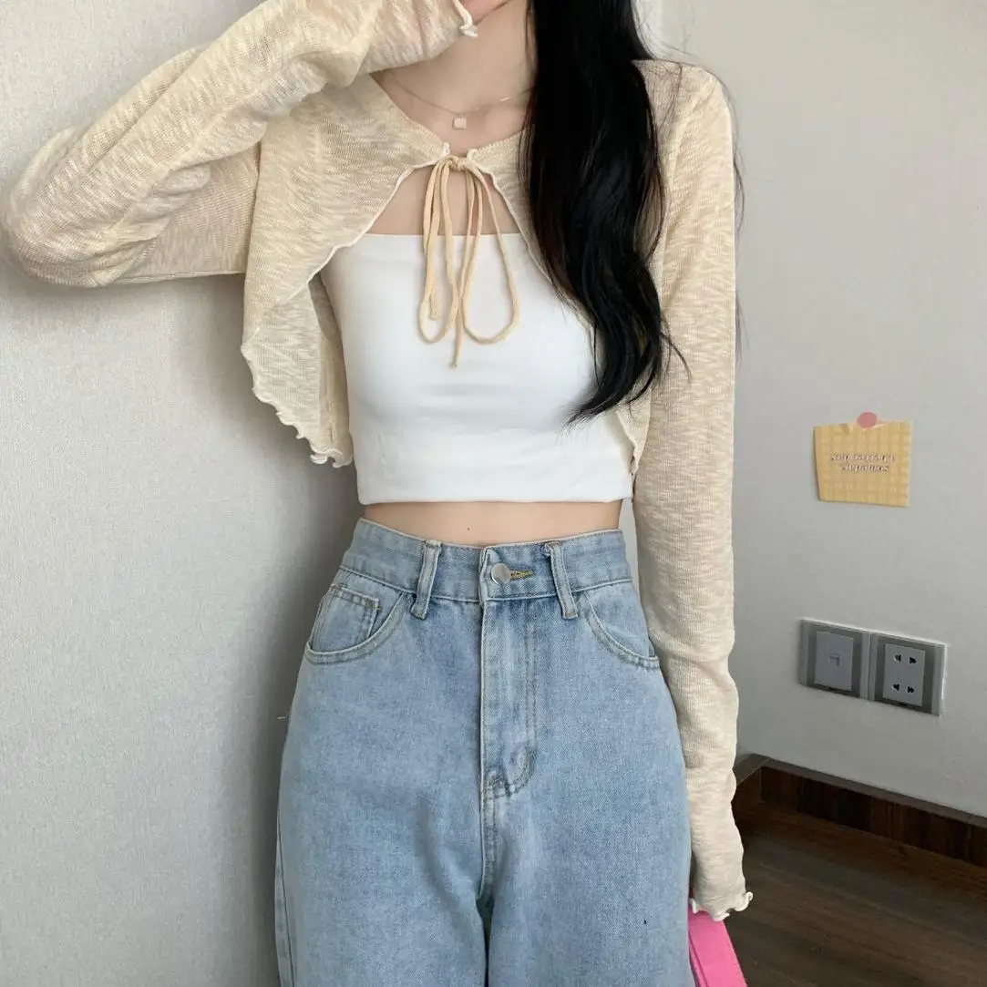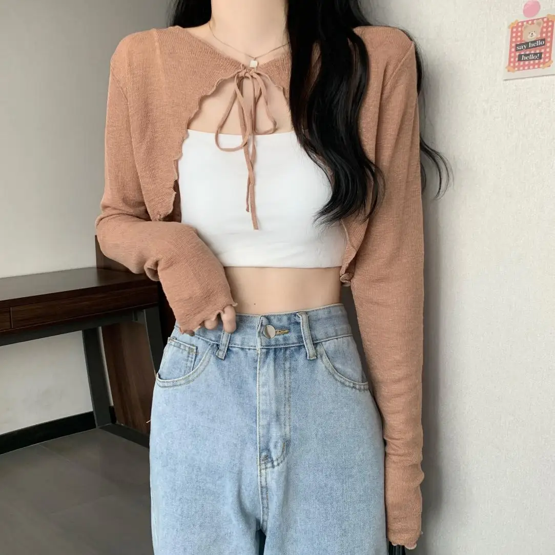 Znbbw Short Cardigan Women Long Sleeve Thin Open Stitch Knitted Sweater Shirts Female Solid Shawl