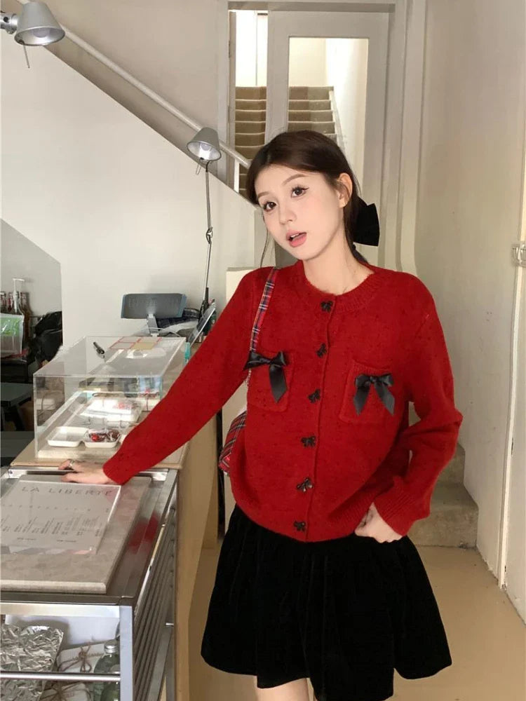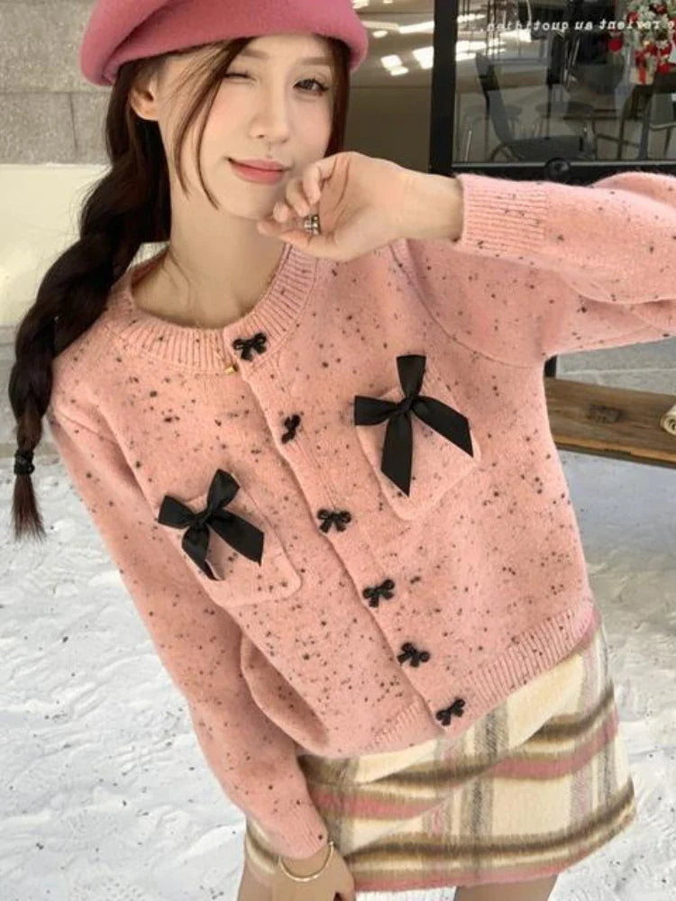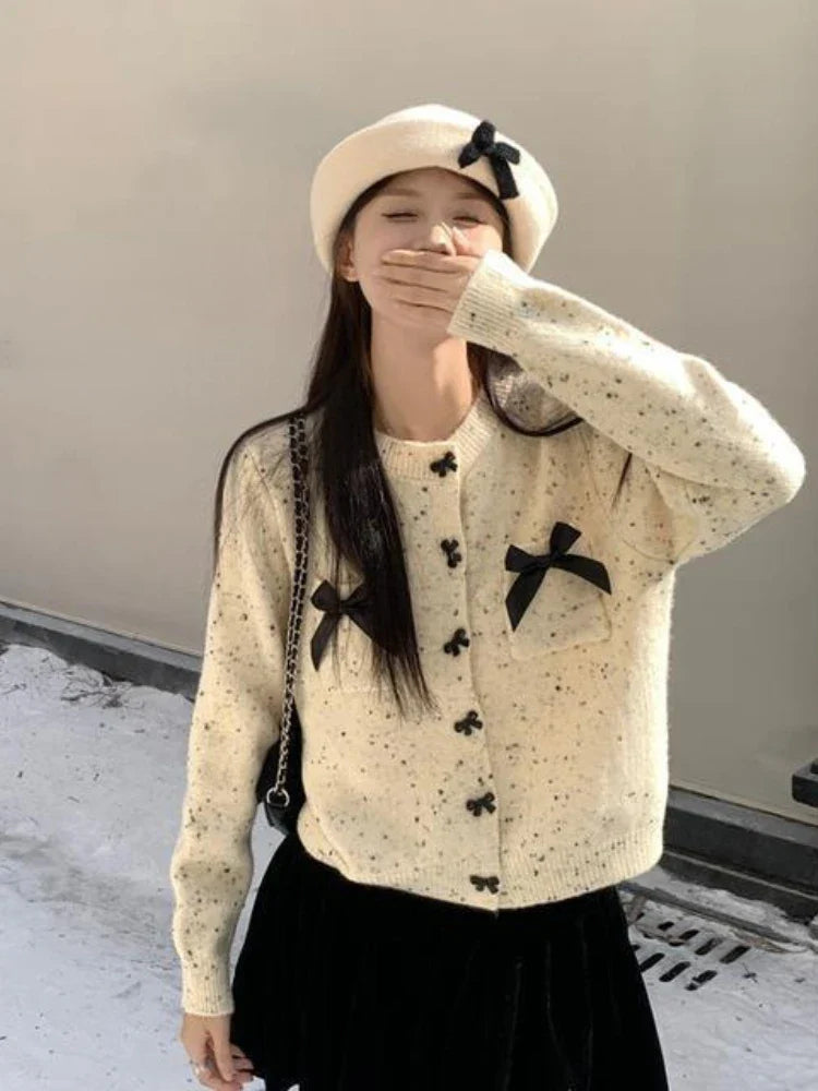Znbbw Style Cardigan for Women Bow Patchwork Button Knit Short Coats Autumn Winter Sweaters Fashion Sweet Loose 2024 Clothing