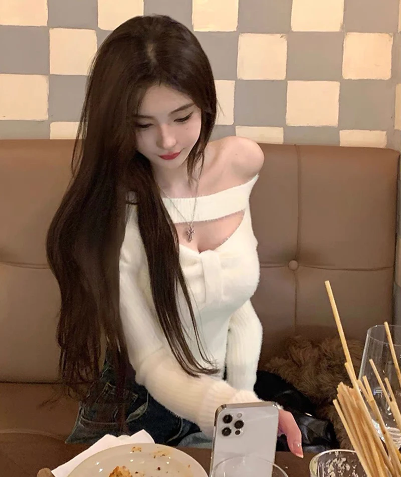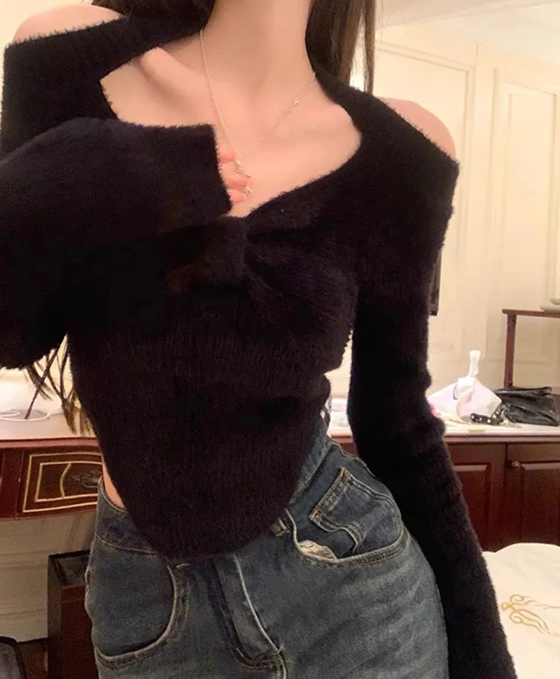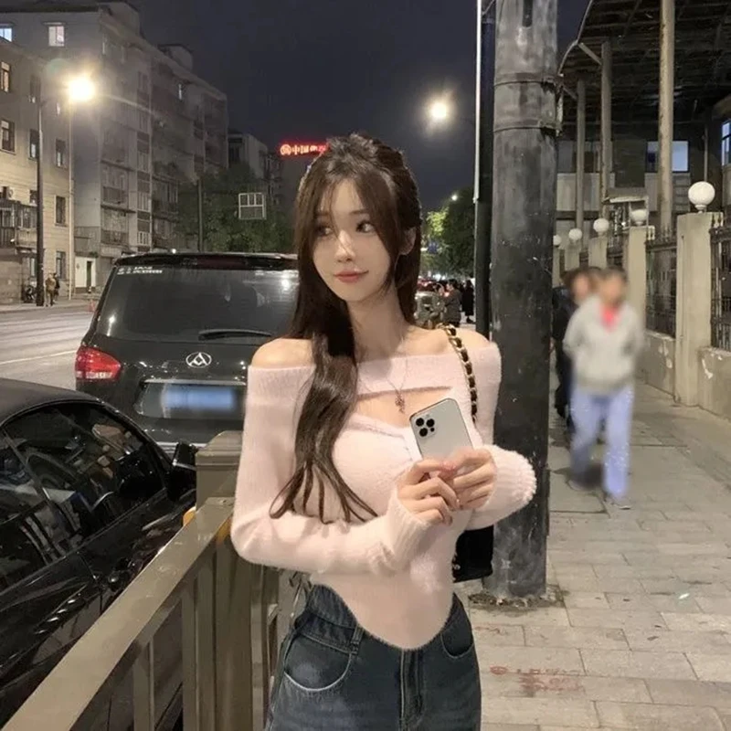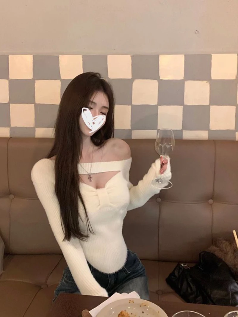 Znbbw Sweater Women Irregular Halter Cropped Knitted Pullover Y2K Korean Off Shoulder Solid Jumpers Hollow Out Slim Knitwear New