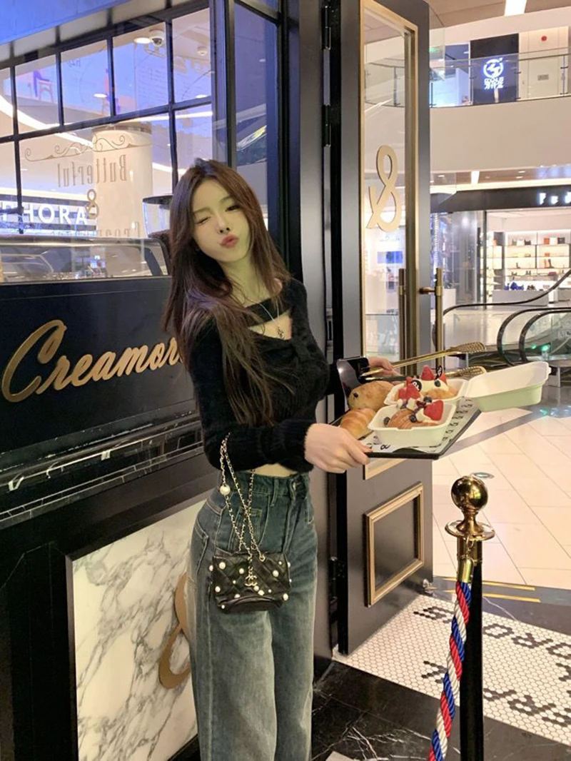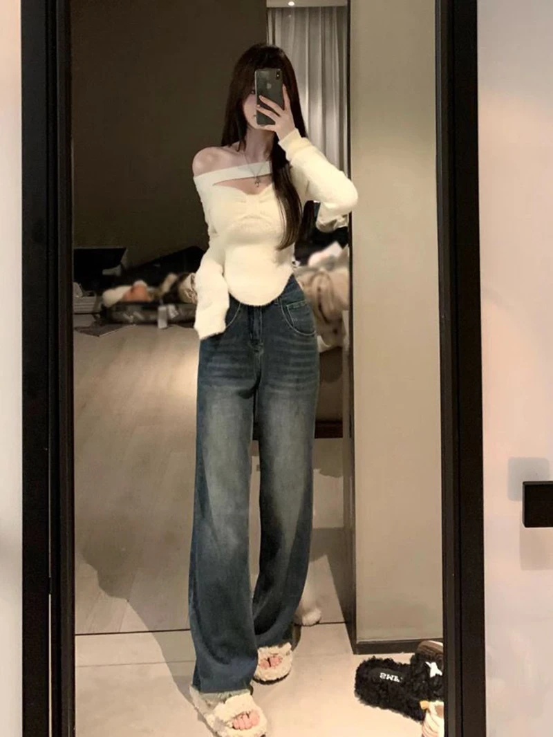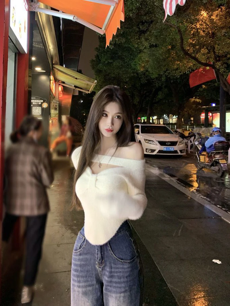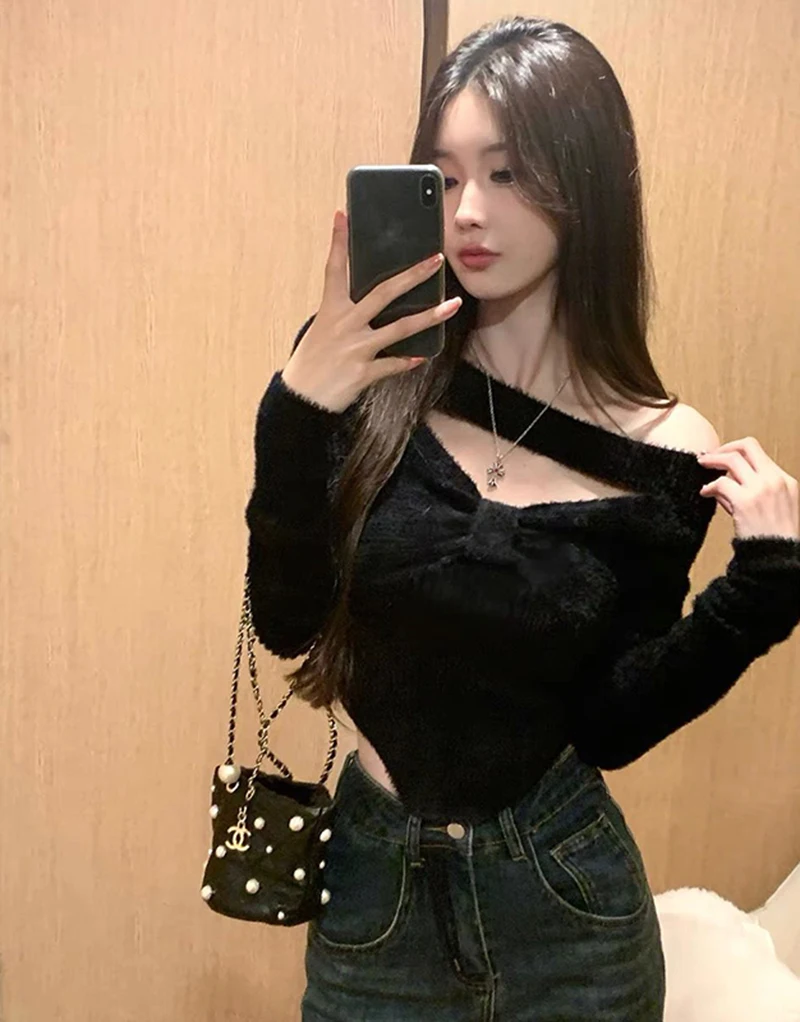 Znbbw Sweater Women Irregular Halter Cropped Knitted Pullover Y2K Korean Off Shoulder Solid Jumpers Hollow Out Slim Knitwear New