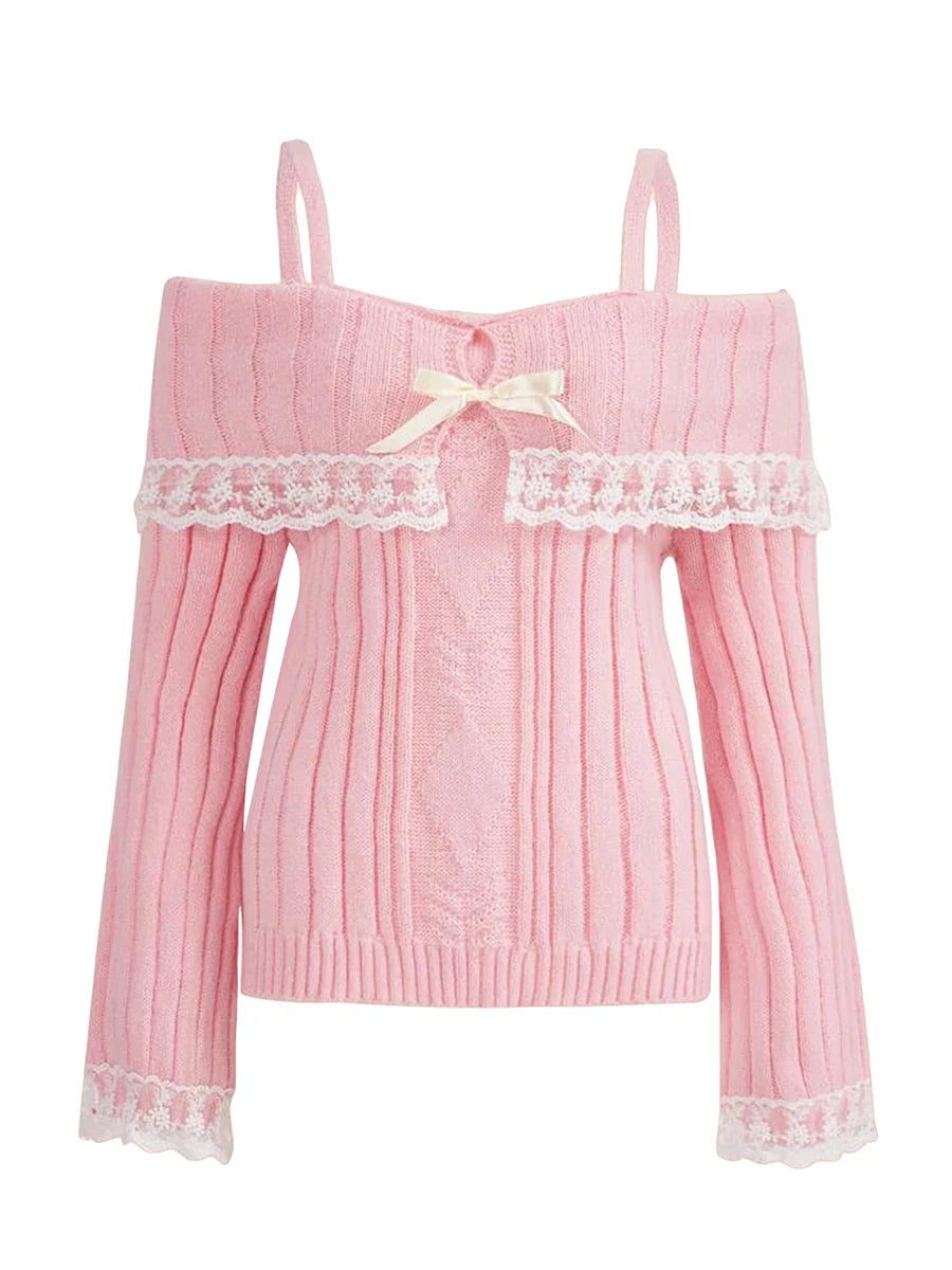 Znbbw sweaters women winter knitwear Cold Shoulder Long Sleeve Contrast Lace Knit Pullovers Bow Front Jumper Tops