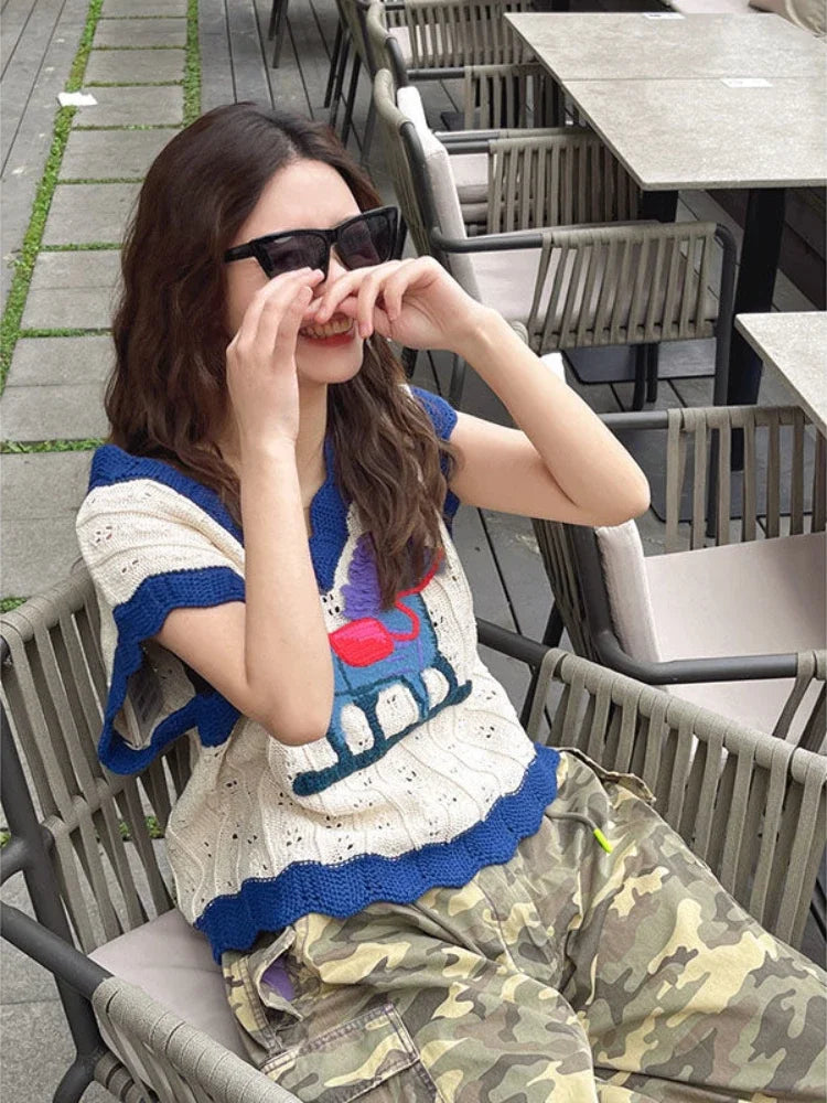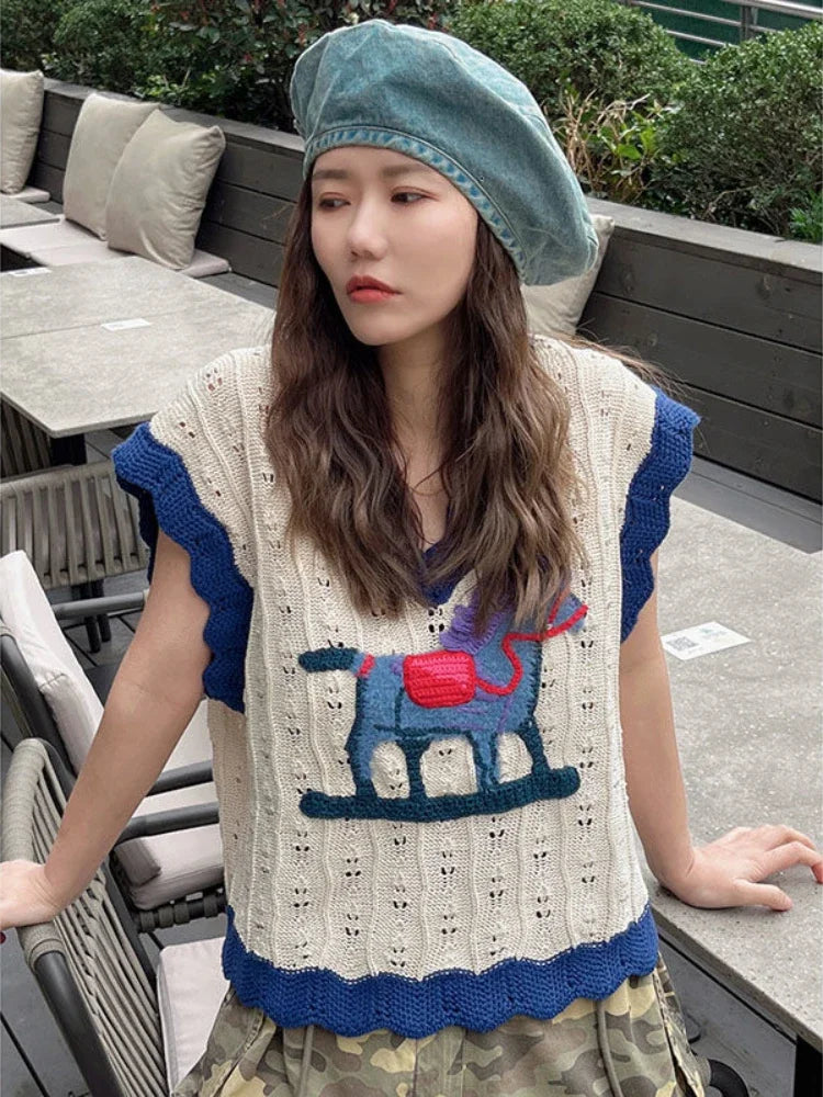 Znbbw Sweet Knitwears Vest Contrast Color Cartoon Embroidery Sweater Hollow Out V Neck Sleeveless Crop Tops Summer Thin Jumpers