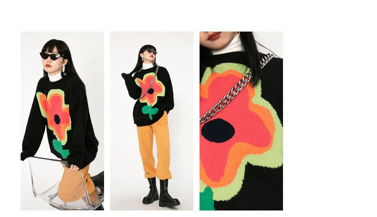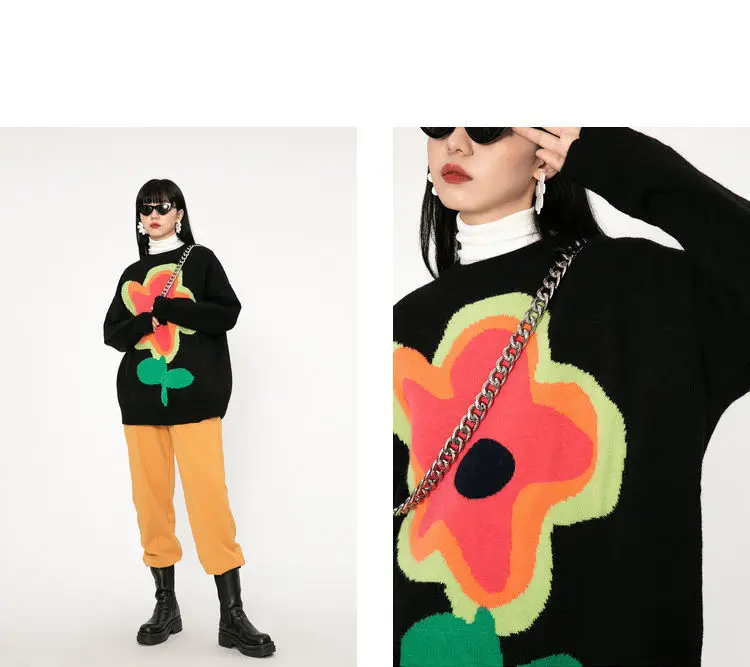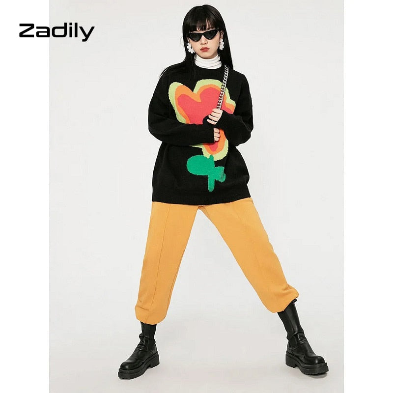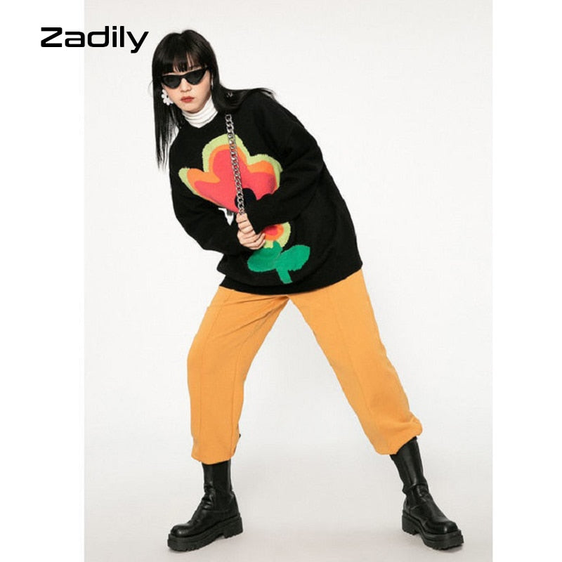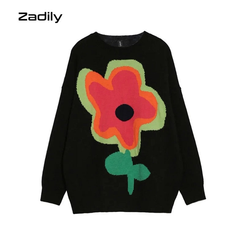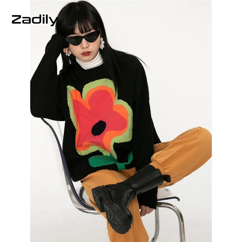 znbbw Winter Street Style Y2K Floral Embroidery Women Warm Sweater Oversize Long Sleeve Knit Ladies Pullover Female Clothing Tops