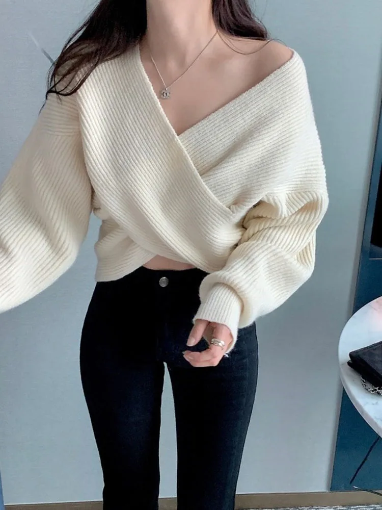 Znbbw Women Autumn Winter Sweater Korean New Design Elegant Cross V-neck Off Shoulder Knit Thickened Sexy Pullover Sweater D4335