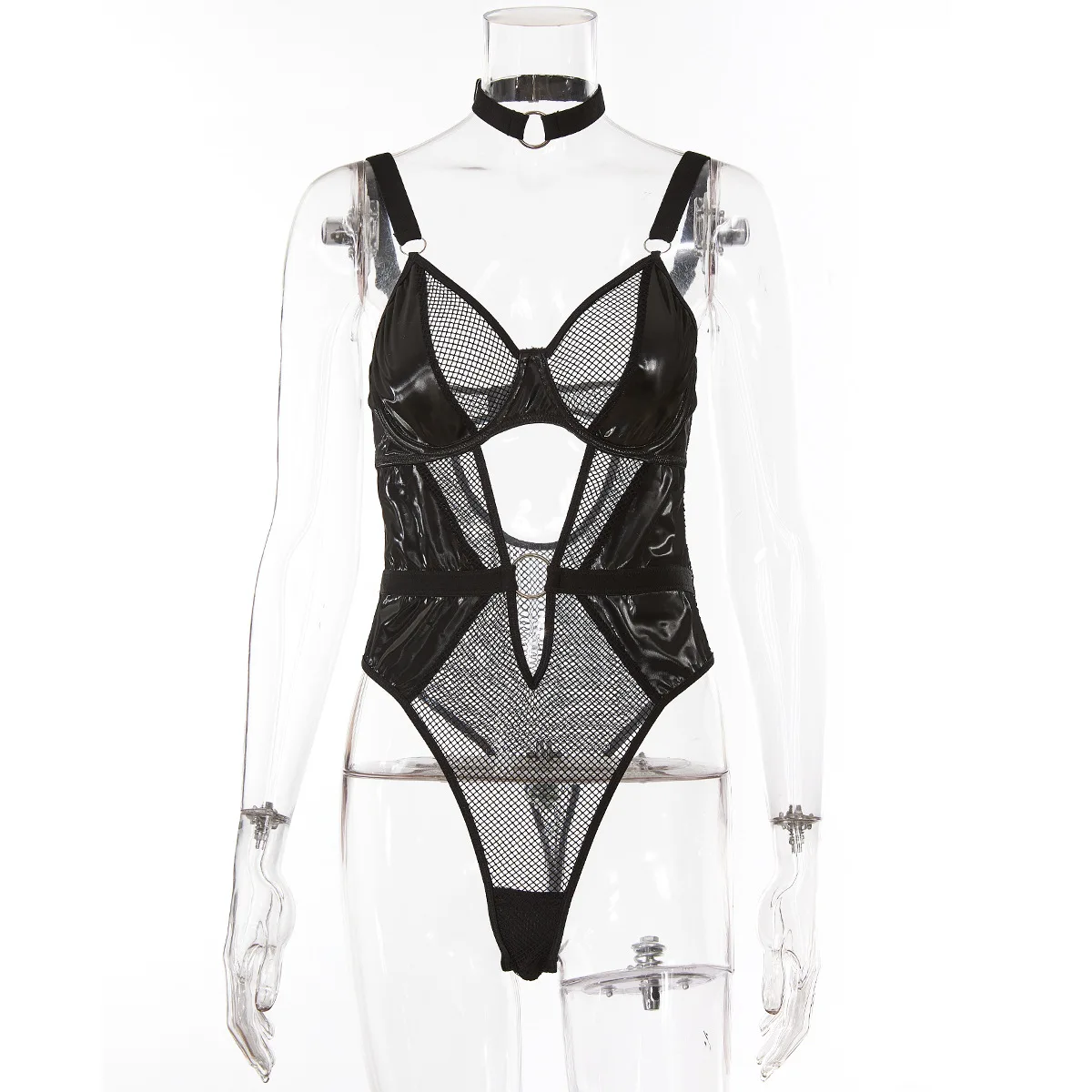 Znbbw Latex Bodysuit WIth Collar Mesh Patchwork See Through Lingerie Body Silicone Leather Open Crotch Top Black Naked Teddy