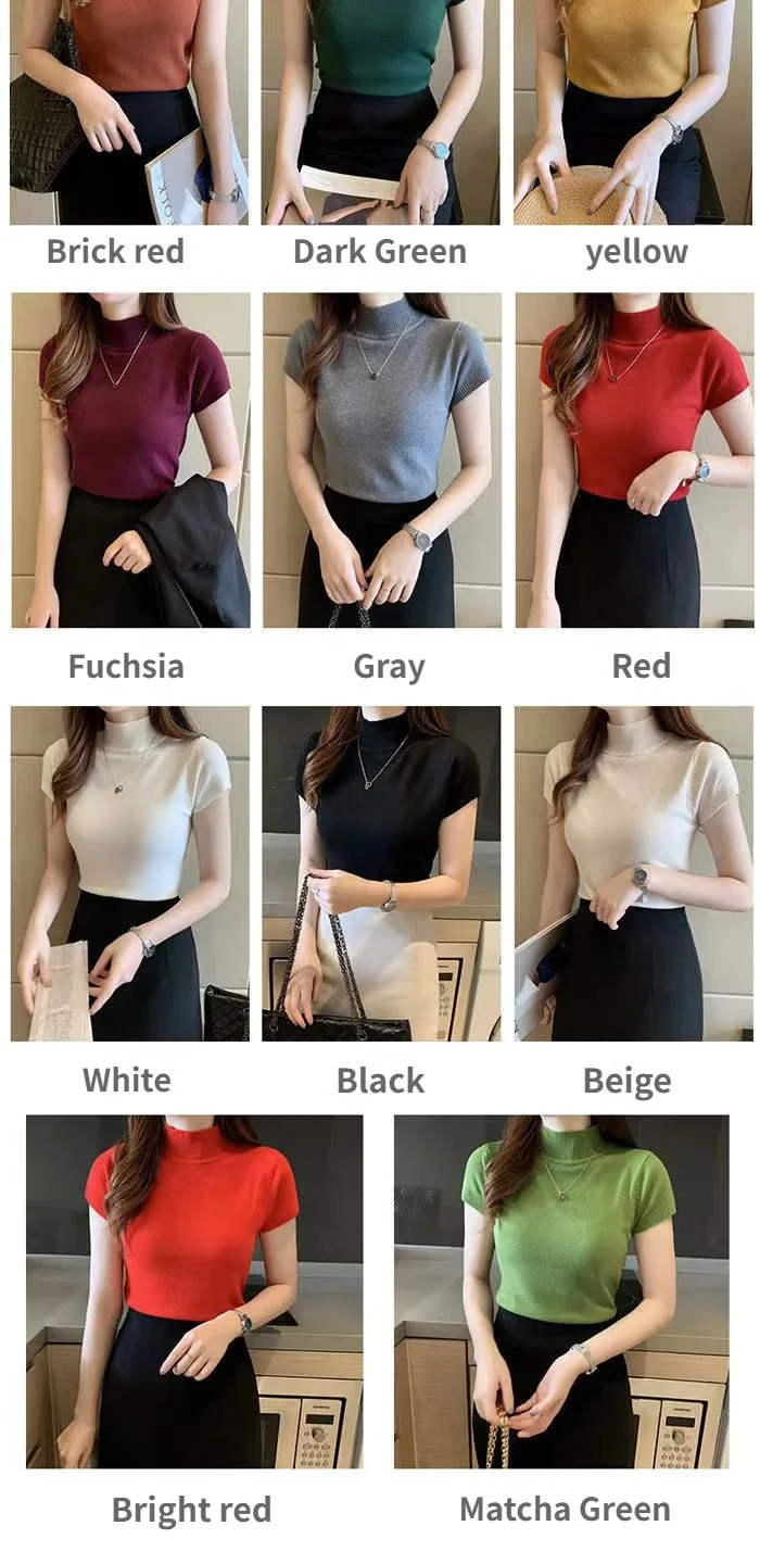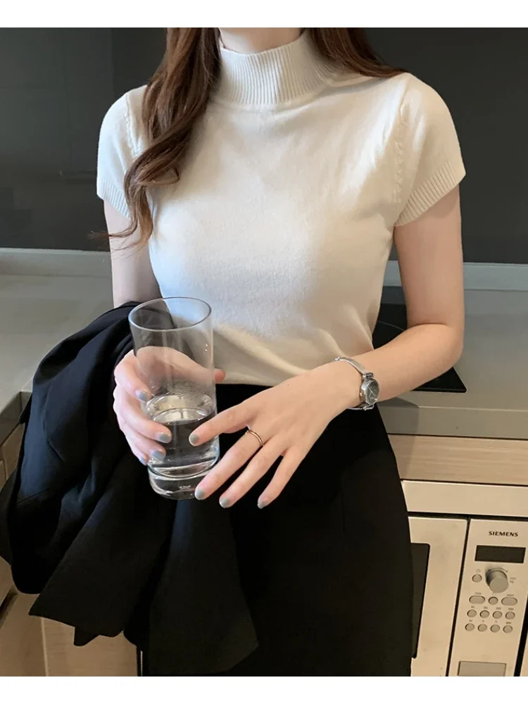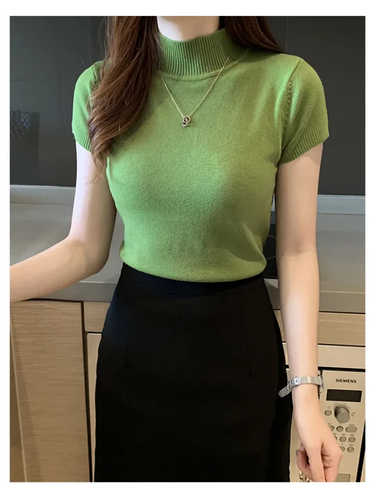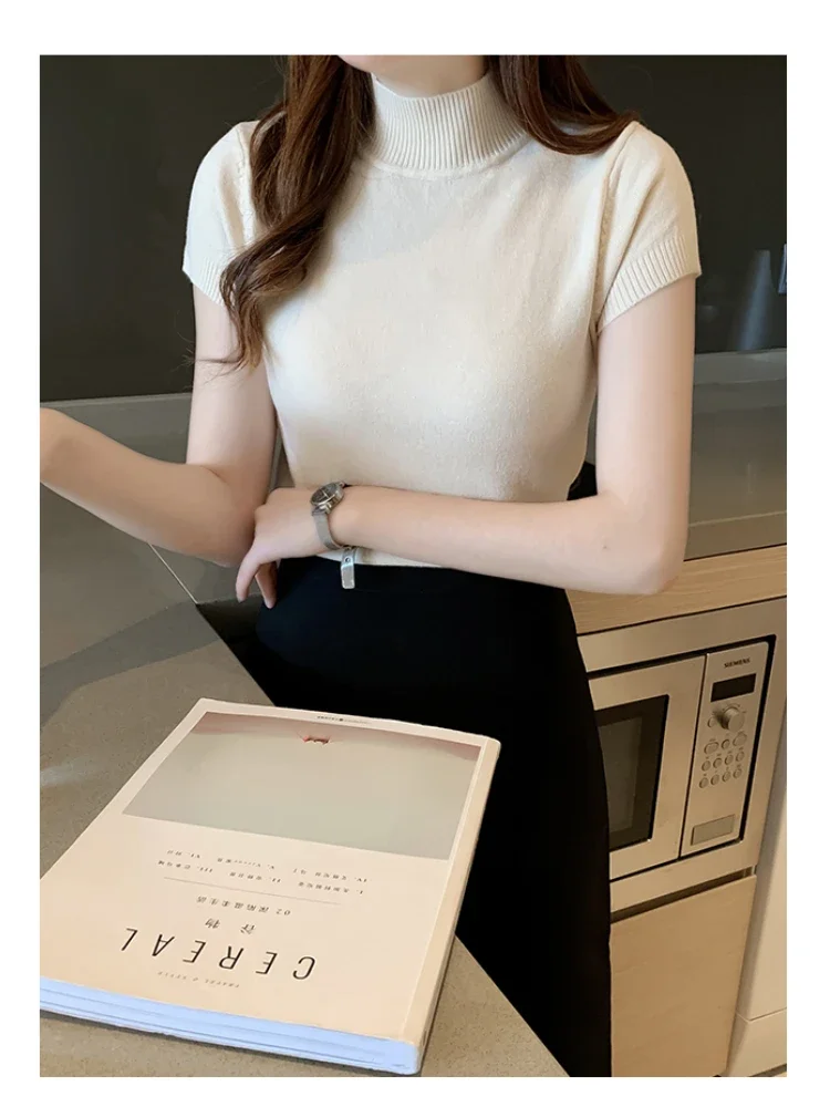 Znbbw Summer Half Turtleneck Slim Knitted T-shirt Women Elegant Solid Short Sleeve Casual Versatile Pullover Casual Skinny Tops