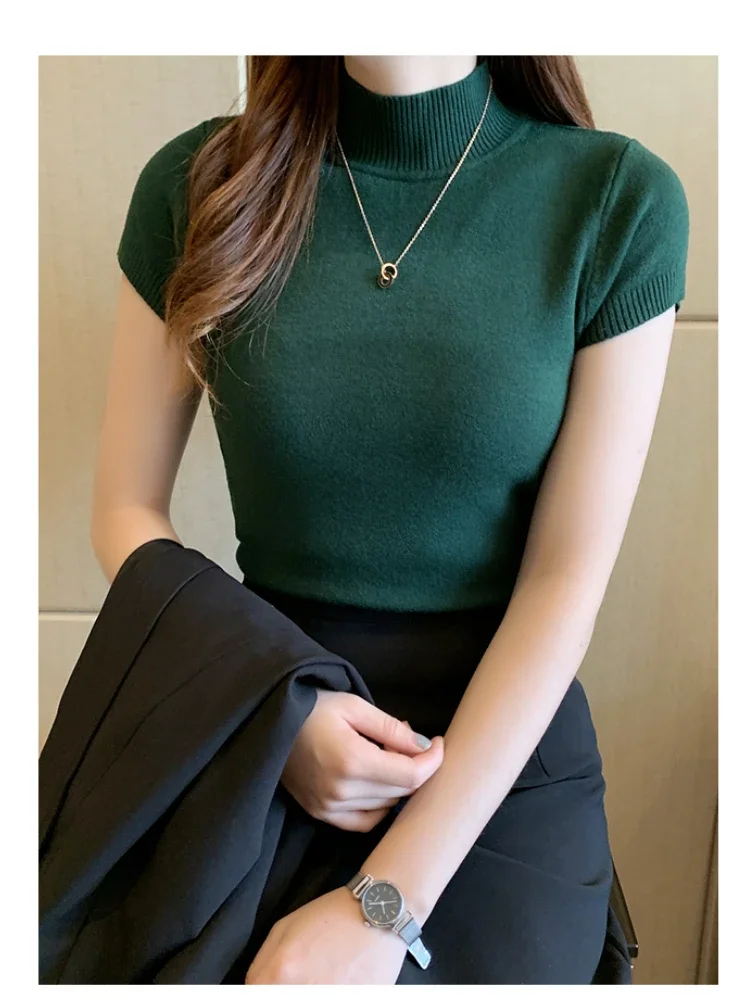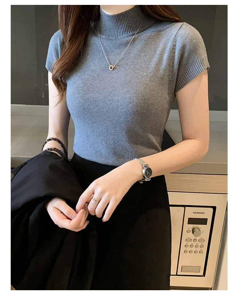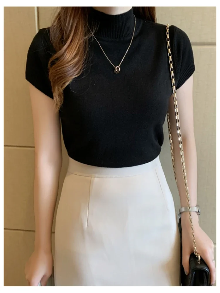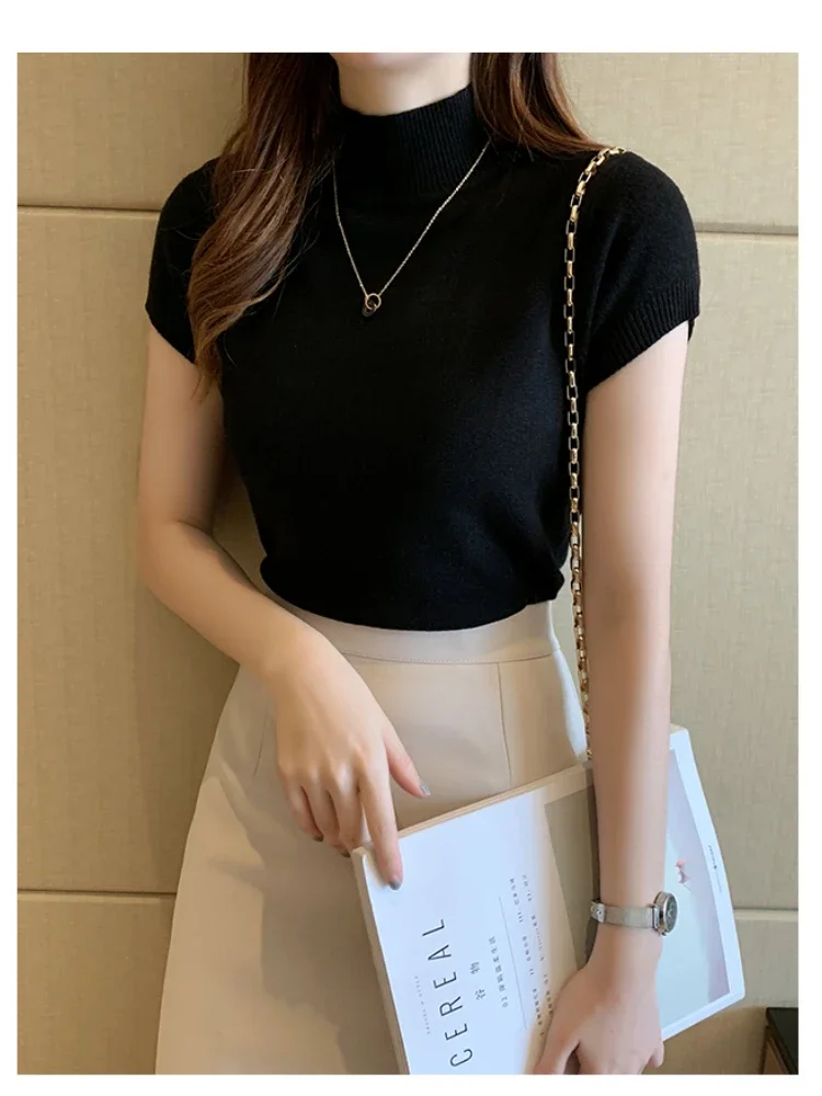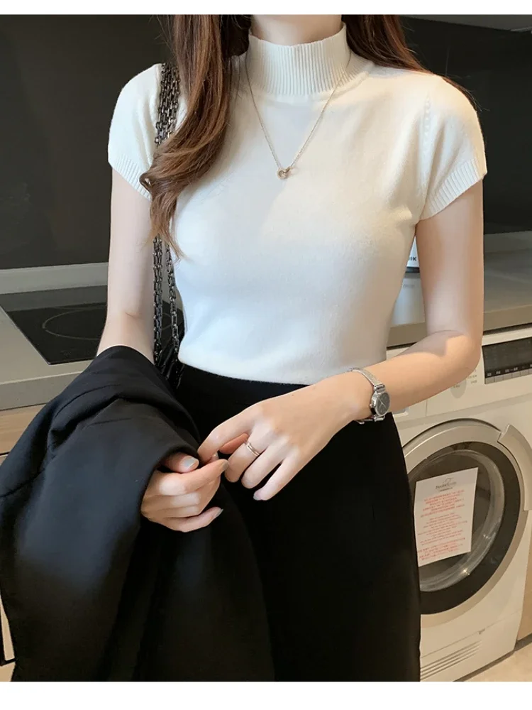 Znbbw Summer Half Turtleneck Slim Knitted T-shirt Women Elegant Solid Short Sleeve Casual Versatile Pullover Casual Skinny Tops
