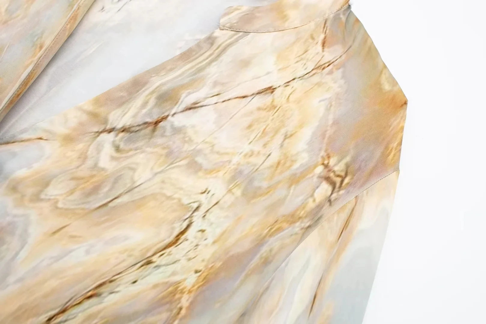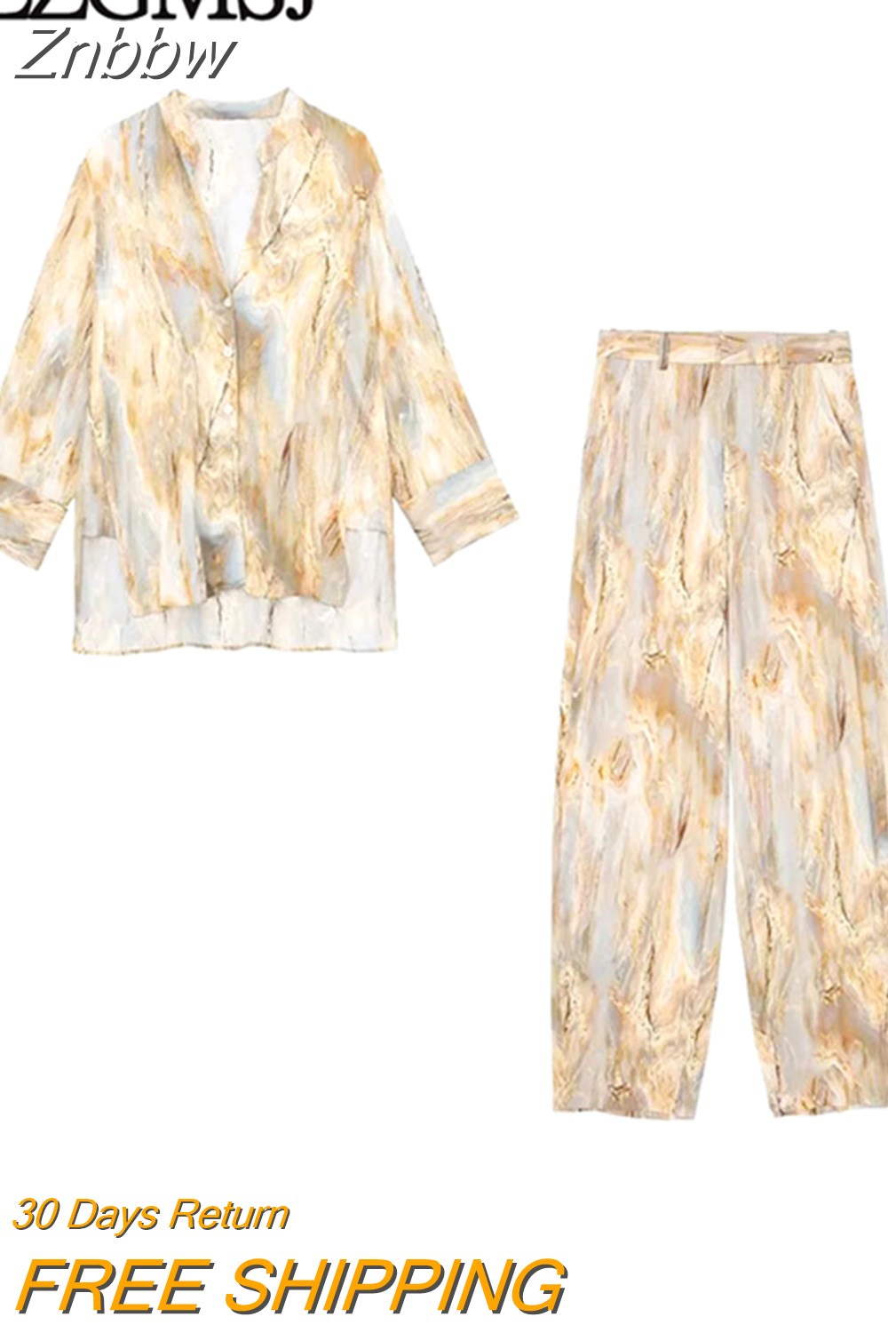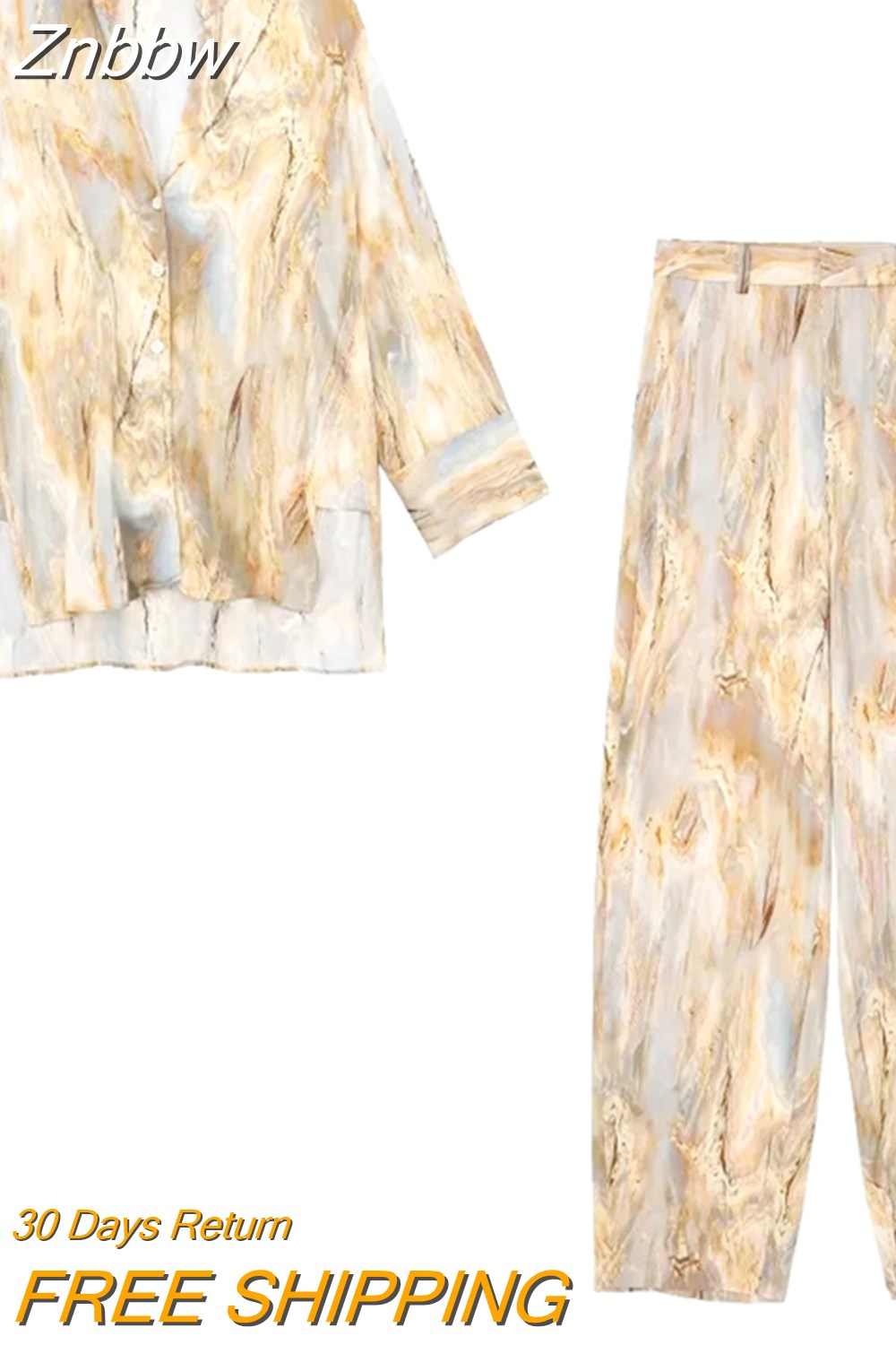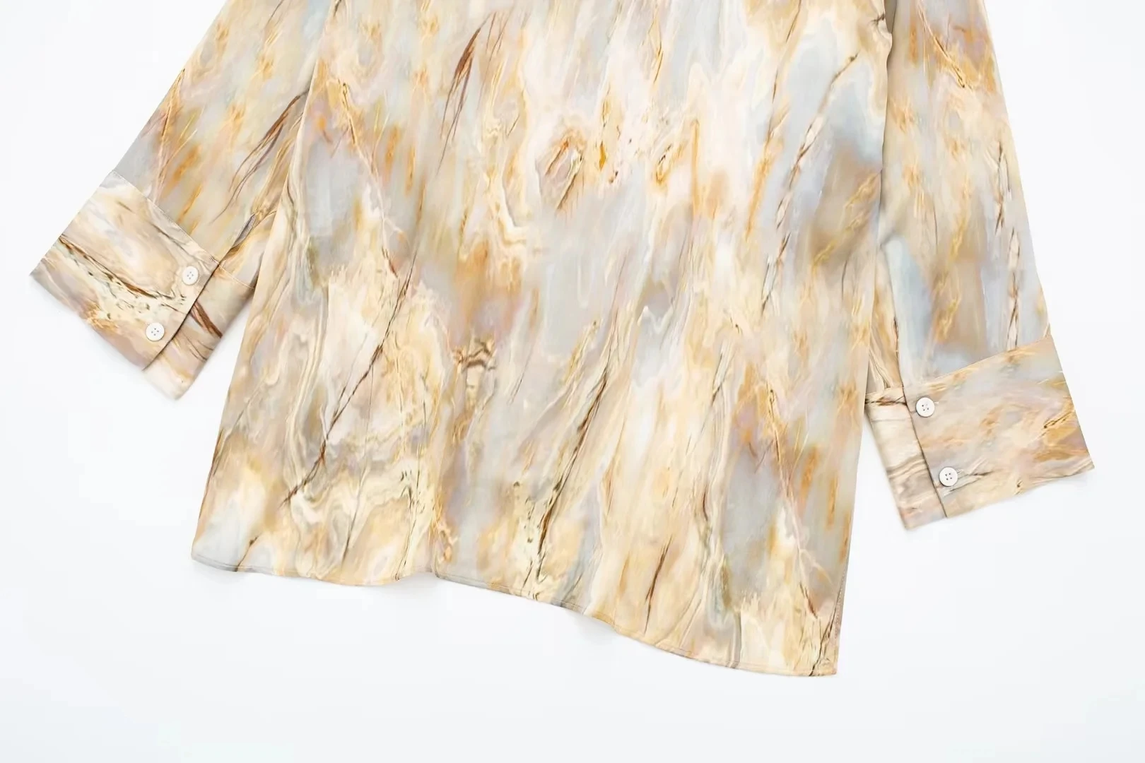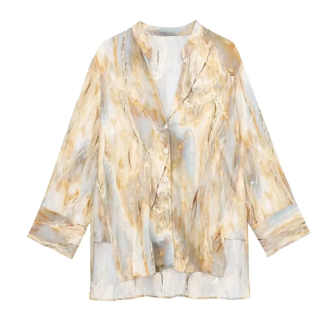 Znbbw TRAF Summer Tie Dye Print Women Casual Blouse V Neck High Low Hem V Neck Long Sleeve Satin Shirt Female Top