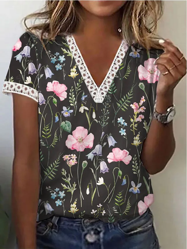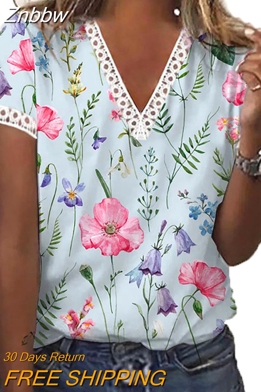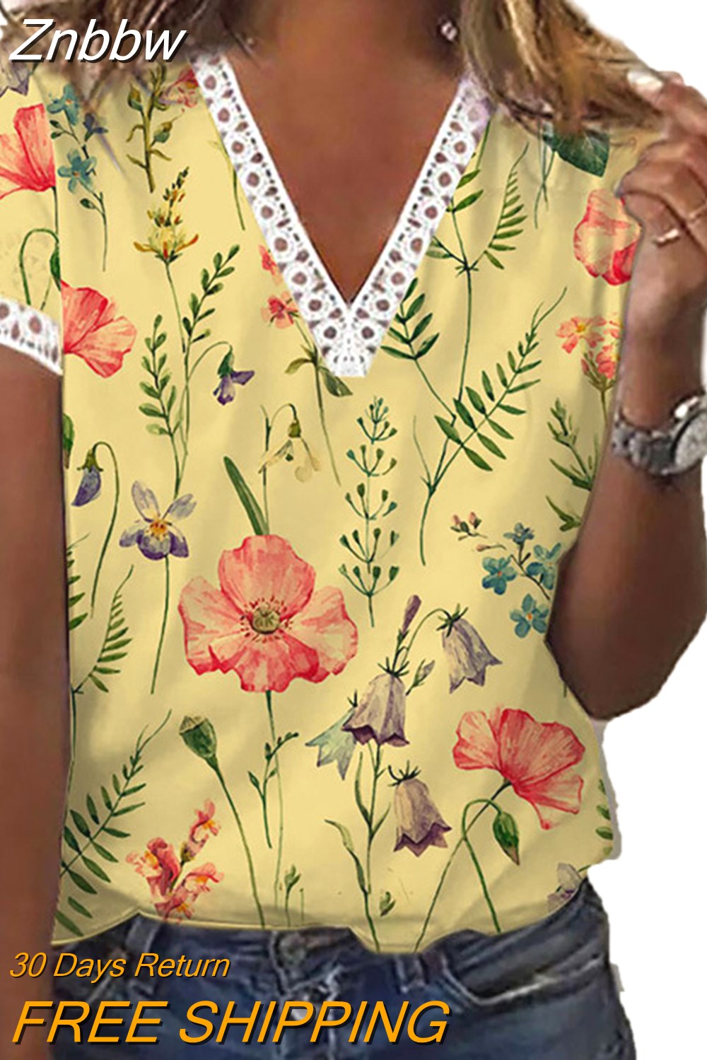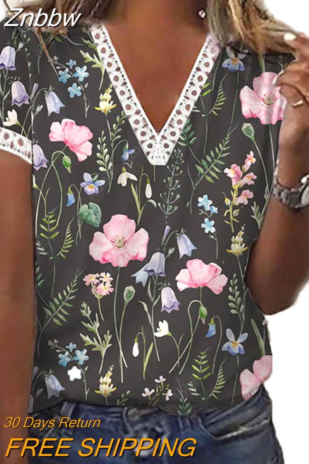 Znbbw V-neck Floral Print Blouse Women Short Sleeve Tops Fashion 2023 Cssual Shirts Female Loose Elegant Blouses Blusas 24785