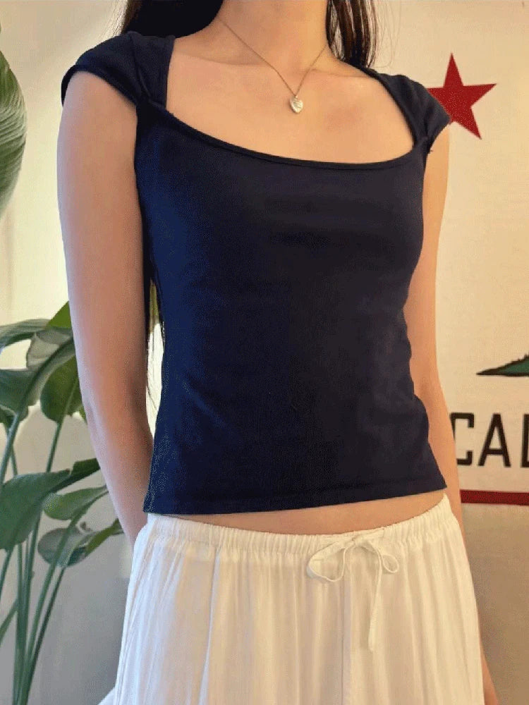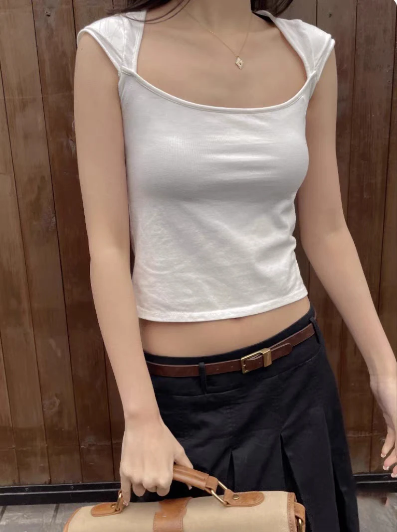 Znbbw White Square Collar T Shirt Women Summer Crimping Soft Cotton Short Sleeve Tees Cute Casual Simple Sweet Y2k Crop Top