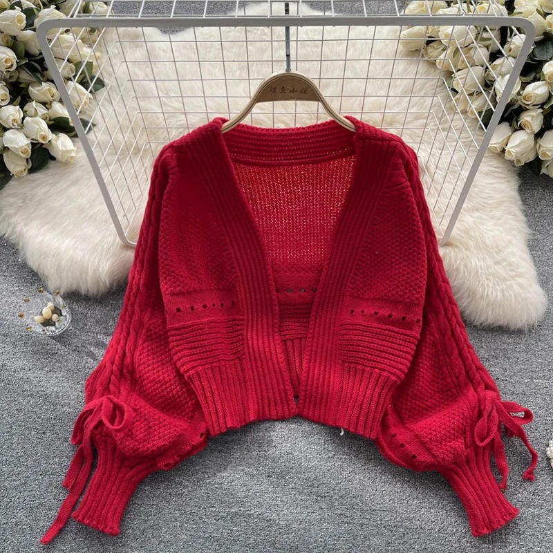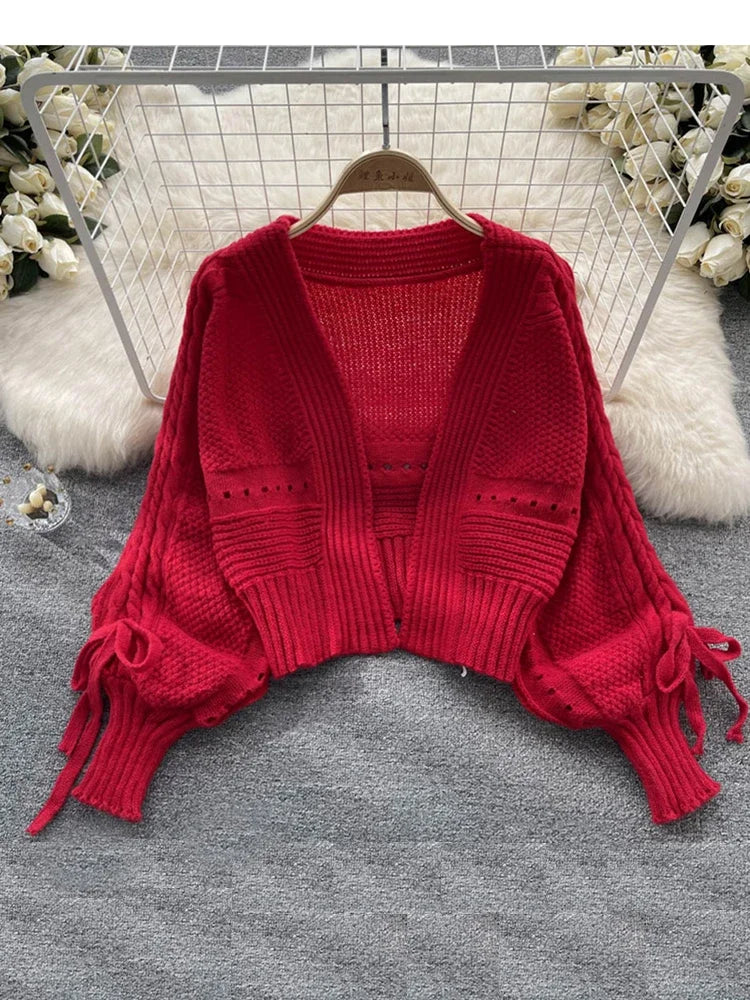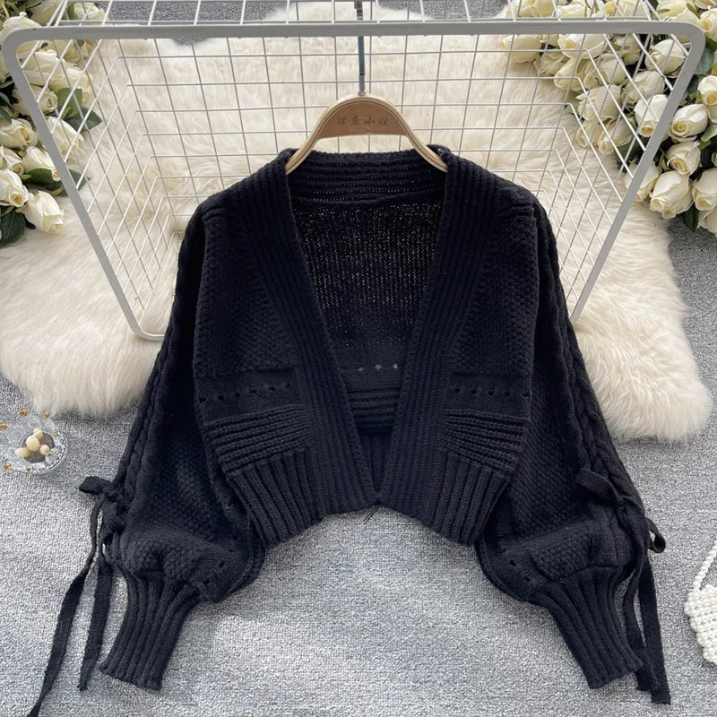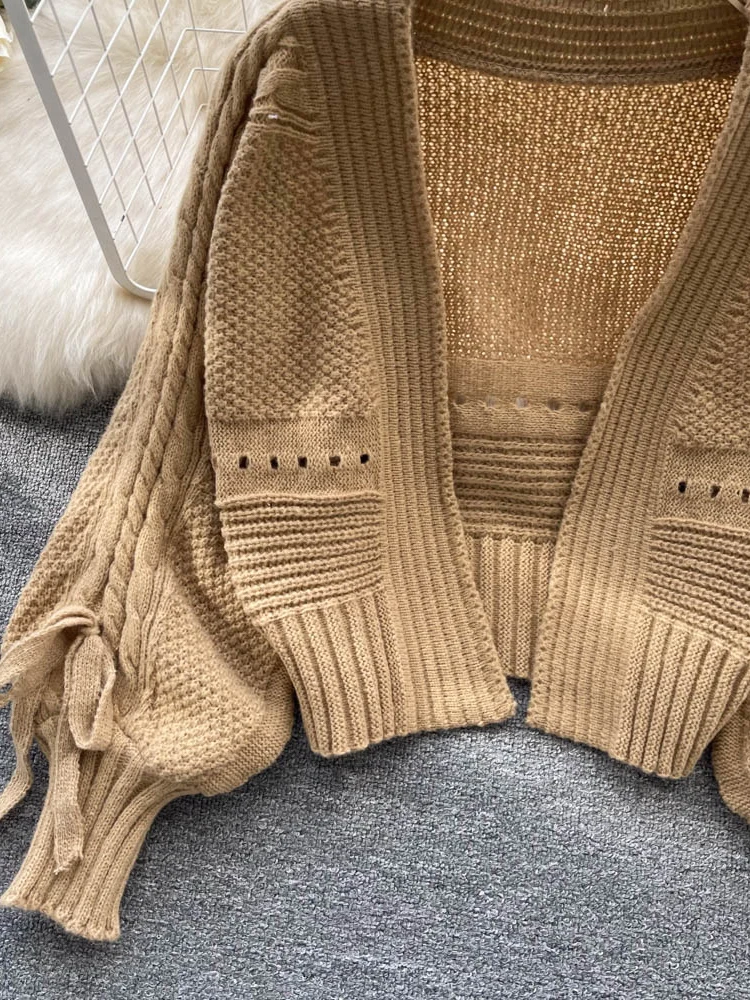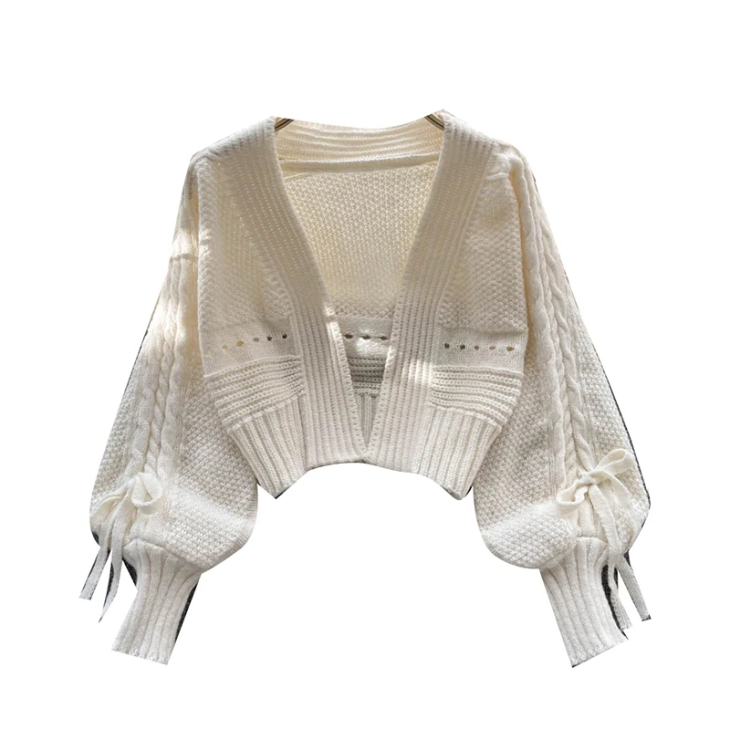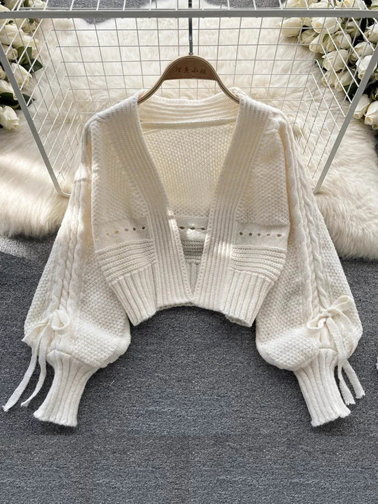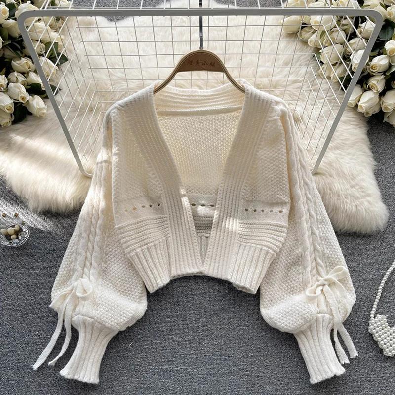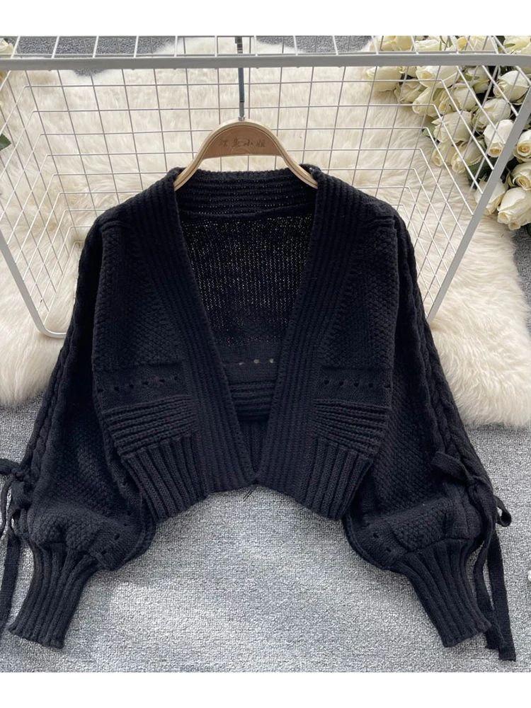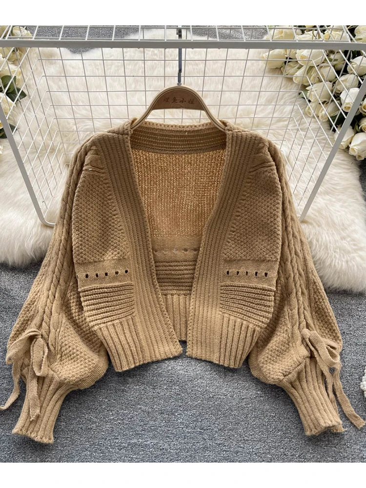 Znbbw Women Autumn Winter Cardigan Design Sense Lantern Sleeve Knitted Versatile Knitting Bow Tie Short Long Sleeve Shawl Top D2156