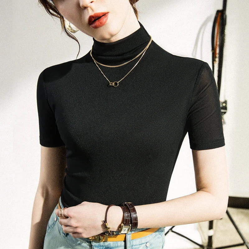 Znbbw Women Half Turtleneck Base Simple TShirts Slim Soft Short Sleeve T Shirts Lady Mesh Elegant Stretchy Tops Tees Female