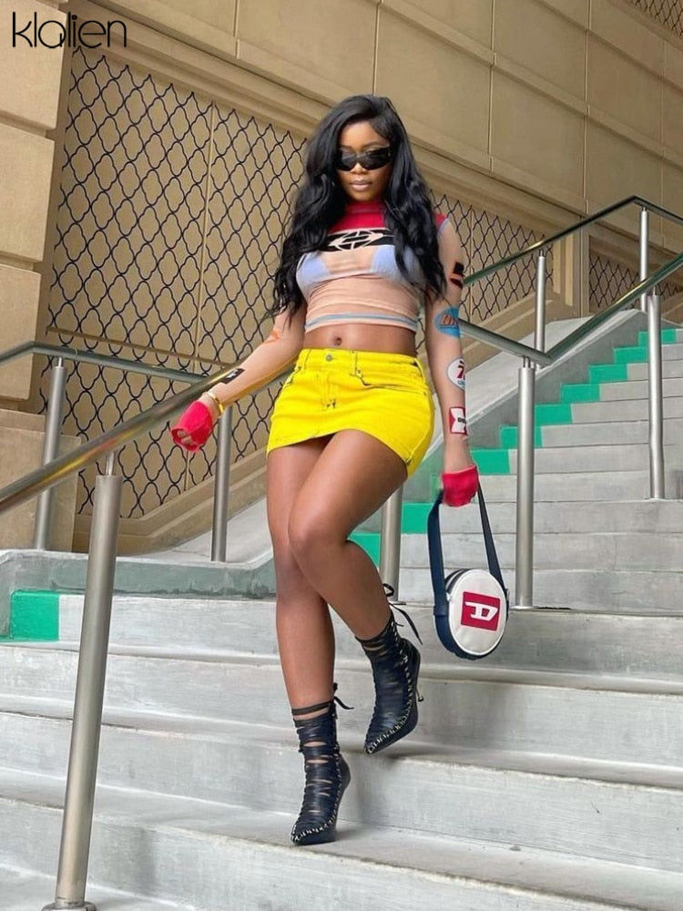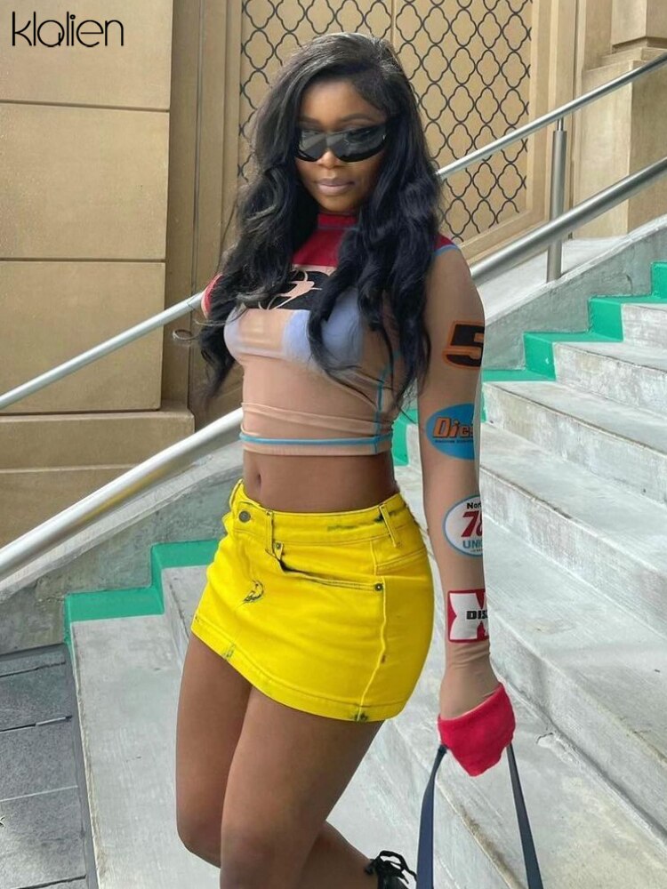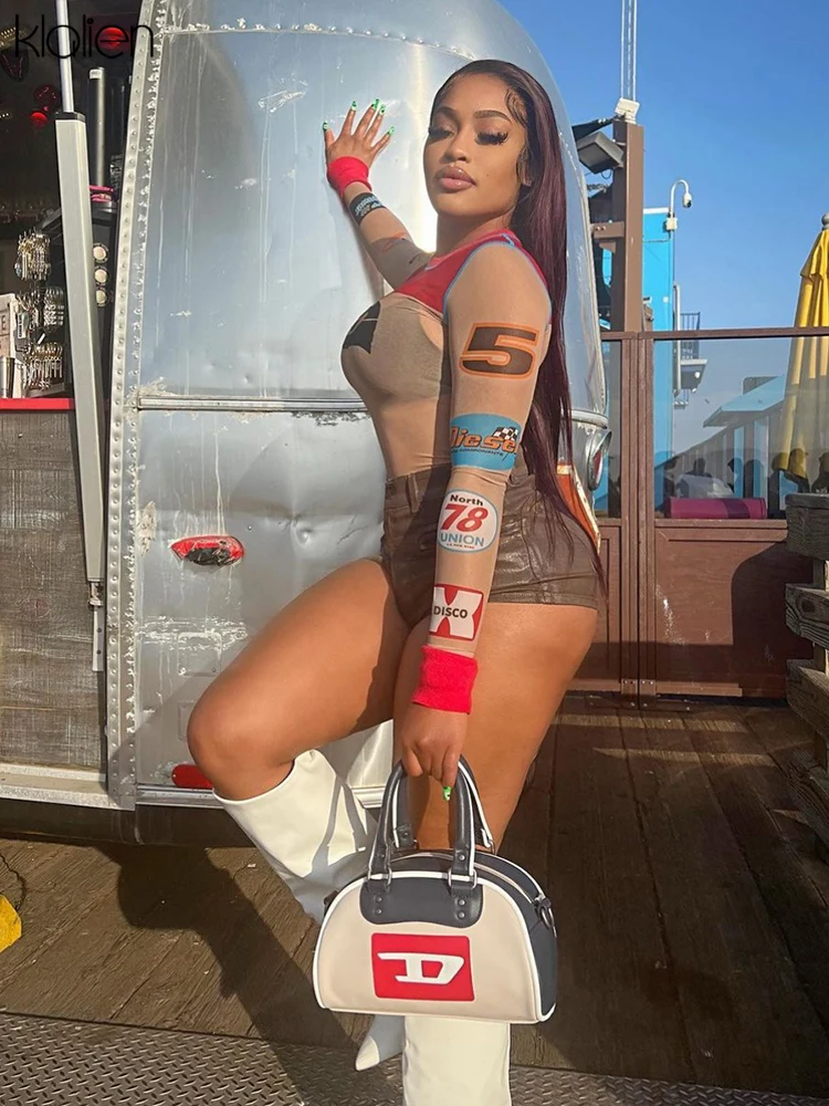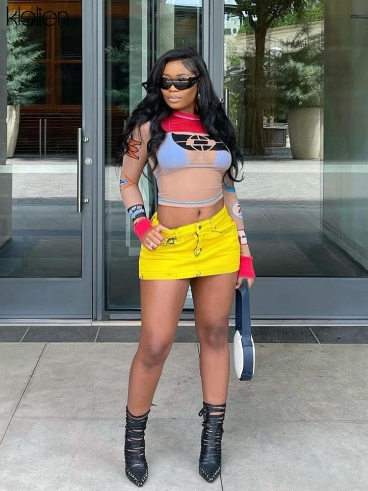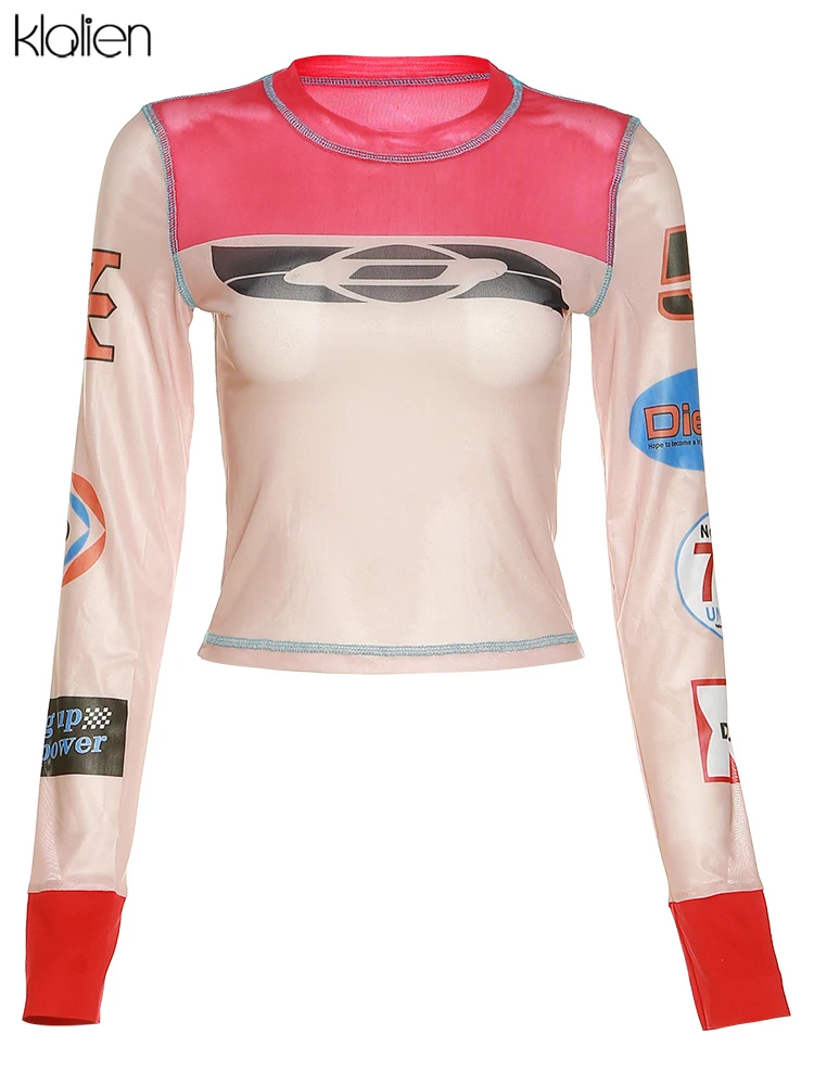Znbbw Women Print T-Shirt Fashion Casual Sexy See Through Mesh O Neck Long Sleeve Tee Female Streetwear Wild Slim Stretch Top