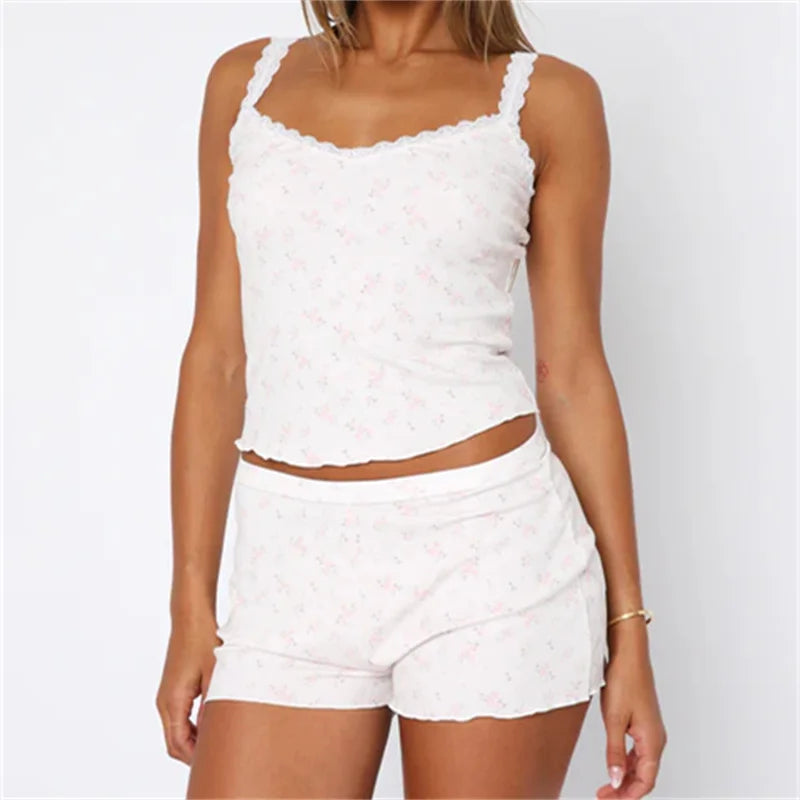 Znbbw Women Sexy 2 Piece Pajama Set Heart Print Sleeveless Lace Trim Crop Cami Top and Shorts Pj Set Y2K Sleepwear Lounge Outfits