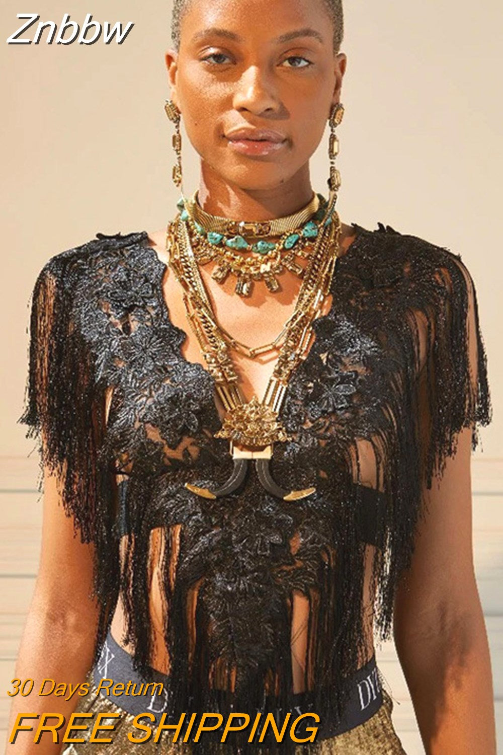 Znbbw Women Sexy Lace See Through V Neck Party Club Black T Shirt Tops 2023 Summer Clothes Wholesale Items For Business 0410