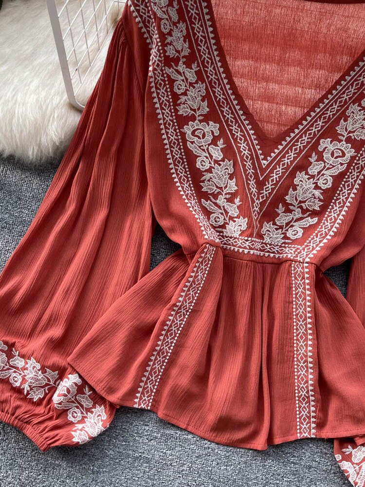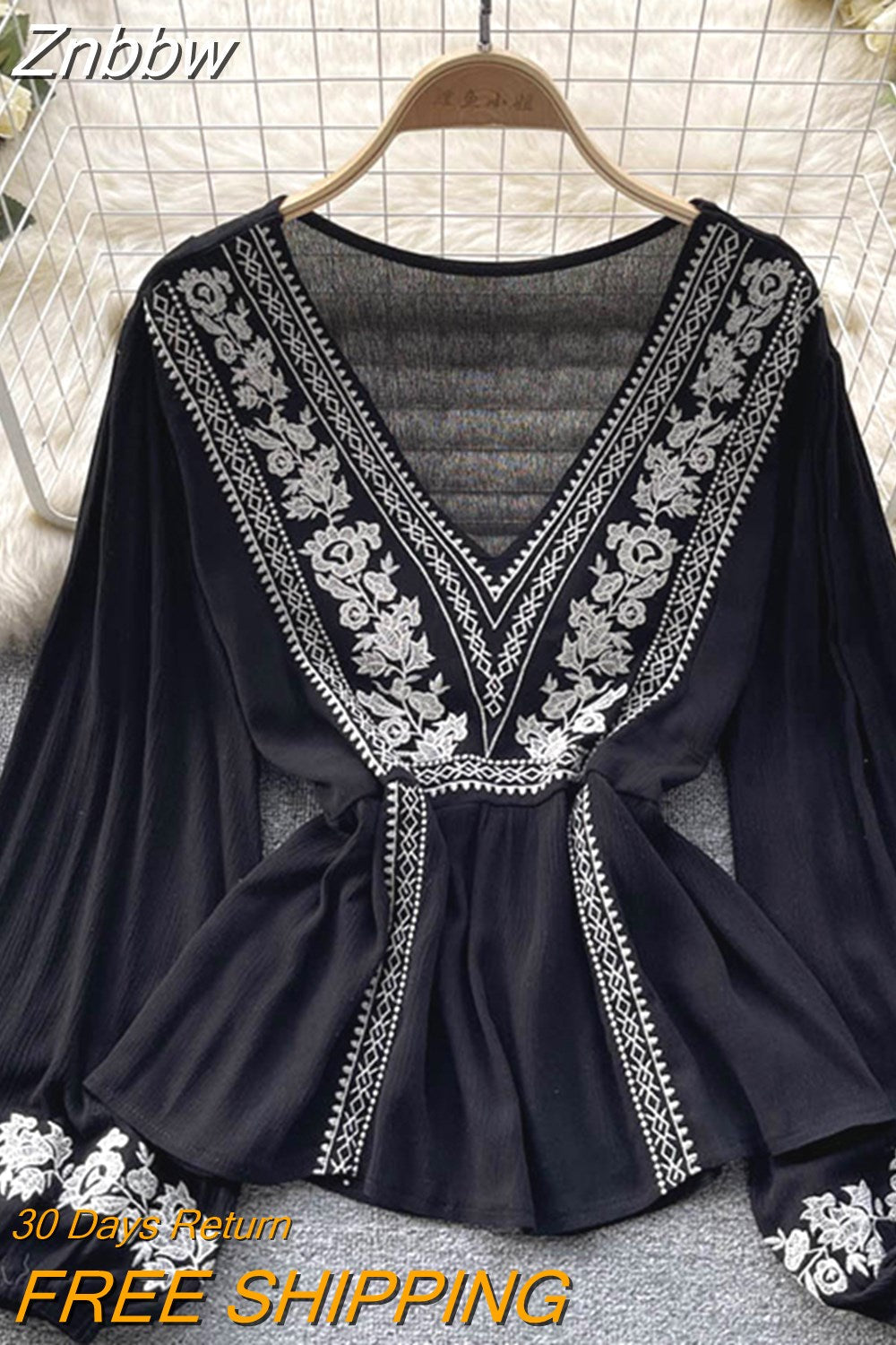 Znbbw Women Spring Summer Blouse French Minority Ruffle V-neck Lantern Sleeve Shirt Design Sense Printed Chic Temperament Top D2531