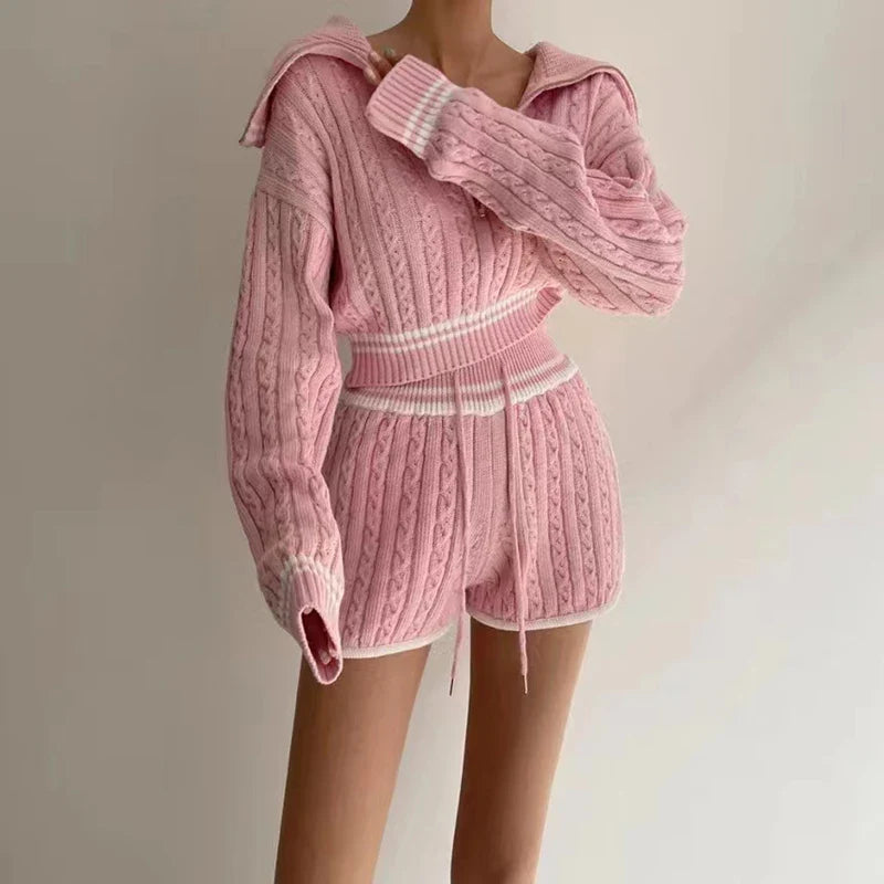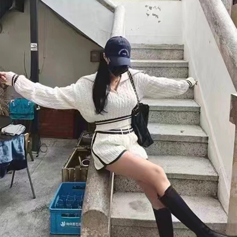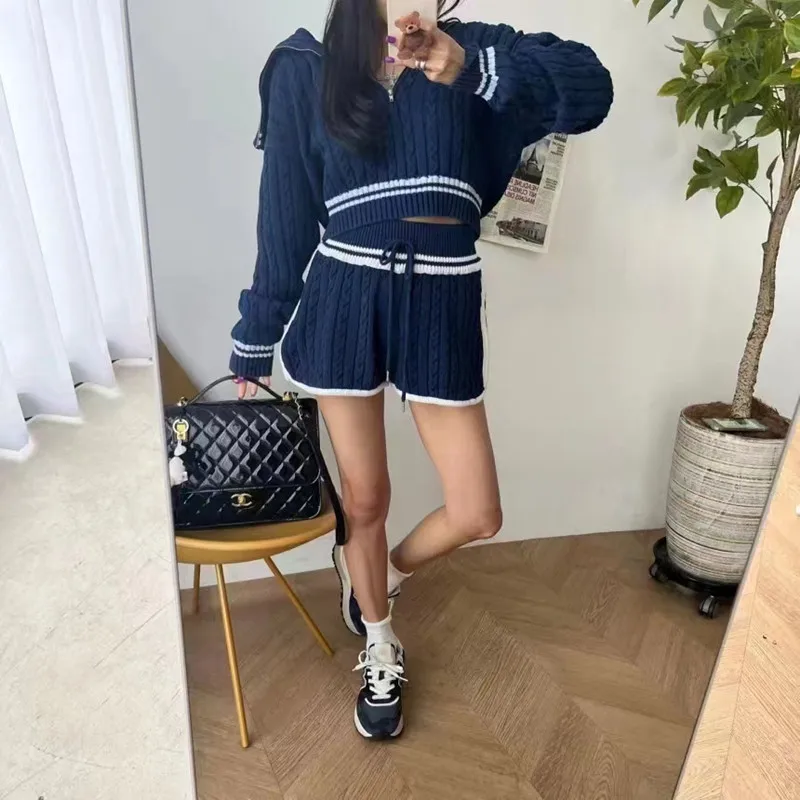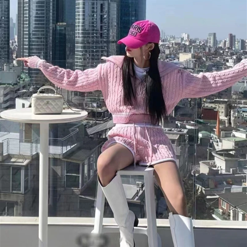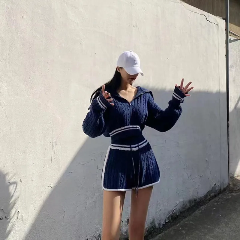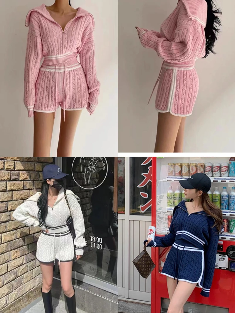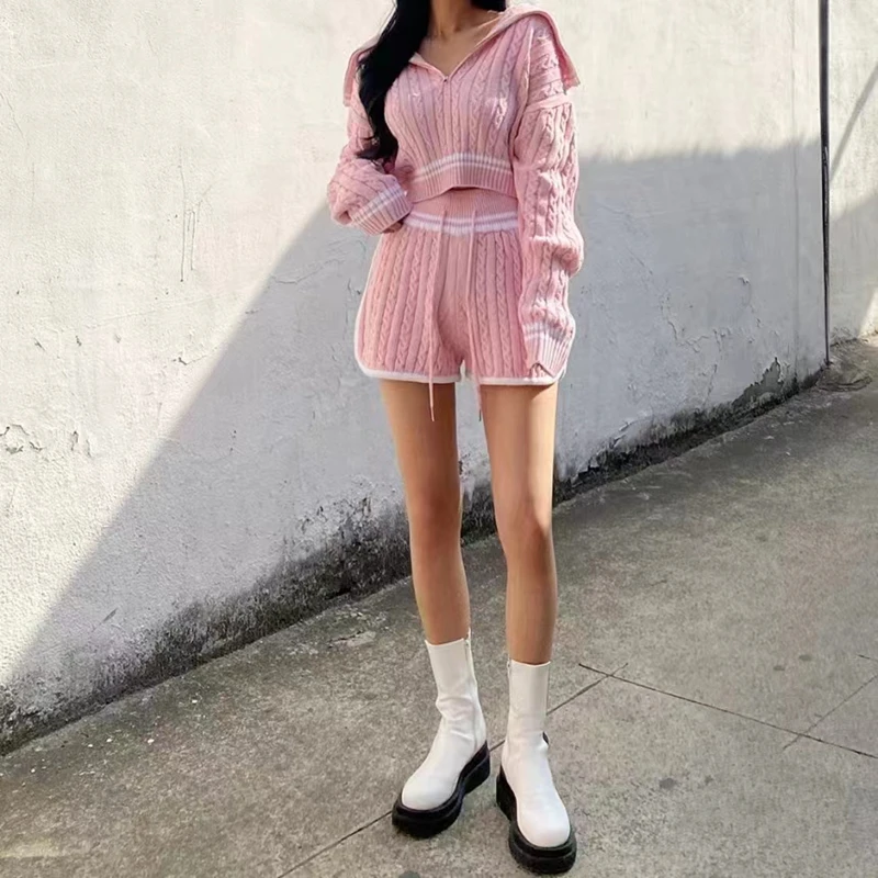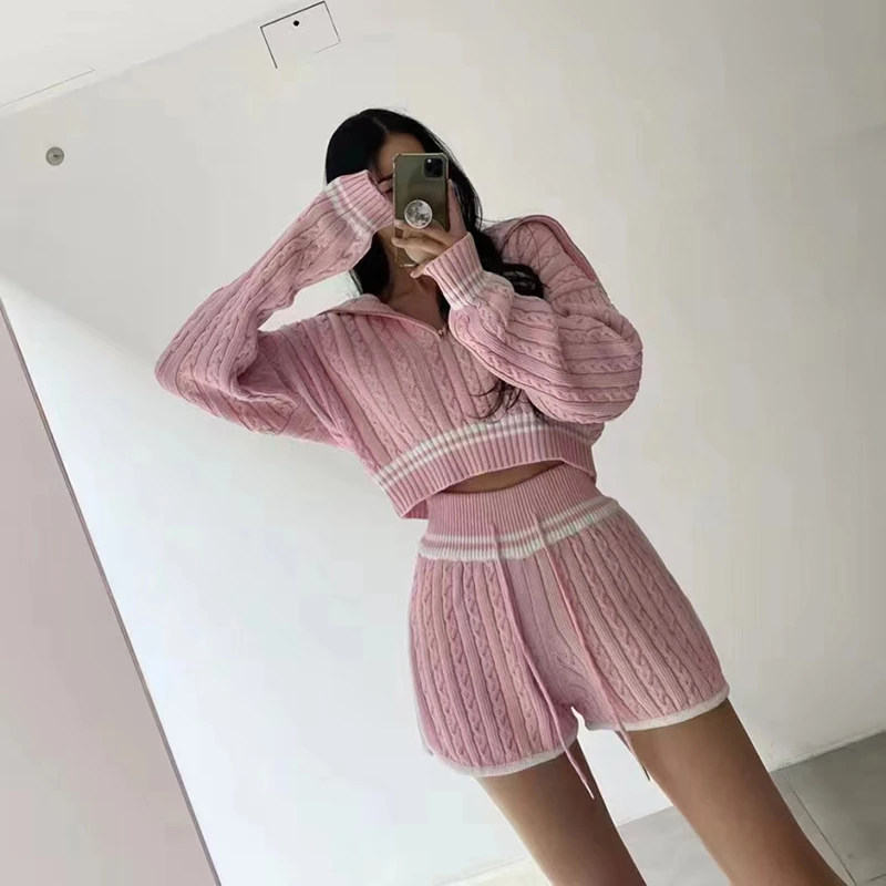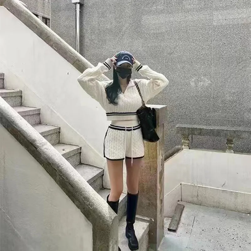 Znbbw Women Twist Knit 2 Piece Set Korean Fashion Zipper Loose Long Sleeve Tops Casual All Match Female High Waist Shorts Sets