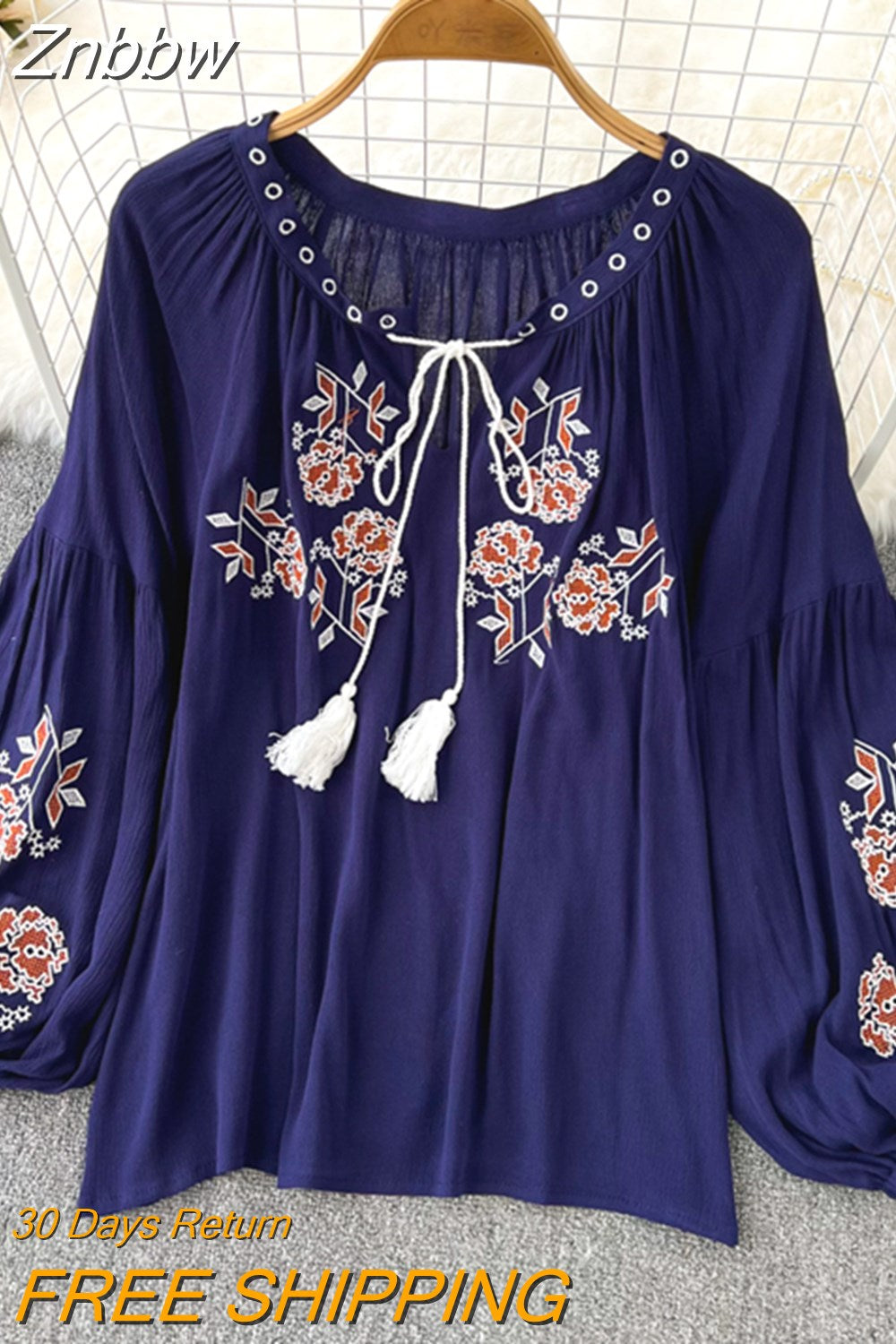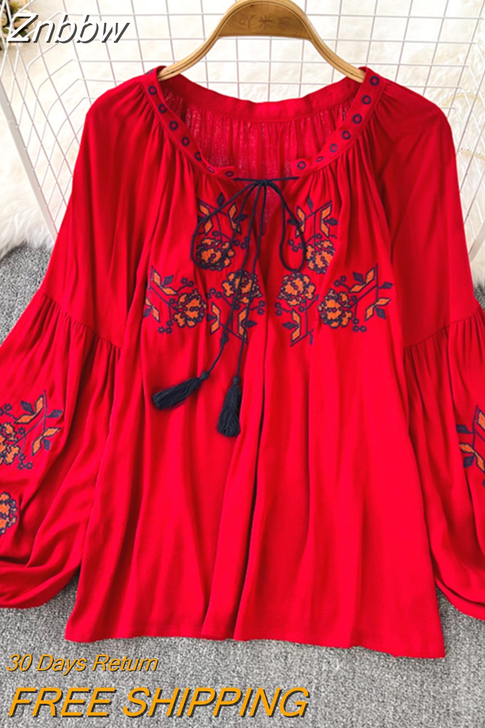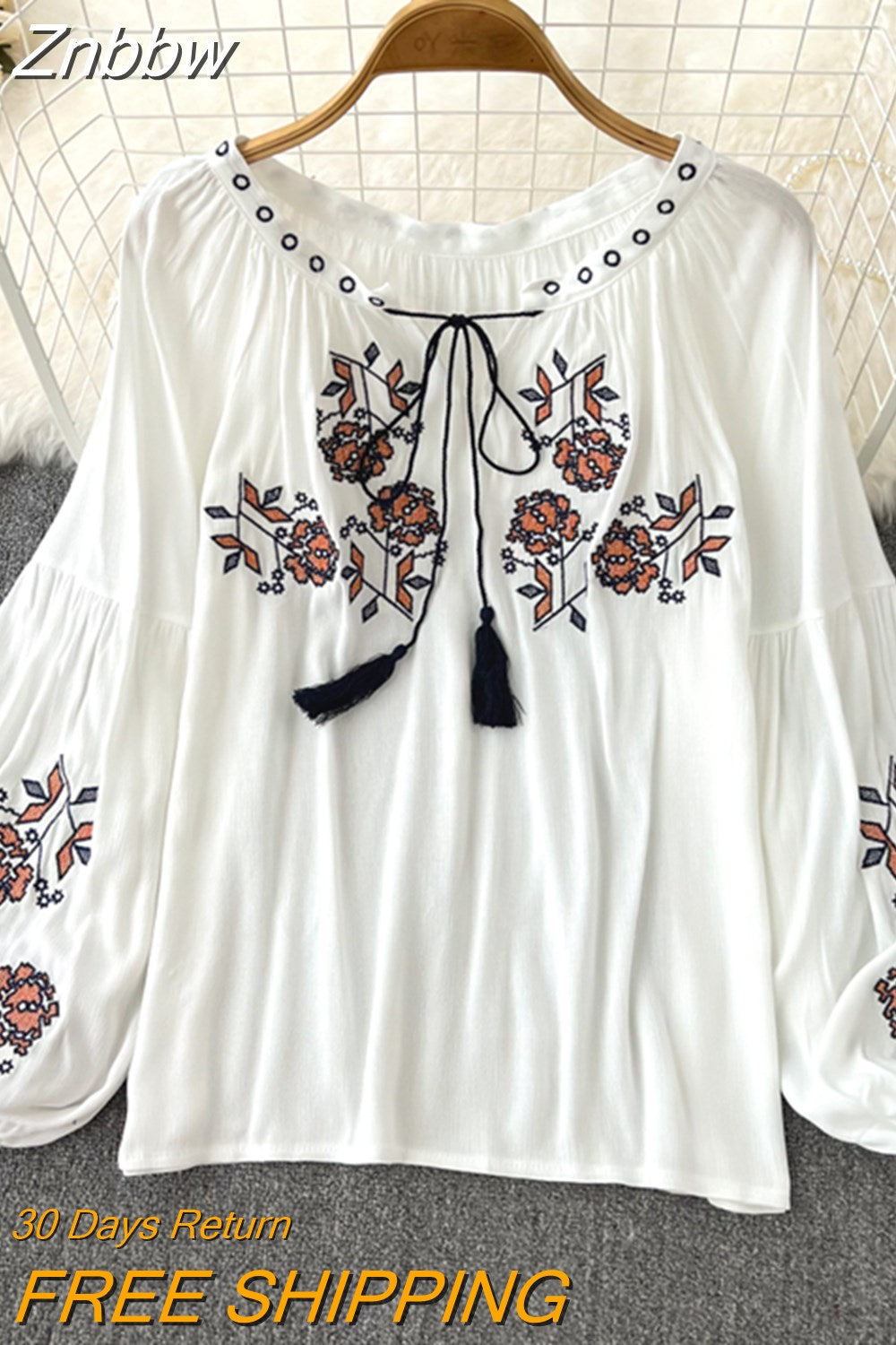 Znbbw Women's Retro Blouse National Style Embroidered Lace-Up Tassel V-Neck Lantern Sleeve Tops Loose All-Match Female Blusa G05
