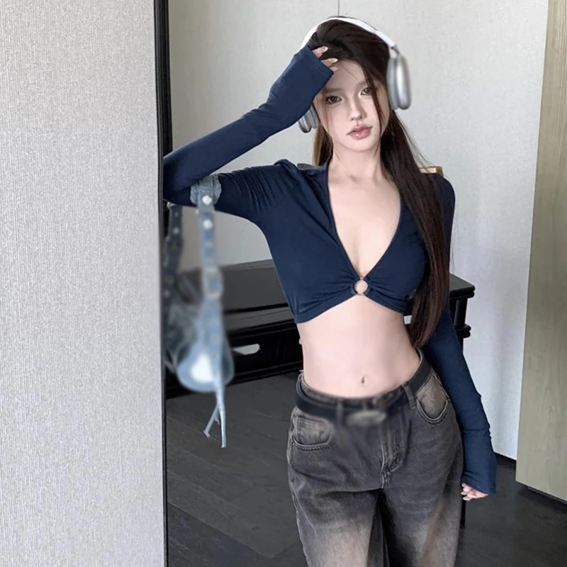 Znbbw Women's Tops Korean Solid V-neck Hollow Slim Fit Sexy Naked Long Sleeve T-shirt Top