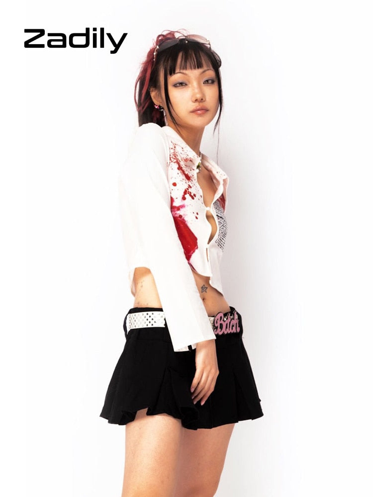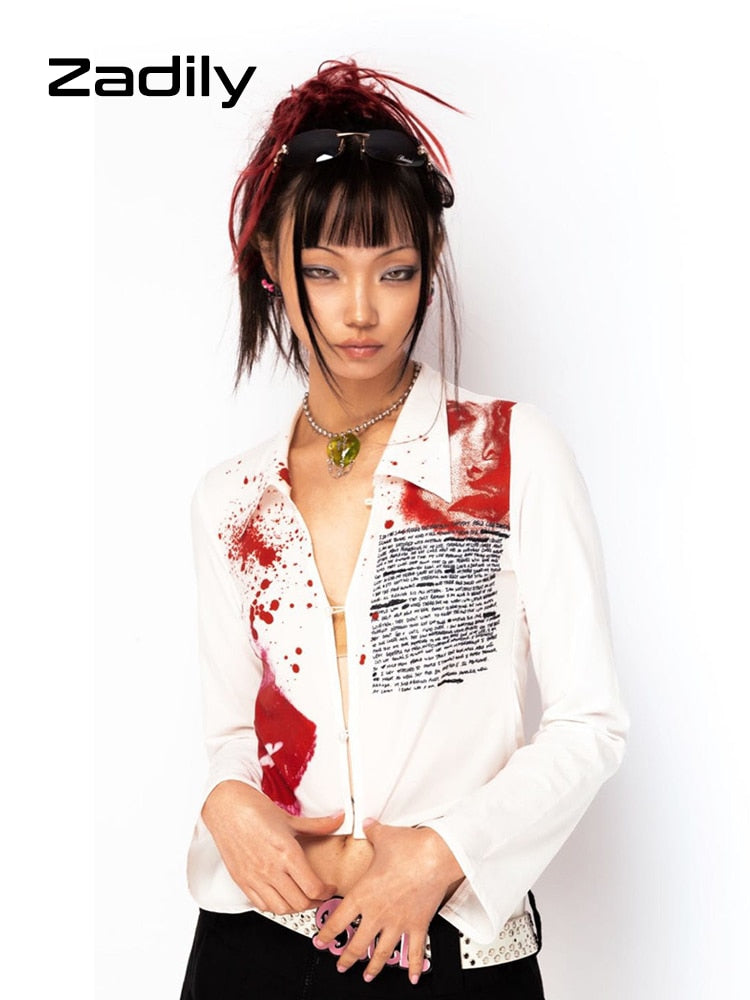 znbbw Y2K Bloodstain Print Long Sleeve Shirt Women Sexy Slim Button Female emo Crop Top Shirts 2023 Summer Club Blouse Tops