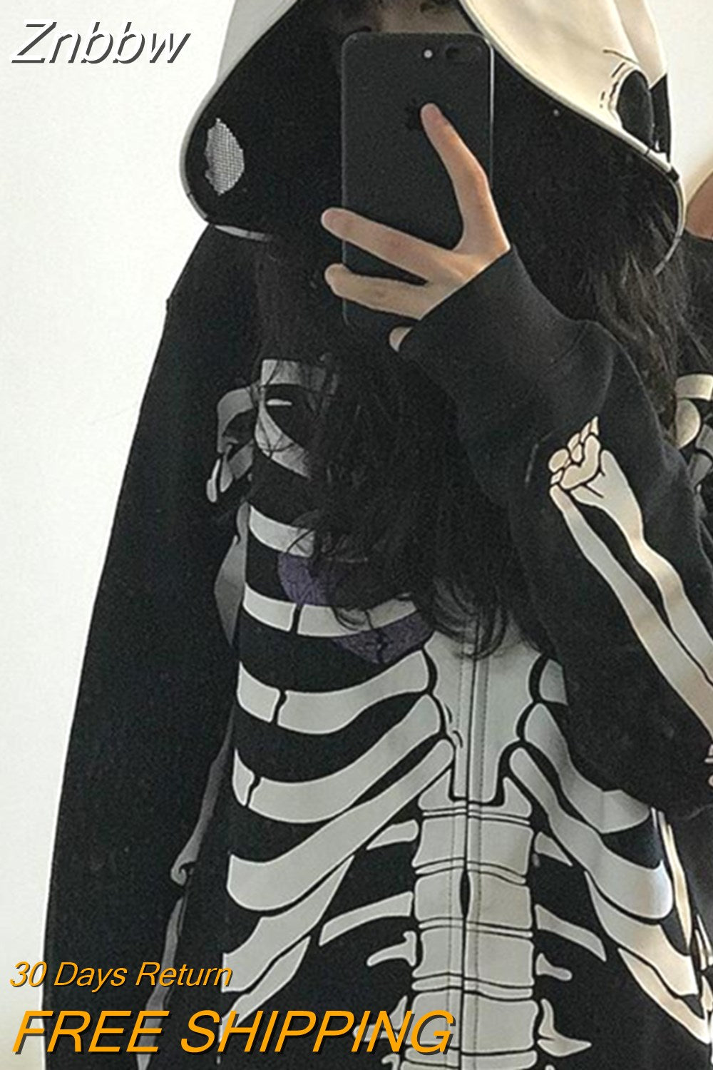 Znbbw Y2K Gothic Zip Up Hoodies Women Punk Oversized Skull Skeleton Print Sweatshirts Black Hip Hop Loose Tops Jacket Grunge