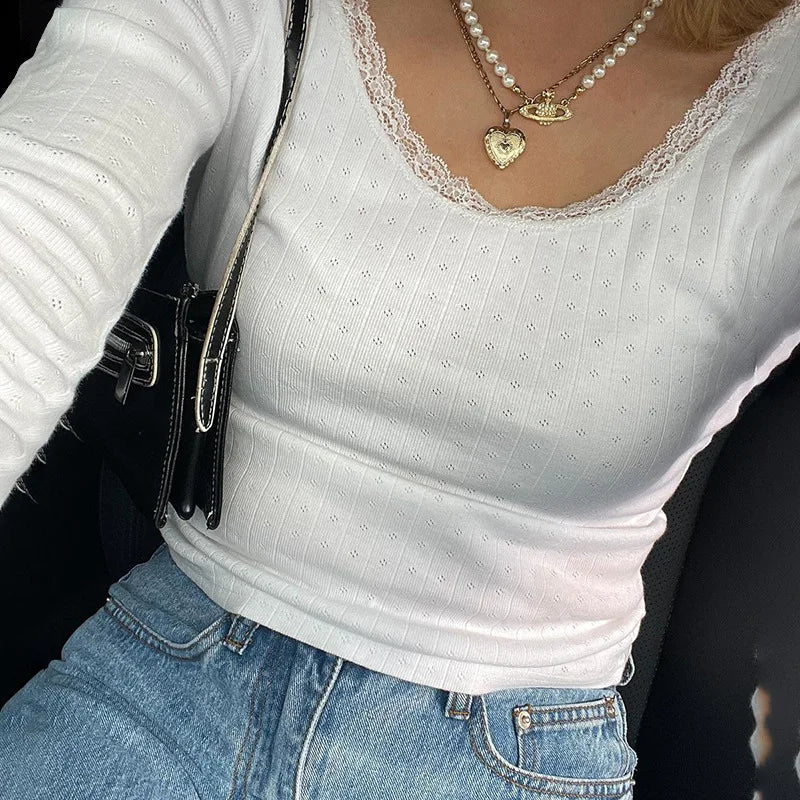 Znbbw y2k Hook Lace Frill Crop Top Full Sleeve White O Neck Cute Tee Women Aesthetic Korean Fashion Harajuku Basic T Shirt 90s