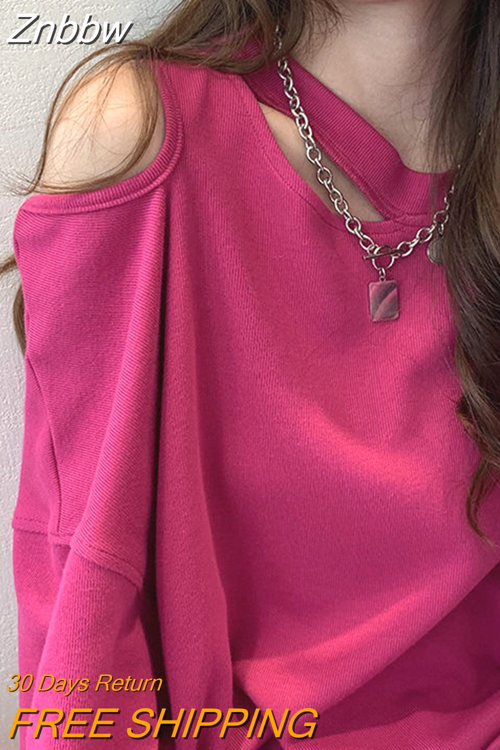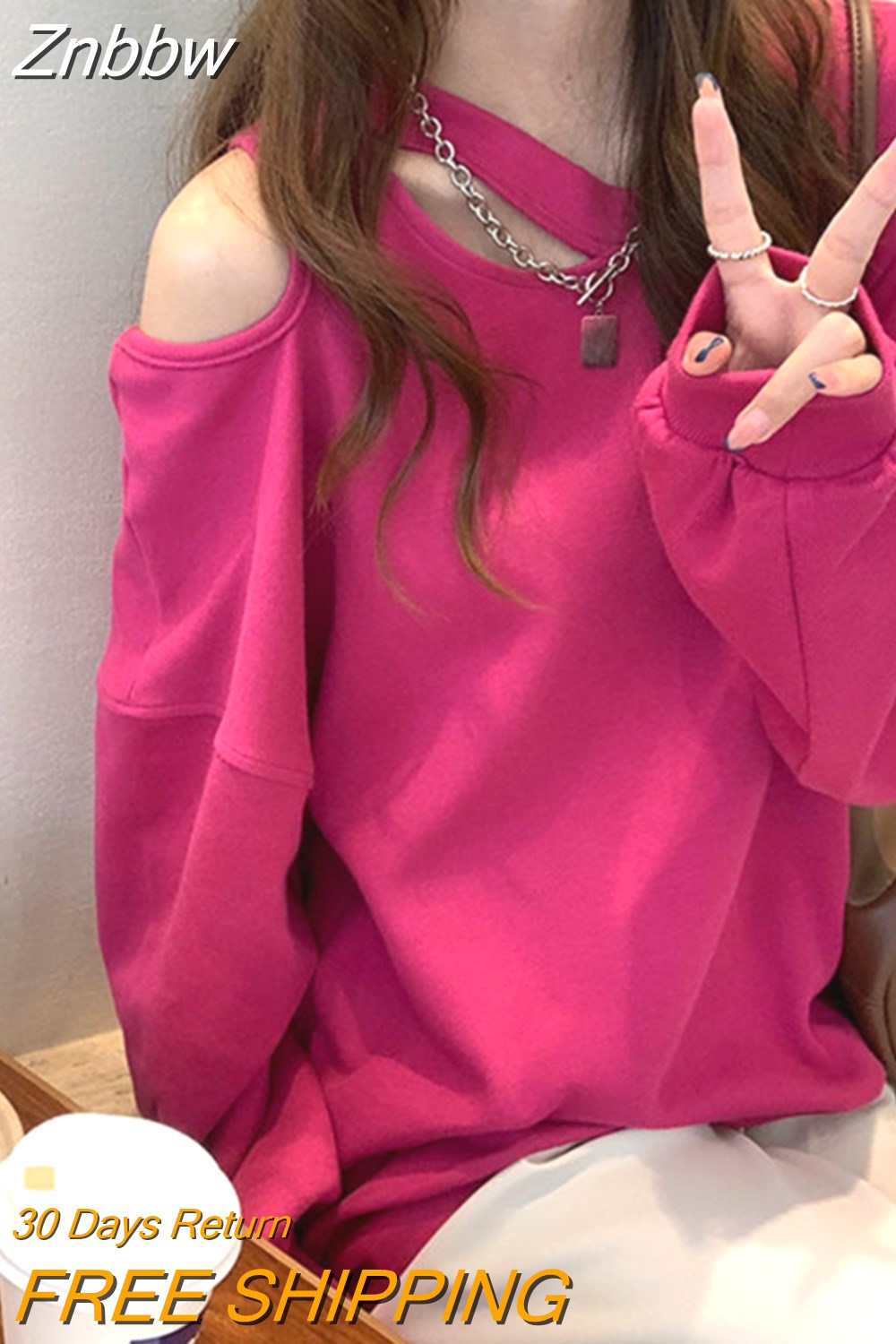 Znbbw Y2K Korean Style Pink Hoodies Women Sexy Off Shoulder Sweatshirts Green Loose Hollow Out All-match Crewneck Tops E-girl