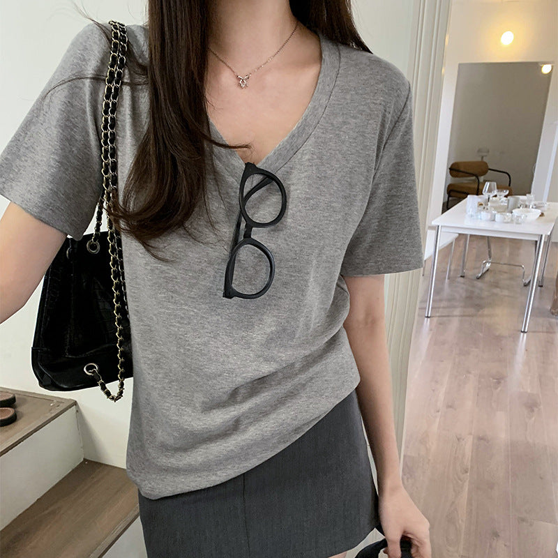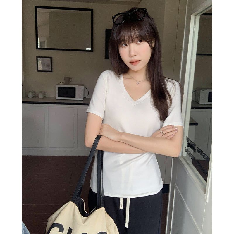 Basic White V-Collar Casual Short-Sleeved T-Shirt Women's New Summer Design Niche Shoulder Blouse