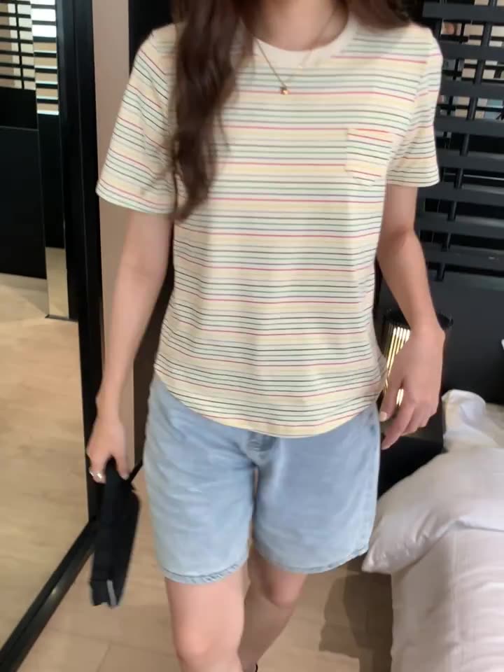 College Style Rainbow Striped Round-Neck T-Shirt Women's Summer Loose Style Vintage Blouse Design Sense Minority