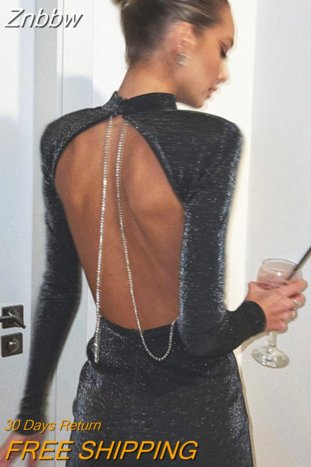 Znbbw 2023 Autumn New O Neck Full Sleeve Dress For Women Robe Fashion Black Backless Diamond Chain Party Mini Dress Vestido