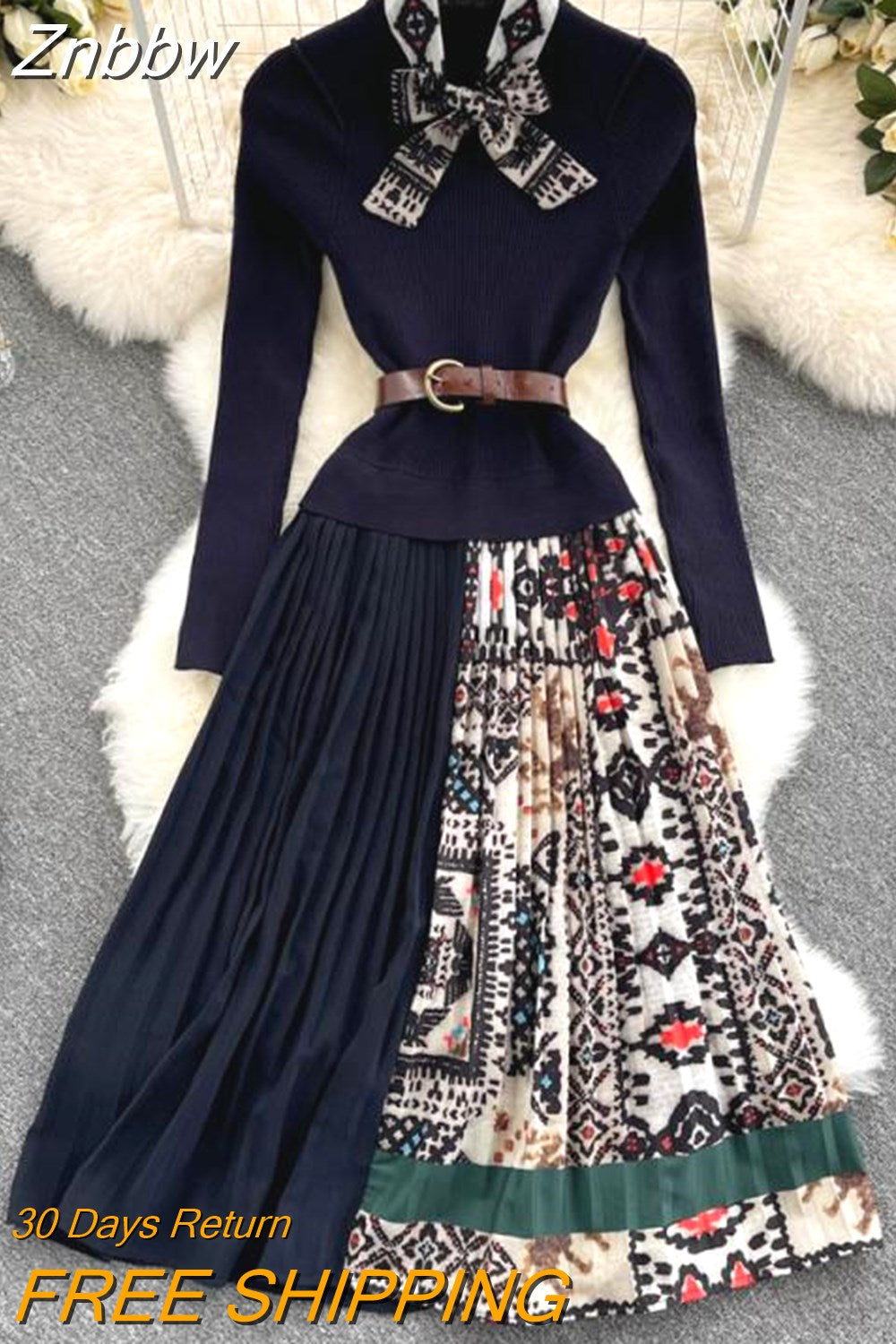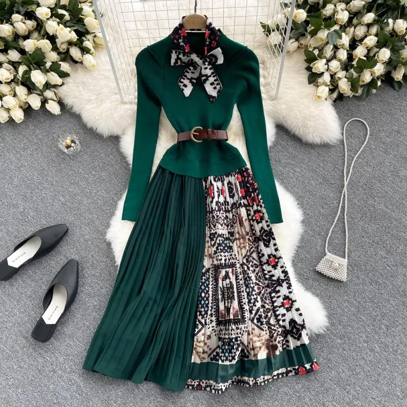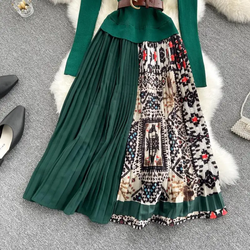Znbbw 2023 Autumn Winter Fashion Runway Vintage elastic Knitted Dress Women Long Sleeve Patchwork Pleated Belted Midi Dress