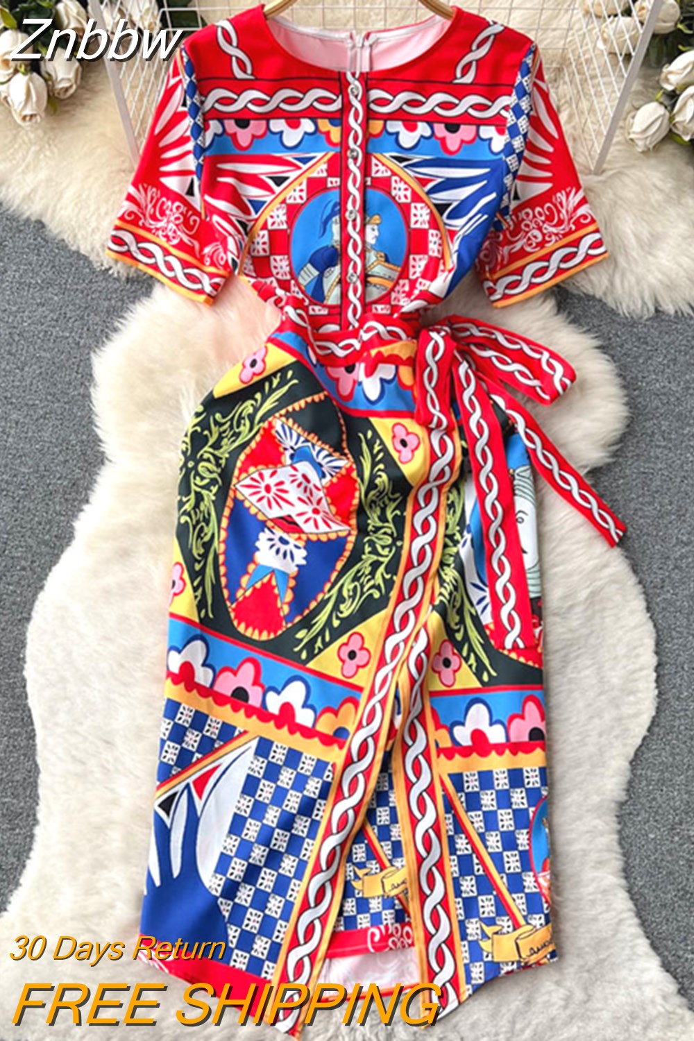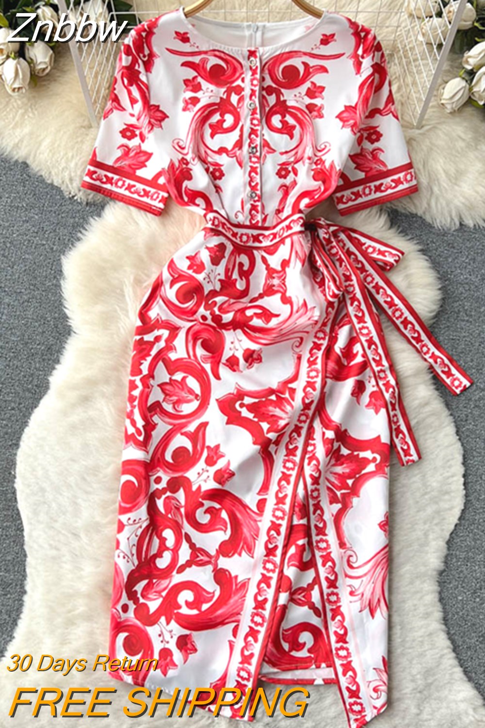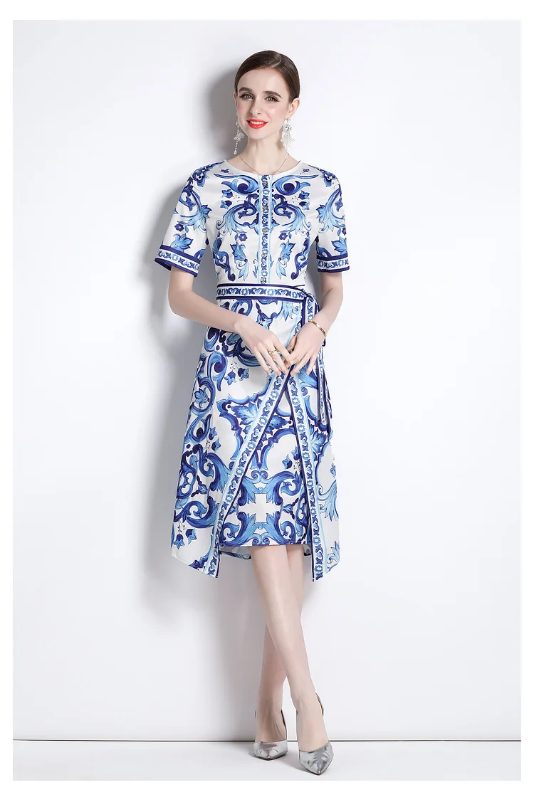 Znbbw 2023 Summer Blue and white porcelain Midi Dress Women's Round Neck Short Sleeve Lace Waist Slim Package Hip Dress
