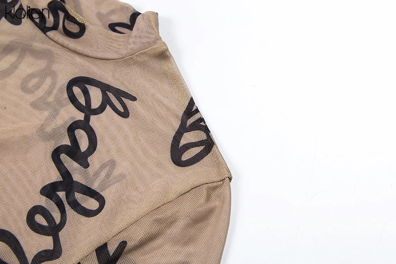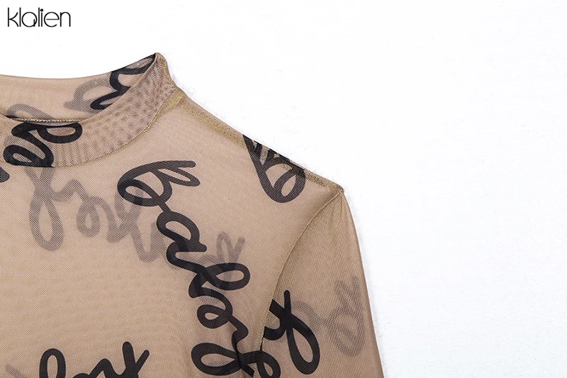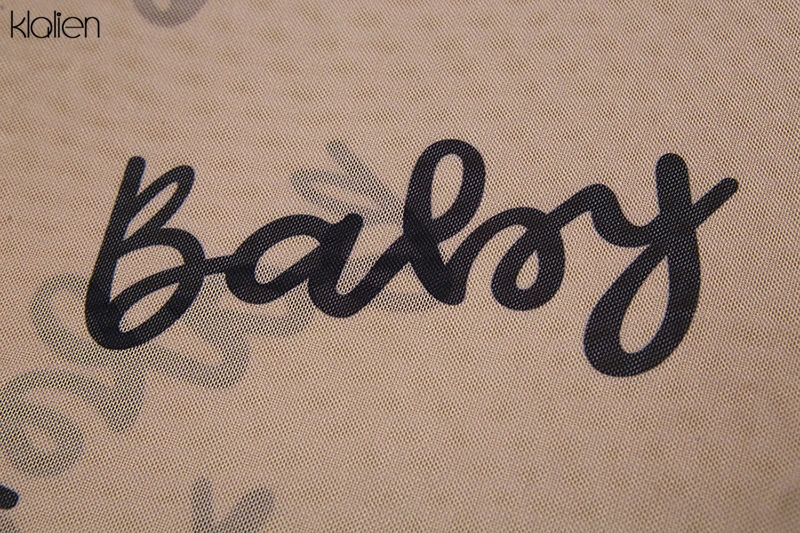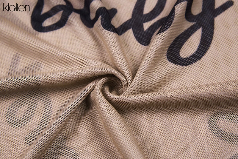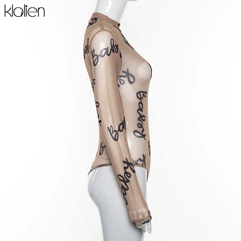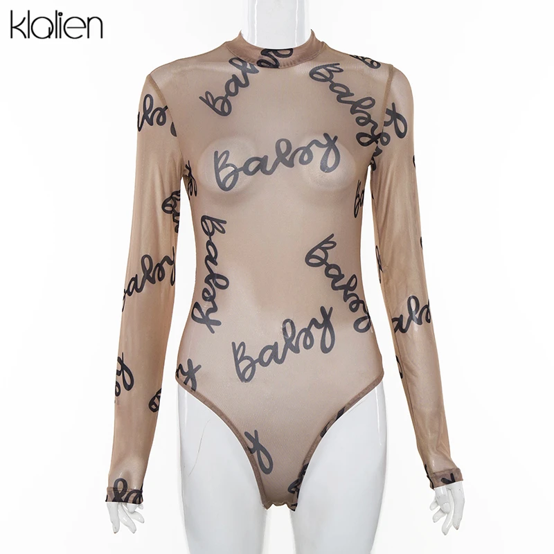 Znbbw 2023 Summer Sexy Letter Print Transparent Mesh Bodysuits Long Sleeve See Through Baby Bodycon Rompers Women Jumpsuits