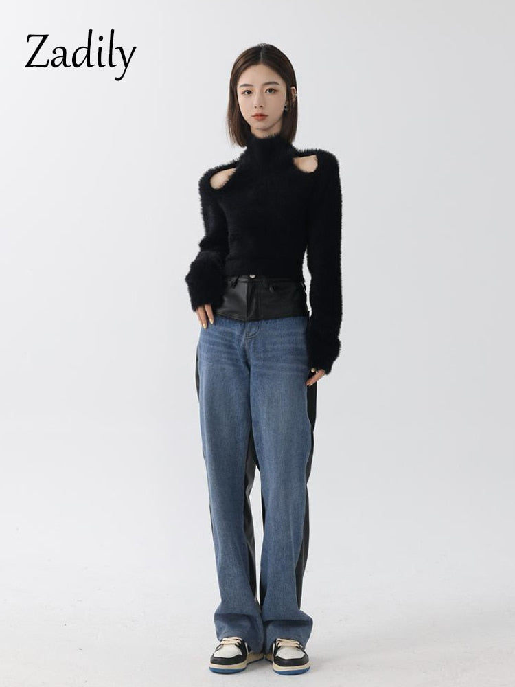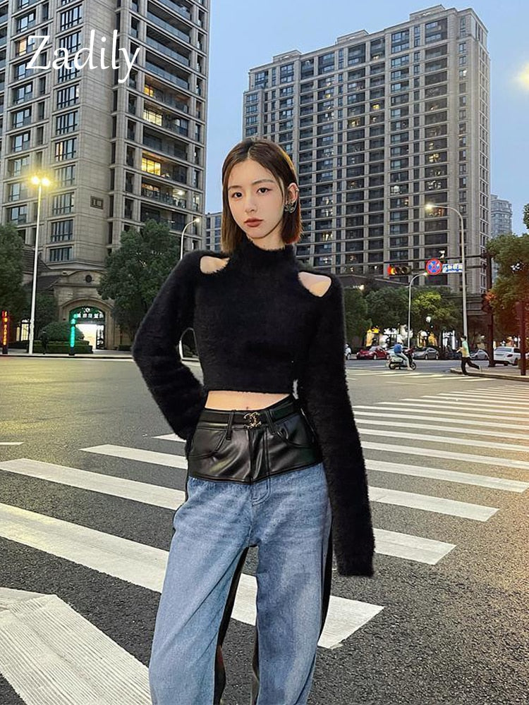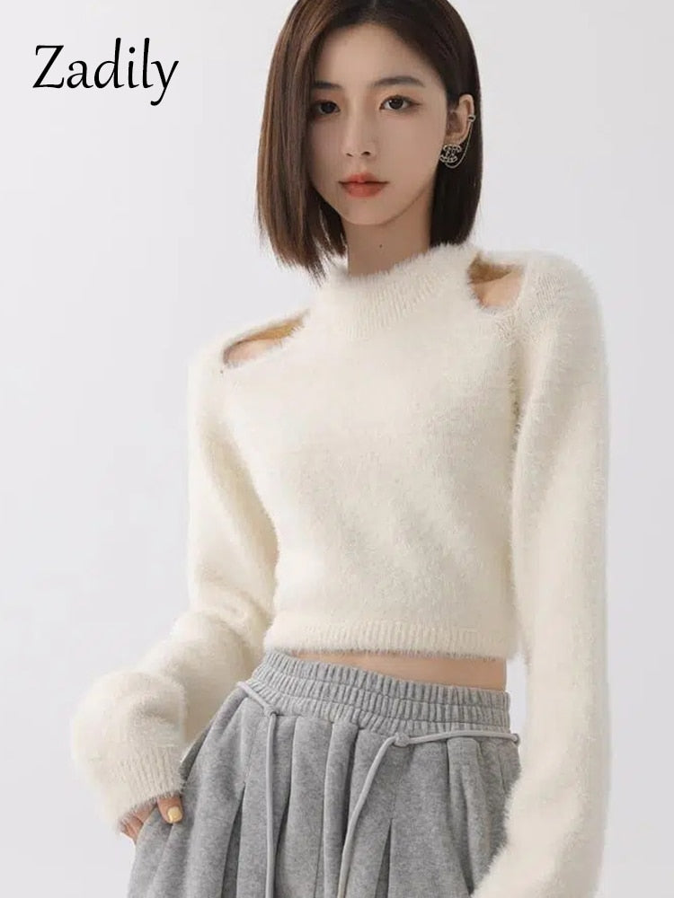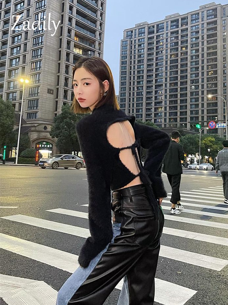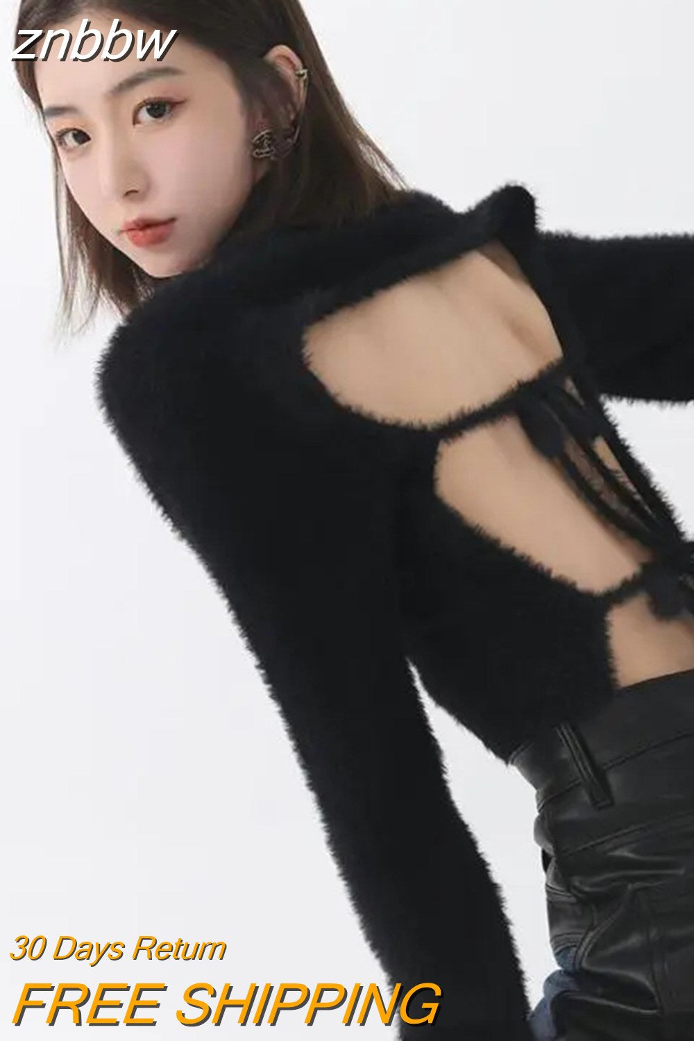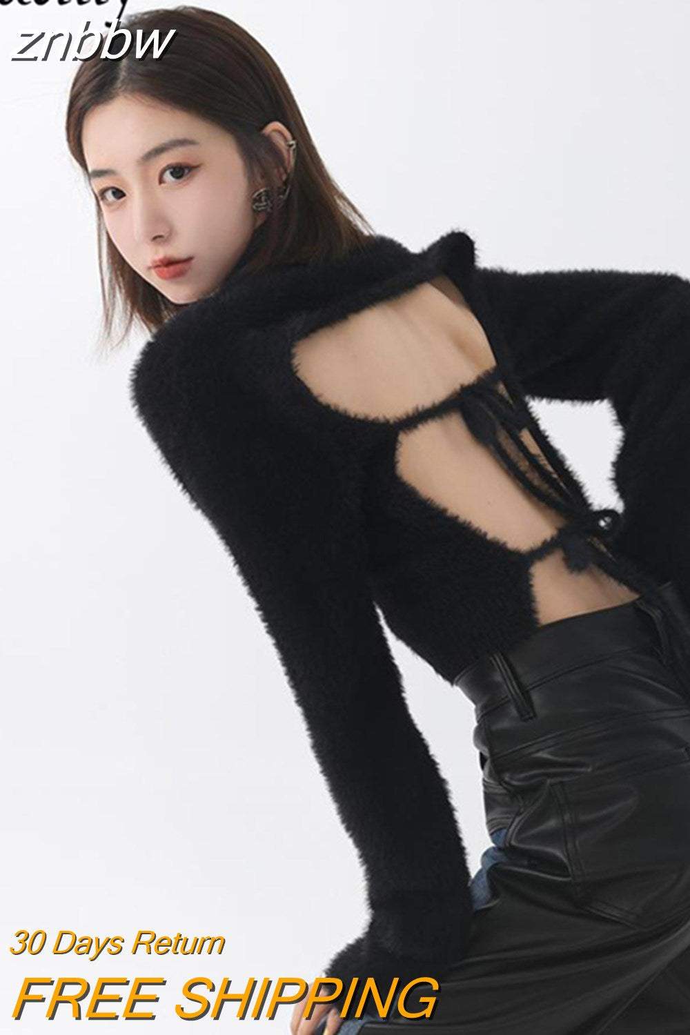 znbbw 2023 Winter Korean Style Slim Long Sleeve Mohair Sweater Women Sexy Backless Bandage Ladies Crop Top Fall Female Pullover