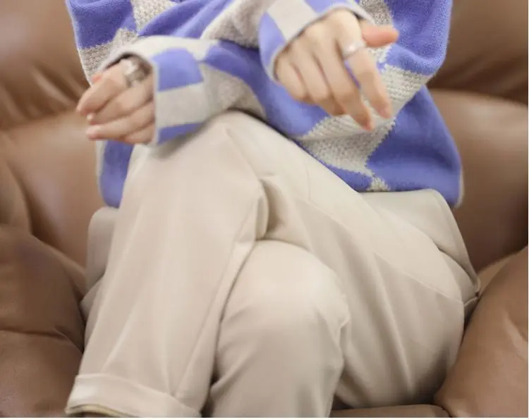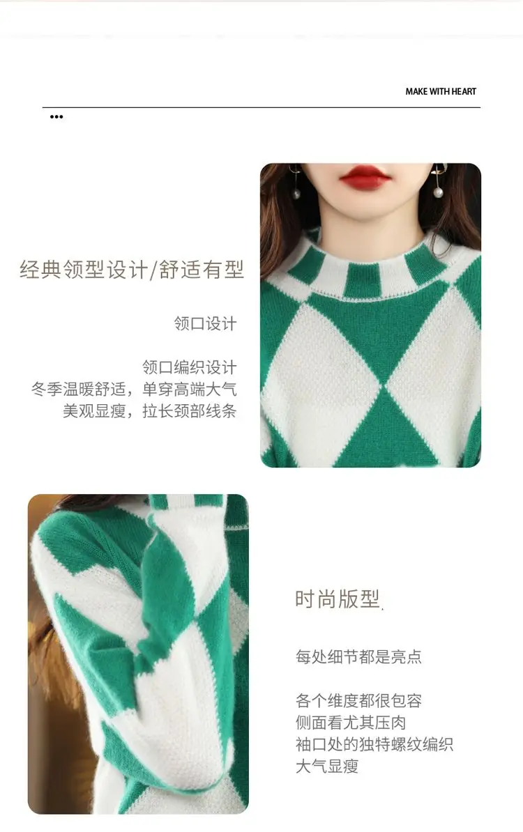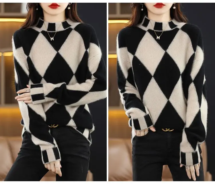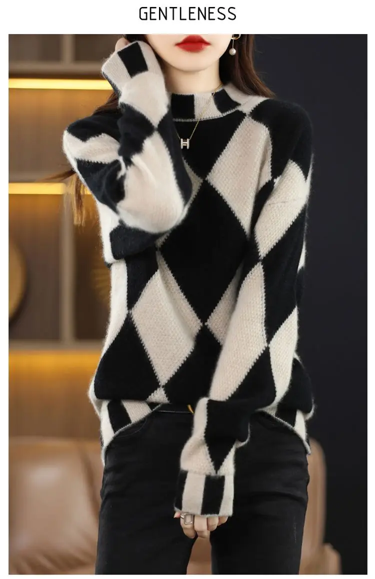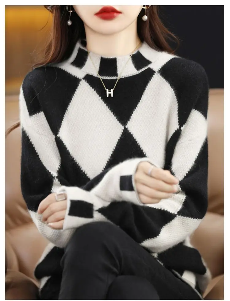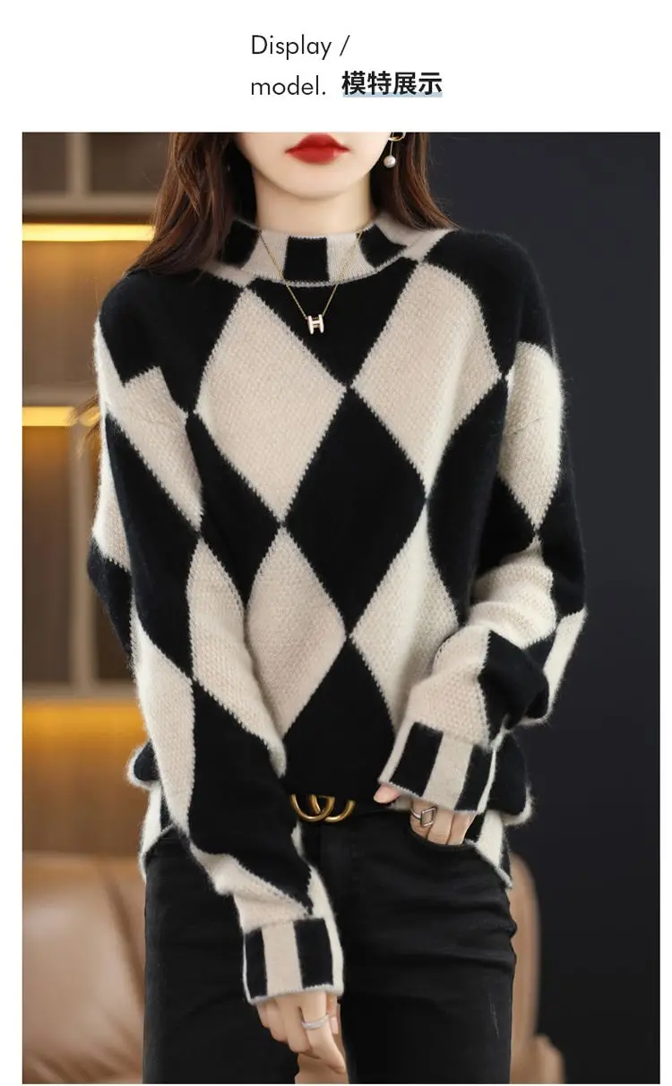 Znbbw 2024 color contrast diamond check sweater women half high neck sweater loose sweater knitting pullover female top