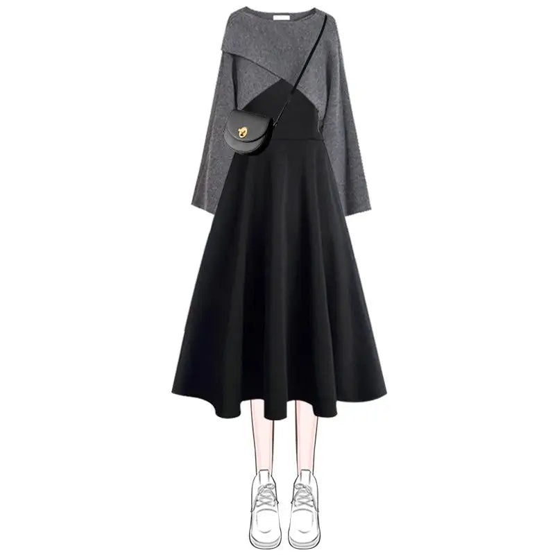 Znbbw Autumn 2023 New Large Size Cross Design Sweater Set Women's Slim Dress Two-piece Set Korean Matching Suit